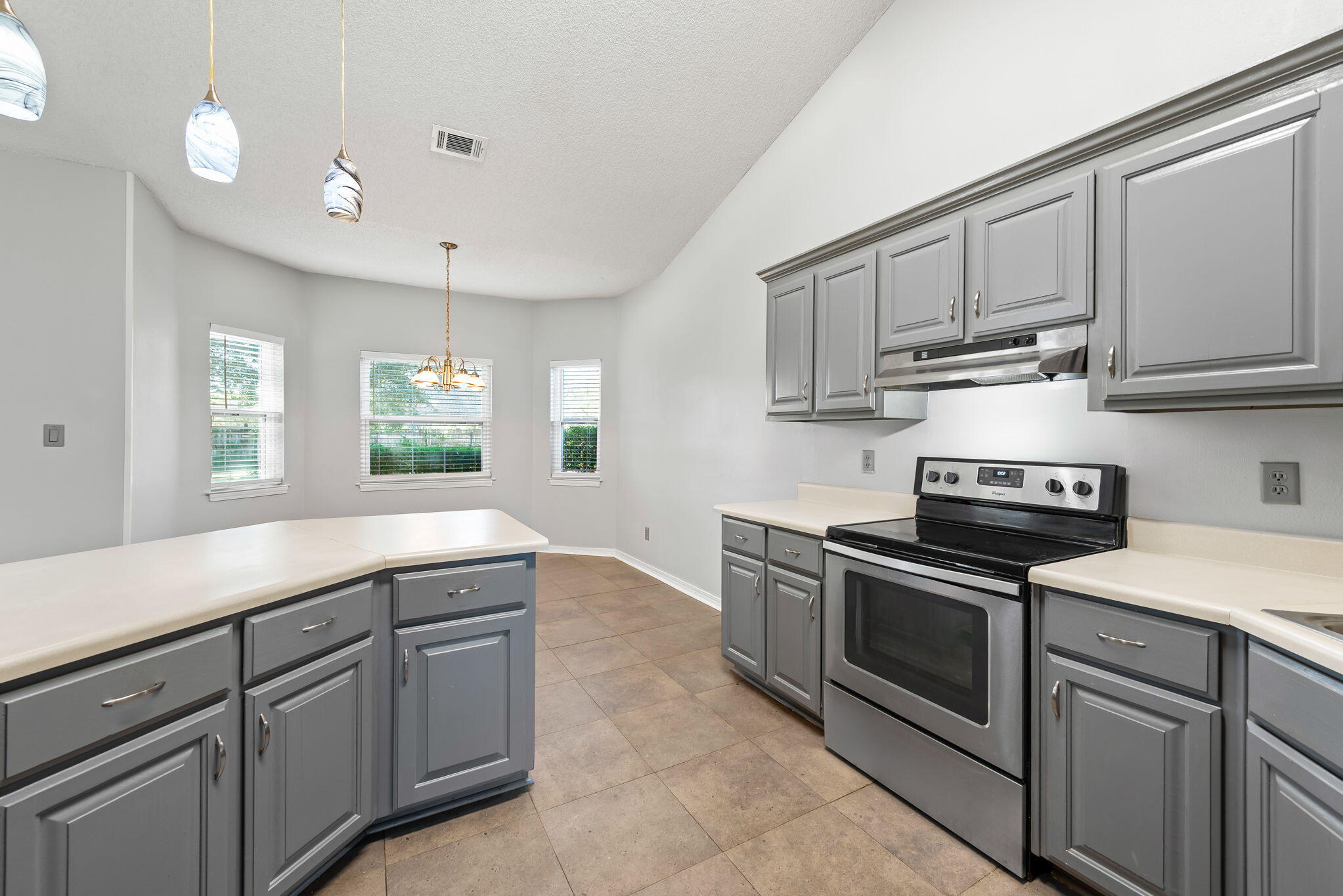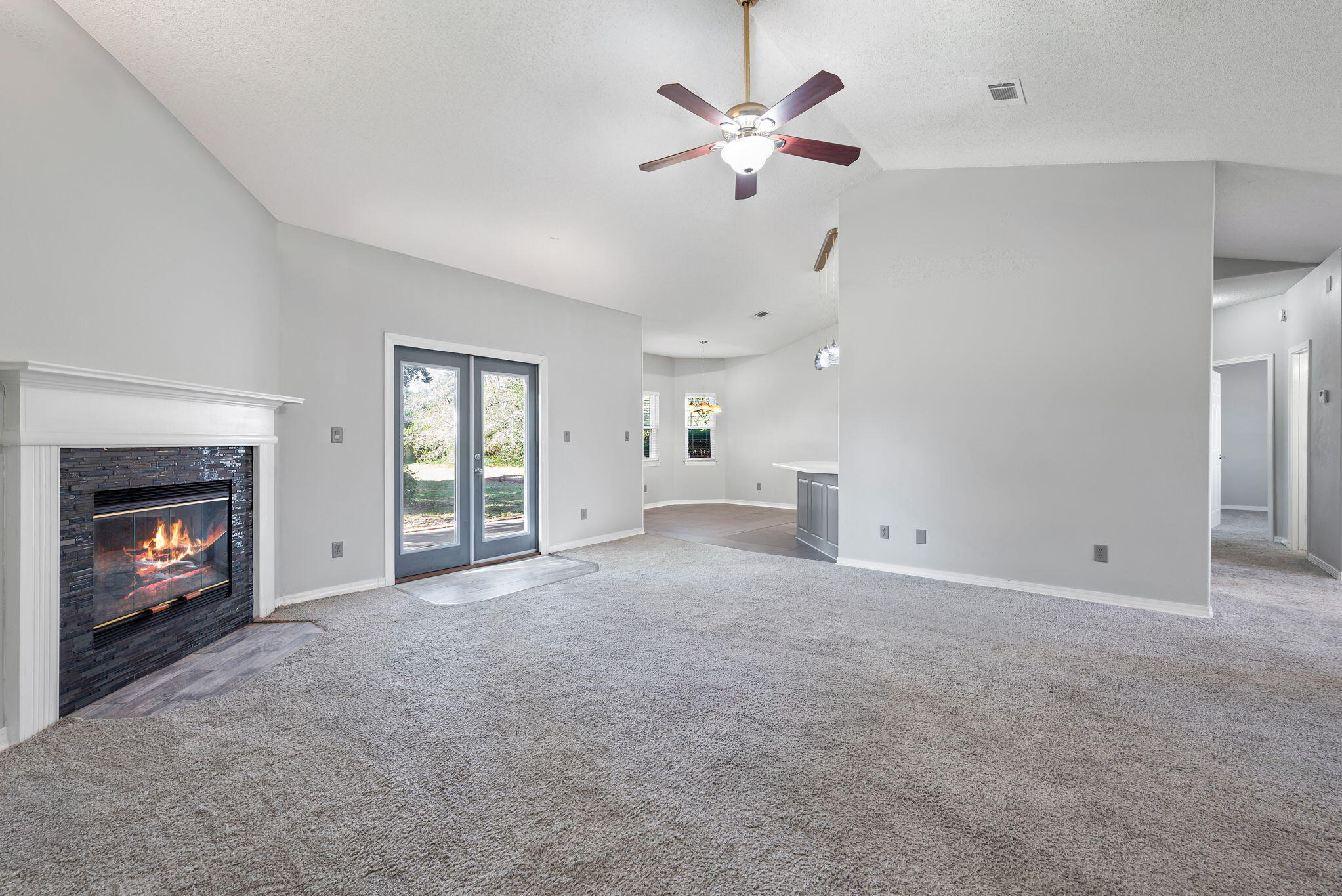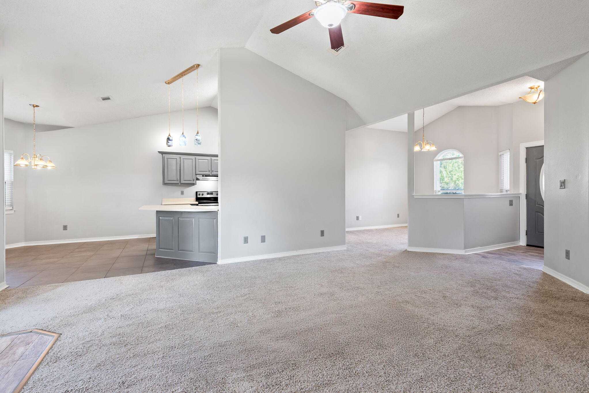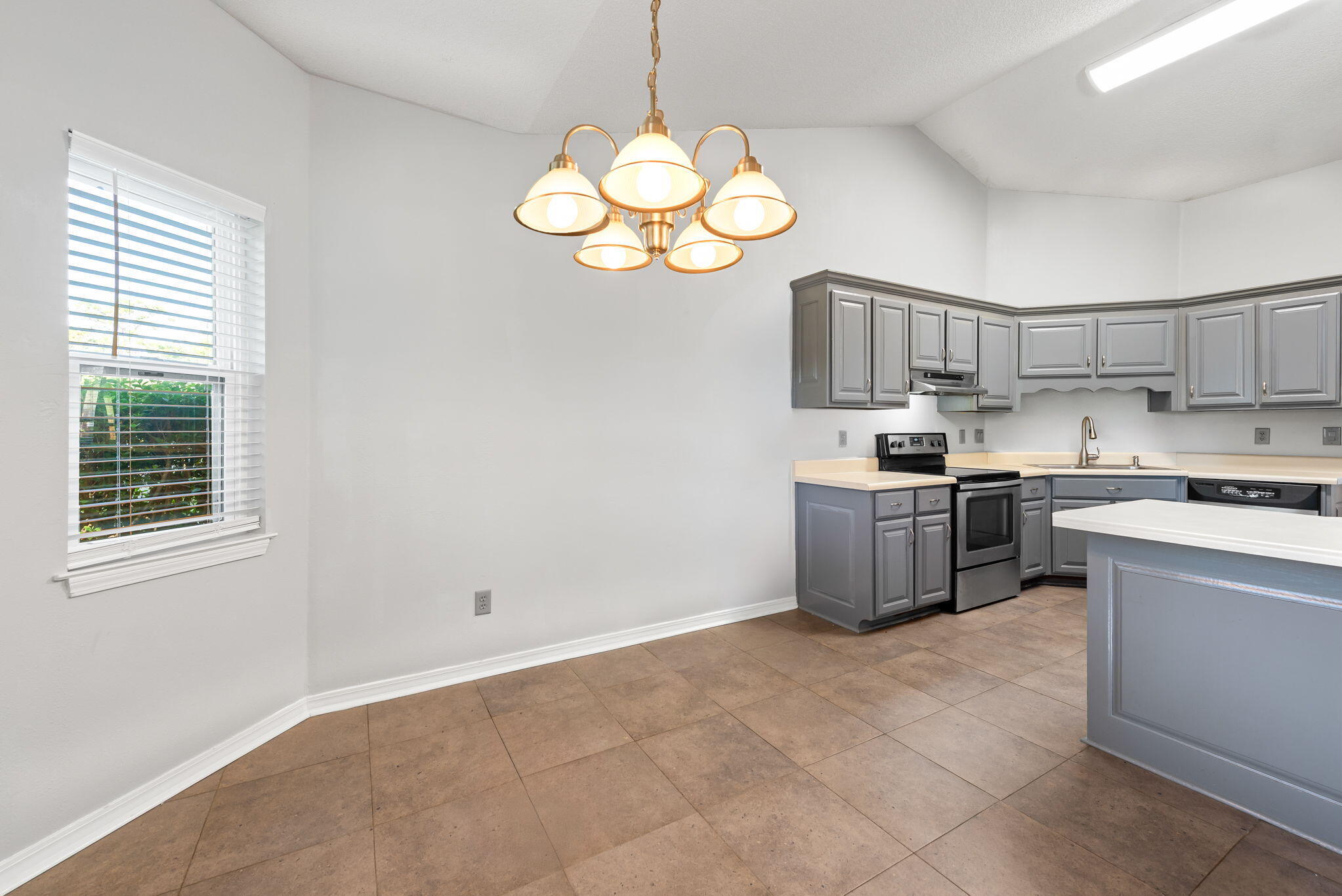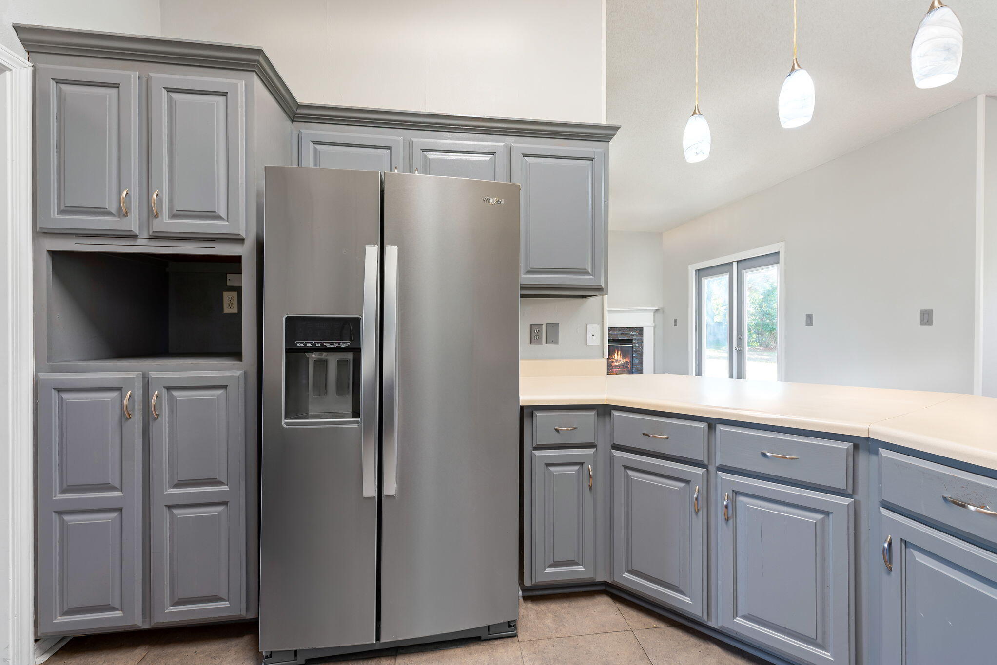 Welcome to your peaceful retreat in the heart of Navarre! This beautiful home sits on a spacious corner lot with a charming circle drive for added privacy and a side-entry garage with extended driveway. Step inside to soaring tall and vaulted ceilings and a large open floor plan perfect for entertaining or relaxing in comfort. The living area features a cozy fireplace accented with backsplash tile and opens through French doors to a beautifully shaded, fenced backyard filled with mature trees and palm accents your own tranquil outdoor haven. A formal dining room with a neutral gray palette and vaulted ceilings creates an elegant space for gatherings. The kitchen boasts stainless steel KitchenAid appliances, stylish gray repainted cabinets, a bay window overlooking the backyard, double double sink, pantry, gorgeous gray-and-white drop lighting, and tiled flooring that complements the home's fresh, airy design.