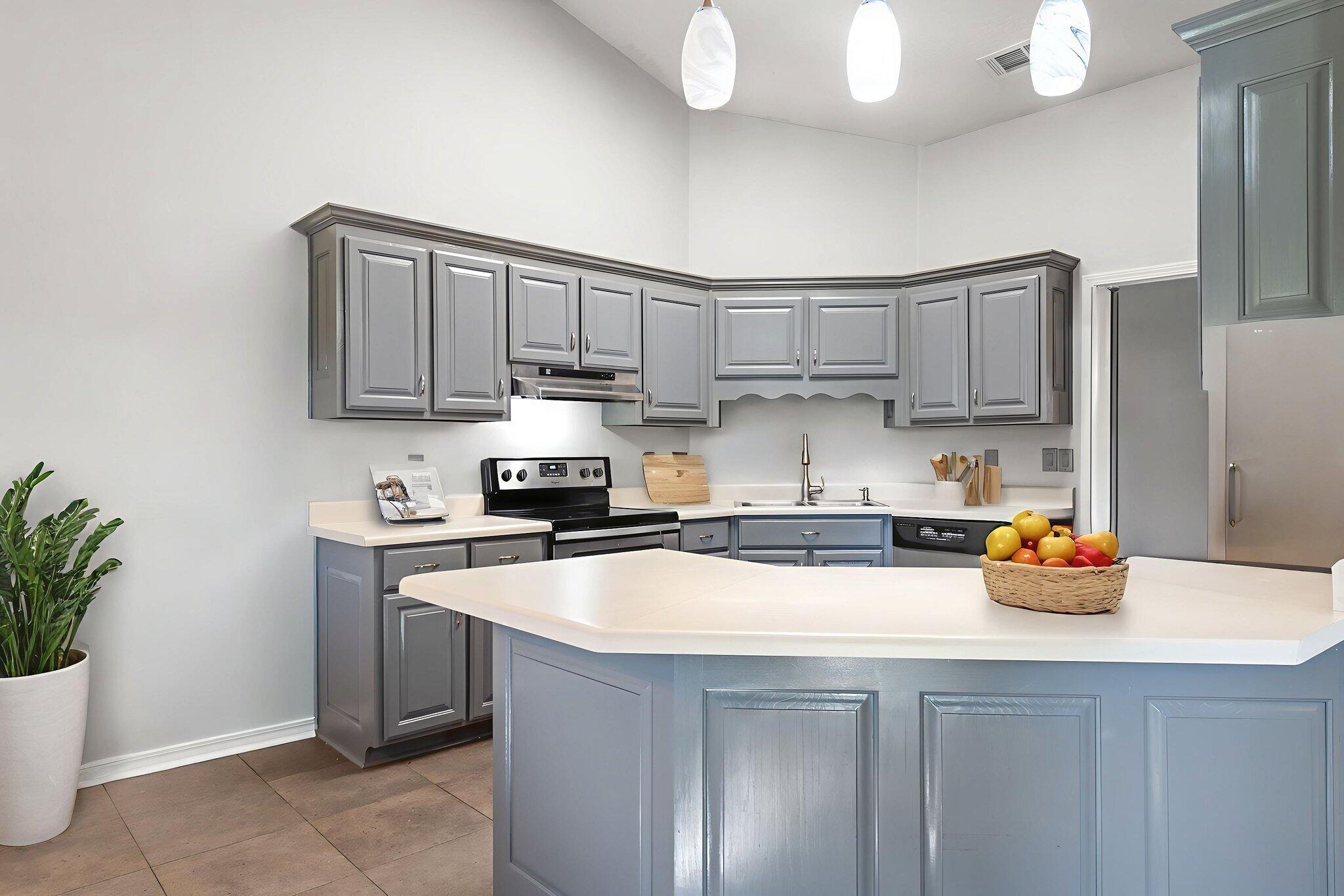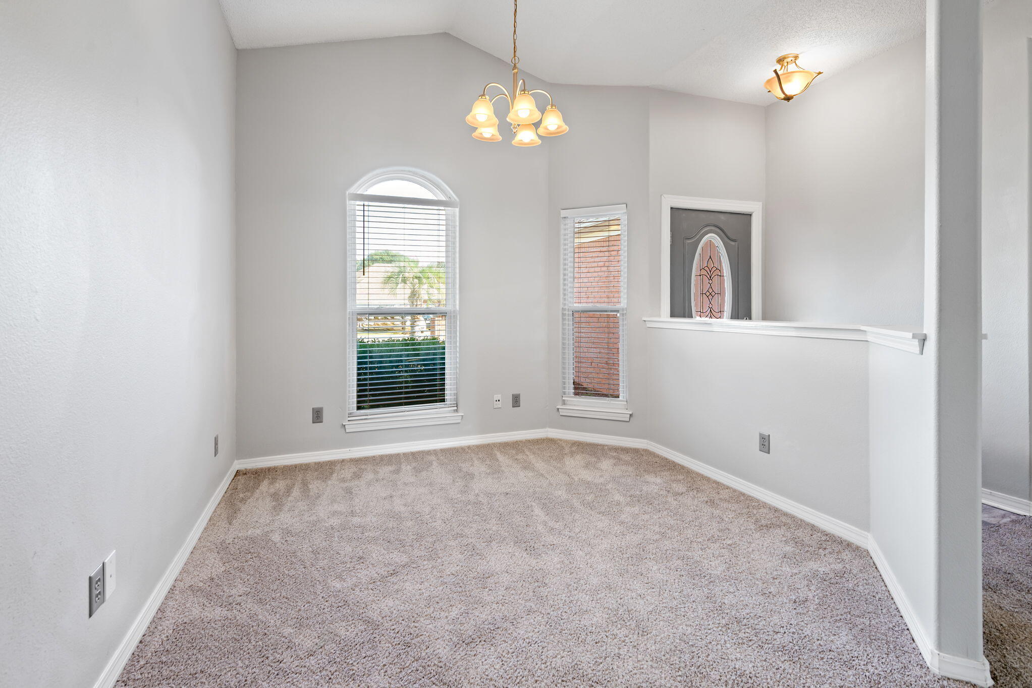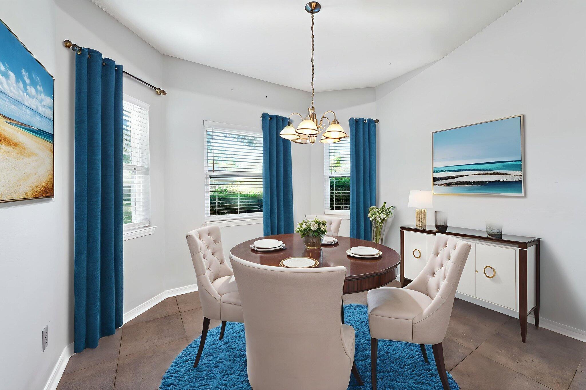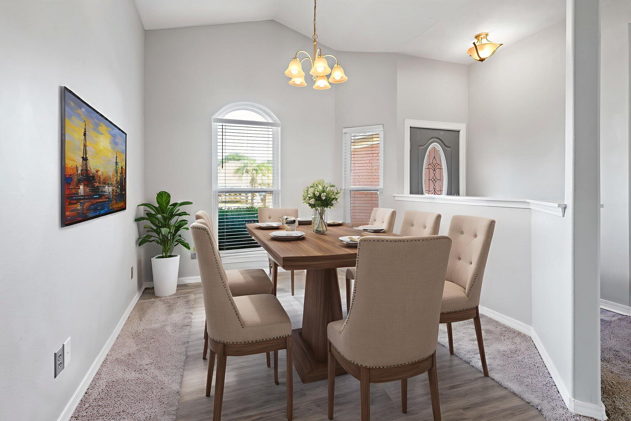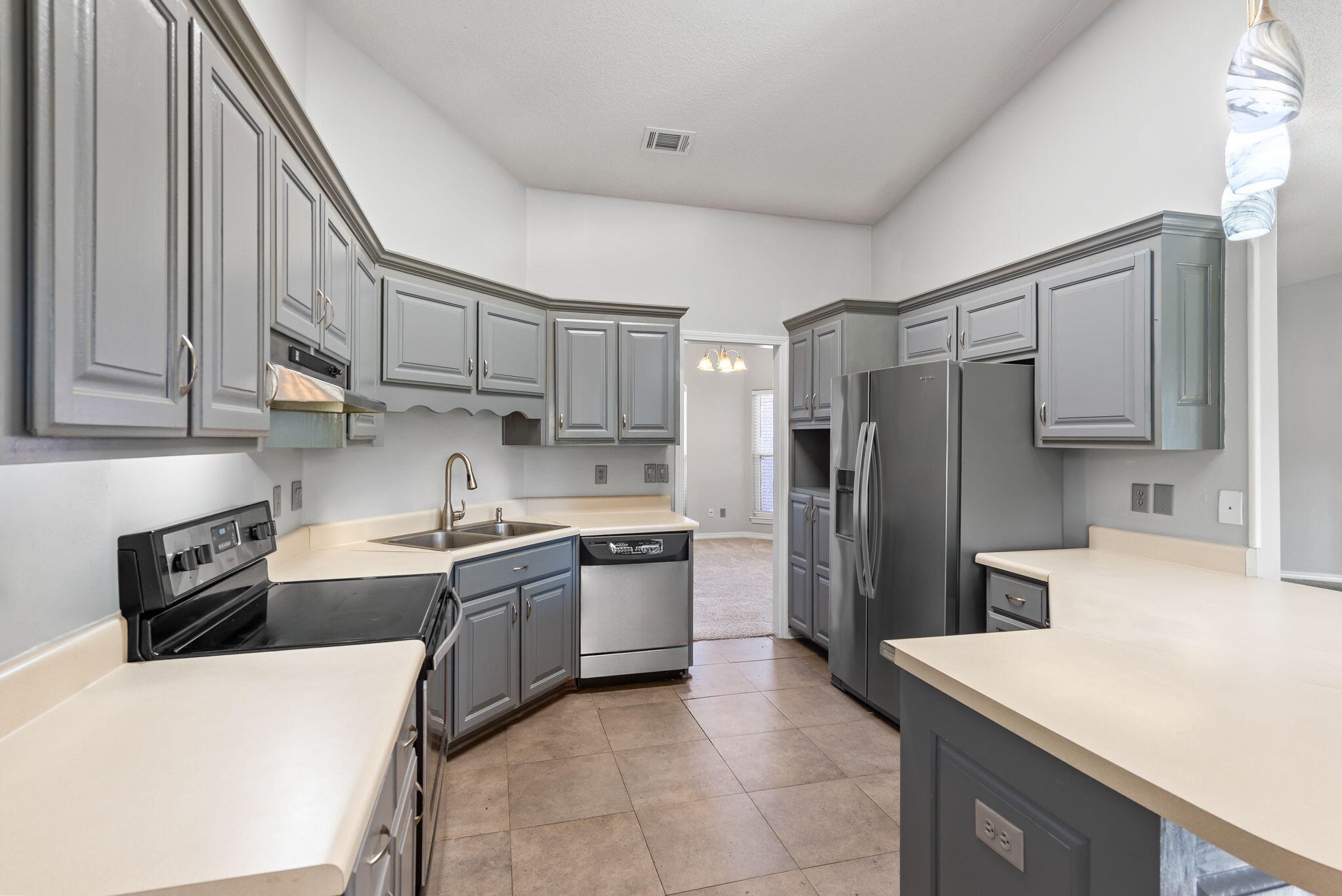 Welcome to your peaceful retreat in the heart of Navarre! This beautiful home sits on a spacious corner lot with a charming circle drive for added privacy and a side-entry garage with extended driveway. Step inside to soaring tall and vaulted ceilings and a large open floor plan perfect for entertaining or relaxing in comfort. The living area features a cozy fireplace accented with backsplash tile and opens through French doors to a beautifully shaded, fenced backyard filled with mature trees and palm accents your own tranquil outdoor haven. A formal dining room with a neutral gray palette and vaulted ceilings creates an elegant space for gatherings. The kitchen boasts stainless steel KitchenAid appliances, stylish gray repainted cabinets, a bay window overlooking the backyard, double double sink, pantry, gorgeous gray-and-white drop lighting, and tiled flooring that complements the home's fresh, airy design.