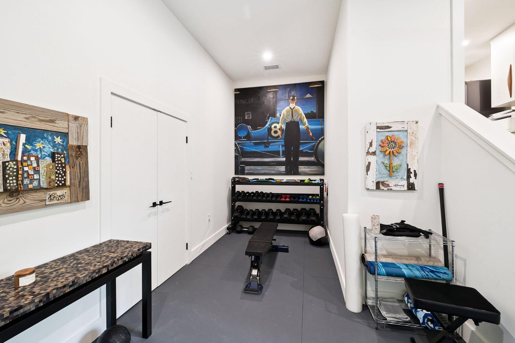 Located on the first level, the primary suite offers a spa-inspired escape, complete with a concrete soaking tub and multi-head custom shower, dual custom walnut vanities, a walk-in closet, water views and direct access to the waterfront porch. Two additional bedrooms with a shared full bathroom are conveniently located on the first floor. A second-story private guest suite offers a quiet haven with its own ensuite bath, walk-in closet and a private balcony overlooking the bayideal for guests seeking solitude and water views. Across the home, an additional second-level features another guest suite with ensuite bath, plus a dedicated wellness retreat. This calming space includes a wet bar, massage table, cork flooring, a Sunlighten infrared sauna and plumbing for a future cold plunge, all oriented toward peaceful water vistascreating a spa-like sanctuary within the home. A dedicated gym space and laundry room lead to an oversized garage including an EV-ready 220 plug, built-in pressure washer for convenient vehicle washing and storage.