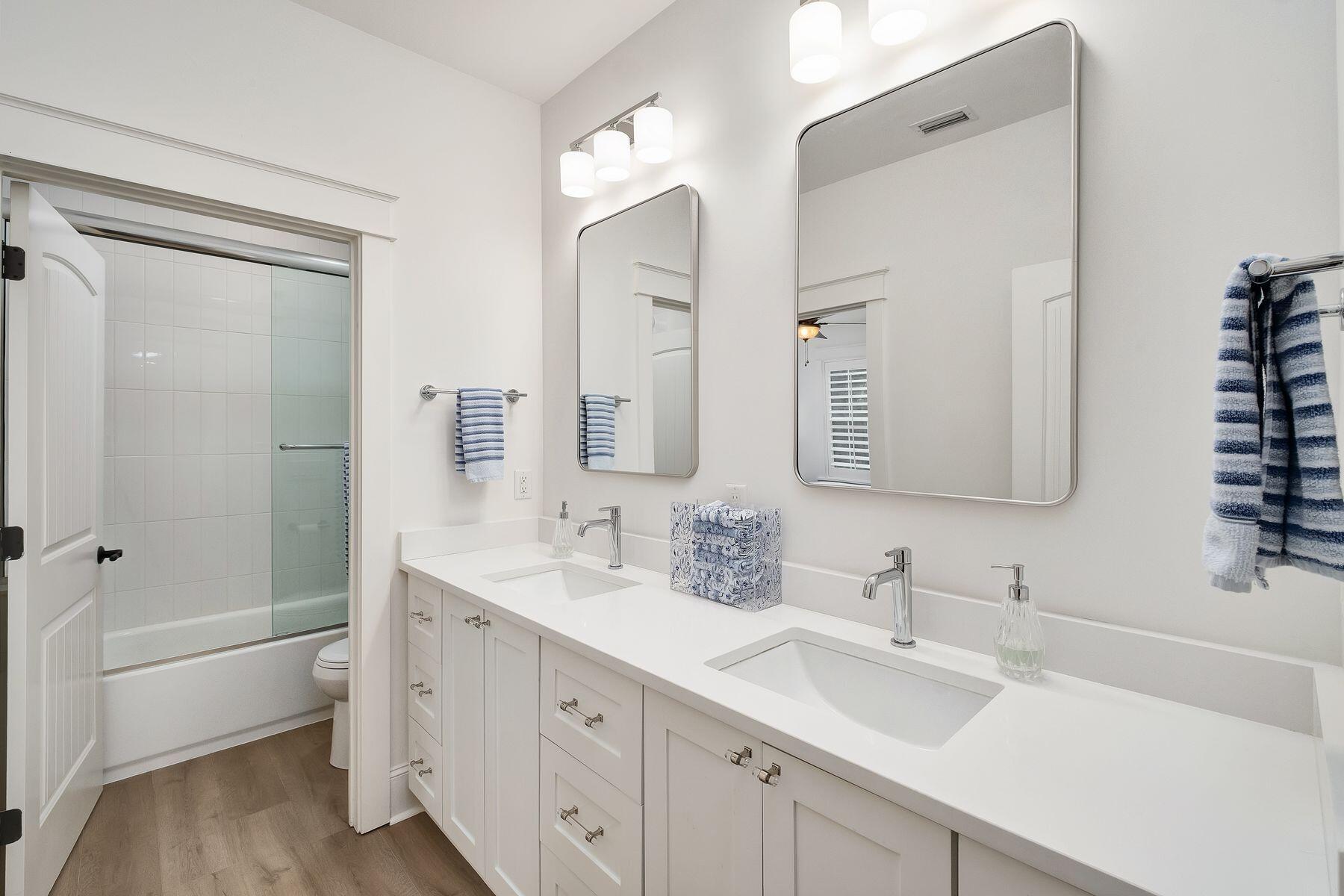 Step inside this recently renovated Botany Bayou home and be welcomed by a dramatic two-story foyer with soaring 20-foot ceilings, an open staircase, and a light-filled living area accented by a striking brick feature wall. The open floor plan is designed for gathering, with the upstairs hallway overlooking the main living space to create a warm and connected feel. A bright formal dining room fills with natural light and provides the perfect setting for family dinners or entertaining guests.The living room opens seamlessly to a large kitchen--the true heart of the home--with a breakfast bar, center island, abundant cabinetry, and a generous walk-in pantry, creating both warmth and functionality for everyday living. The large primary suite on the main level is a private retreat with a newly renovated bath featuring dual vanities, a soaking tub, and a separate shower. Also on the first floor, a second bedroom with its own updated en-suite bath provides comfort and privacy for family or guests.