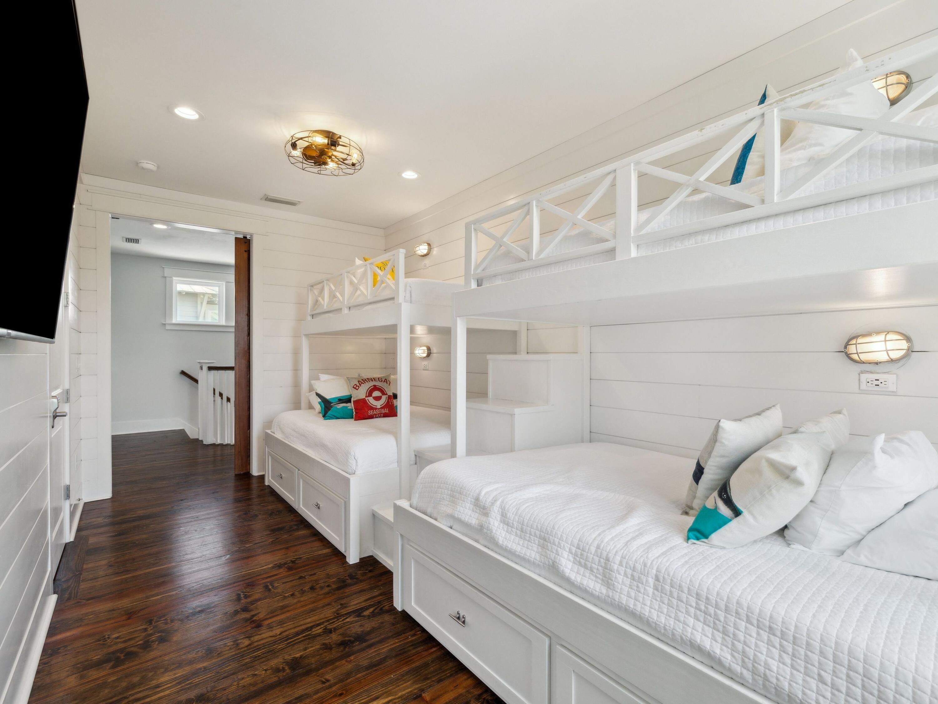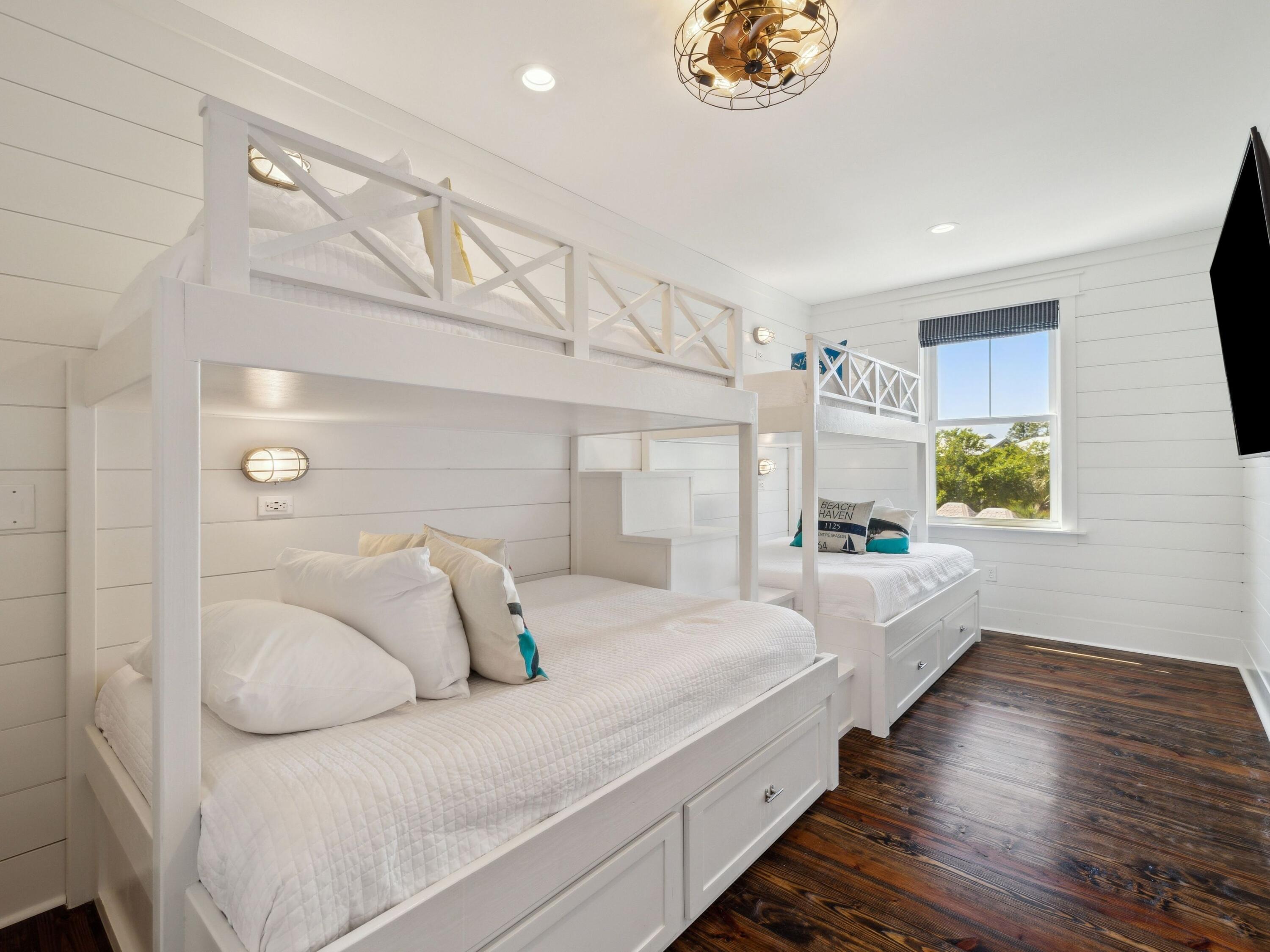 Welcome to 859 Sandgrass Blvd -- a fully furnished and beautifully updated 5-bedroom home in the sought-after community of NatureWalk at Seagrove. Ideally located just steps from the pool, playground, and nature trails, this move-in-ready home blends style, space, and convenience -- with room to add a private pool.The open main level features a renovated kitchen with quartz countertops and new appliances, a custom tile fireplace, new lighting, and French doors leading to a covered porch and fenced backyard with direct access to the community pool. Downstairs offers a guest suite and custom-built bunk room, while upstairs includes three guest rooms and a spacious primary suite with a private balcony and spa-like bath.