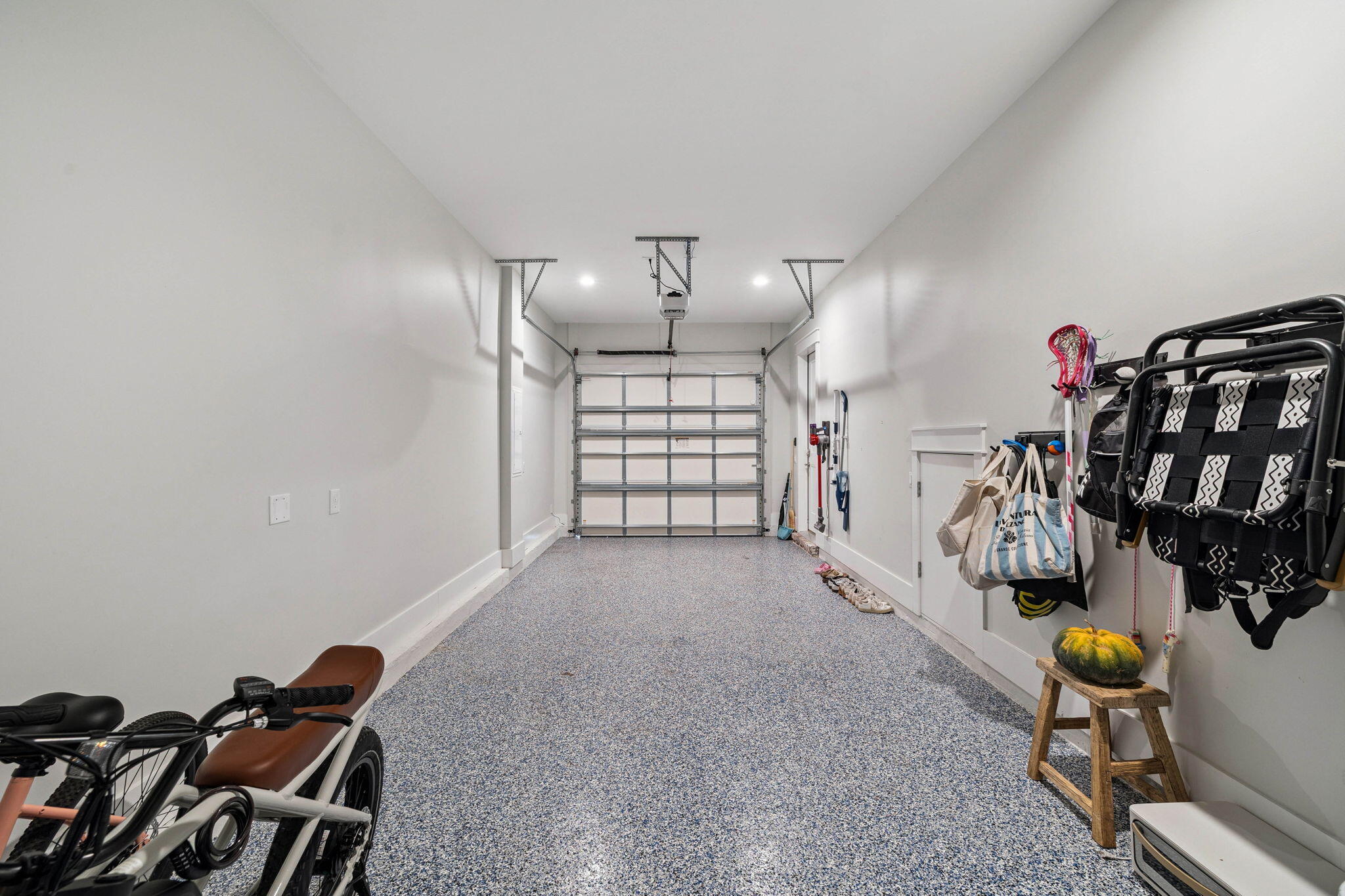 The garage is both functional and polished, featuring epoxy flooring and built-in shelving for added storage and organization.