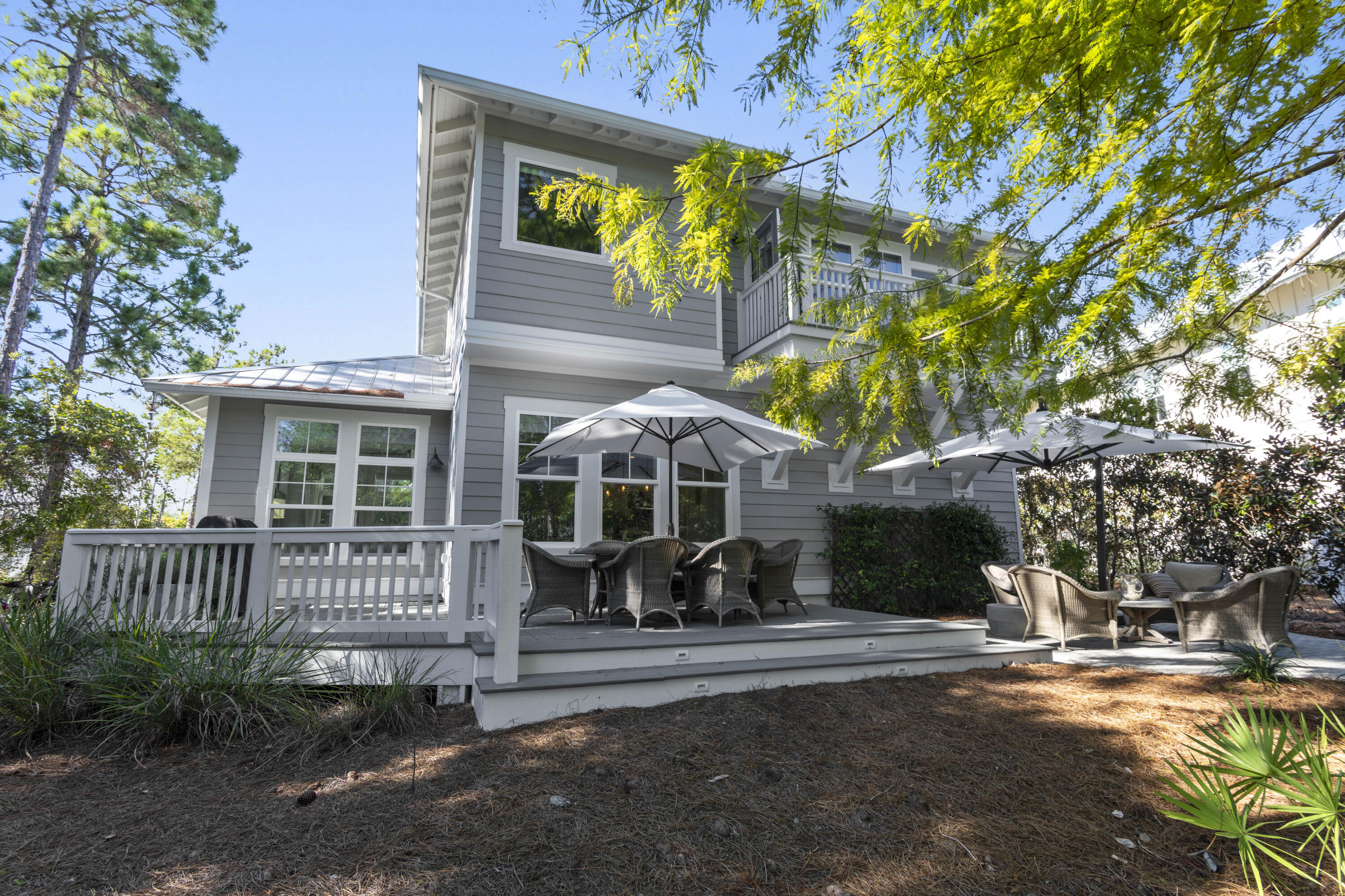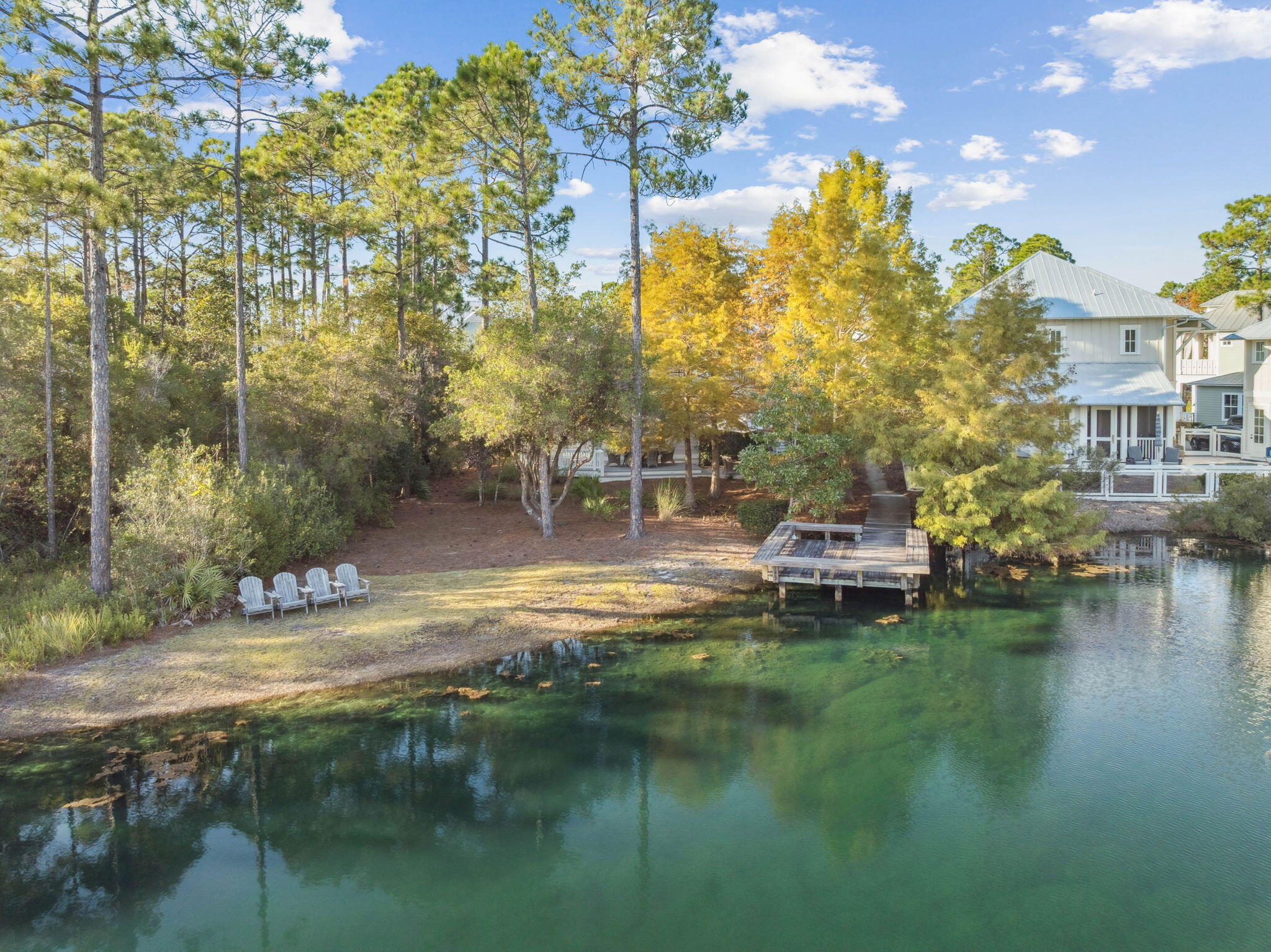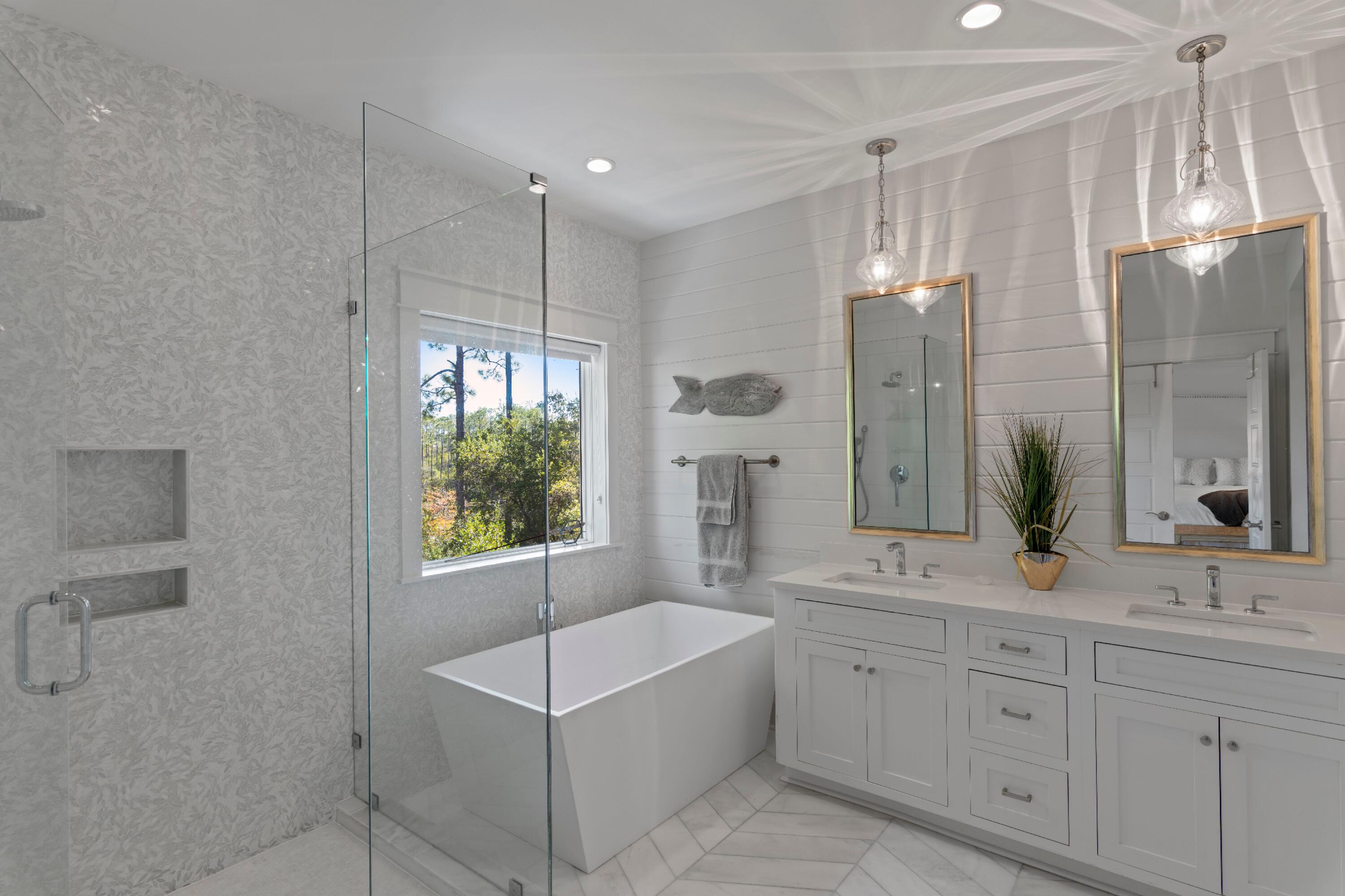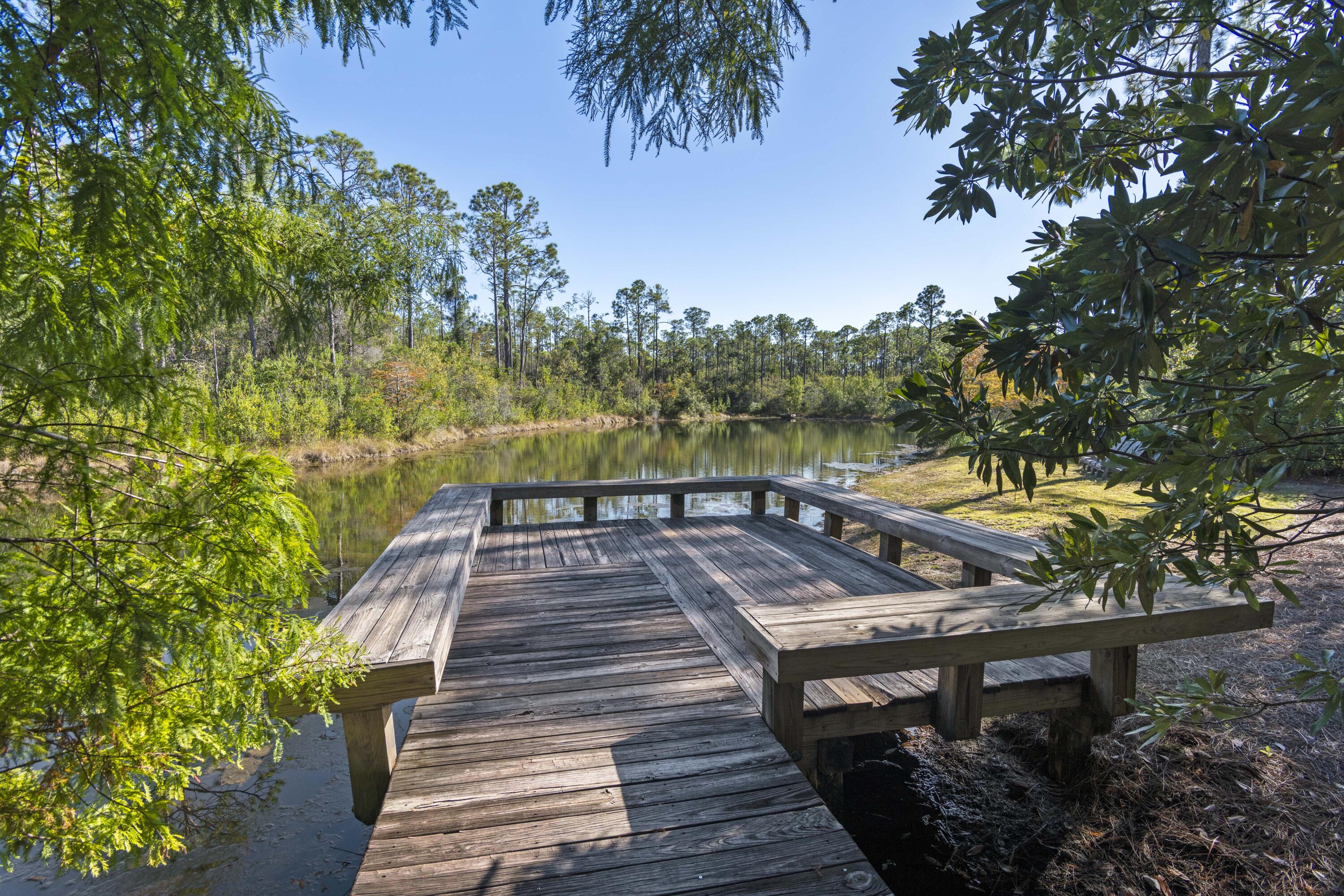 This Watercolor home is in the Cedar Woods area in Phase 4. The house features 4 bedrooms, 4.5 bathrooms, a bunk room, and a carport with three additional parking spaces.Aptly named On Golden Pond, the home is situated on of the prettiest lots in Watercolor, featuring a retention pond in the backyard and designated preserve areas on two sides of the house, which offer beautiful views and privacy. It is within easy walking distance to the Dragonfly pool, Publix and Seaside,along with all Watercolor amenities, including the WC Beach Club, tennis, and pickleball courts, nature trails, and private beach access. The first floor features a primary bedroom with an en-suite bathroom, storage space under the stairs, a walk-in pantry adjacent to the kitchen, and enclosed outdoor storage, as well as a powder bath. The laundry room has been updated to include a bar area with built-in cabinetry, an ice maker, and a Kitchen Aid beverage fridge. The kitchen has been updated with designer tile and quartz countertops.