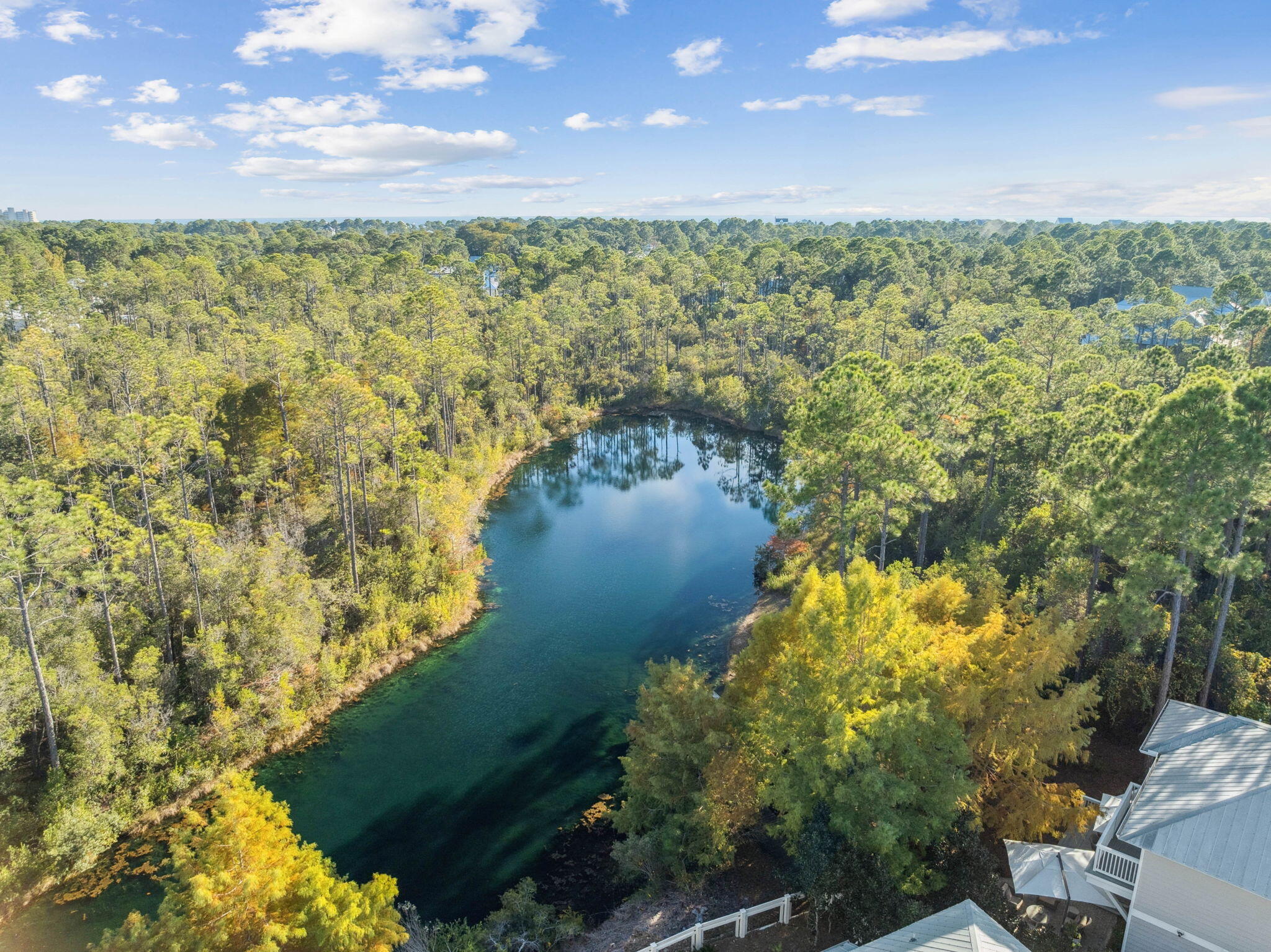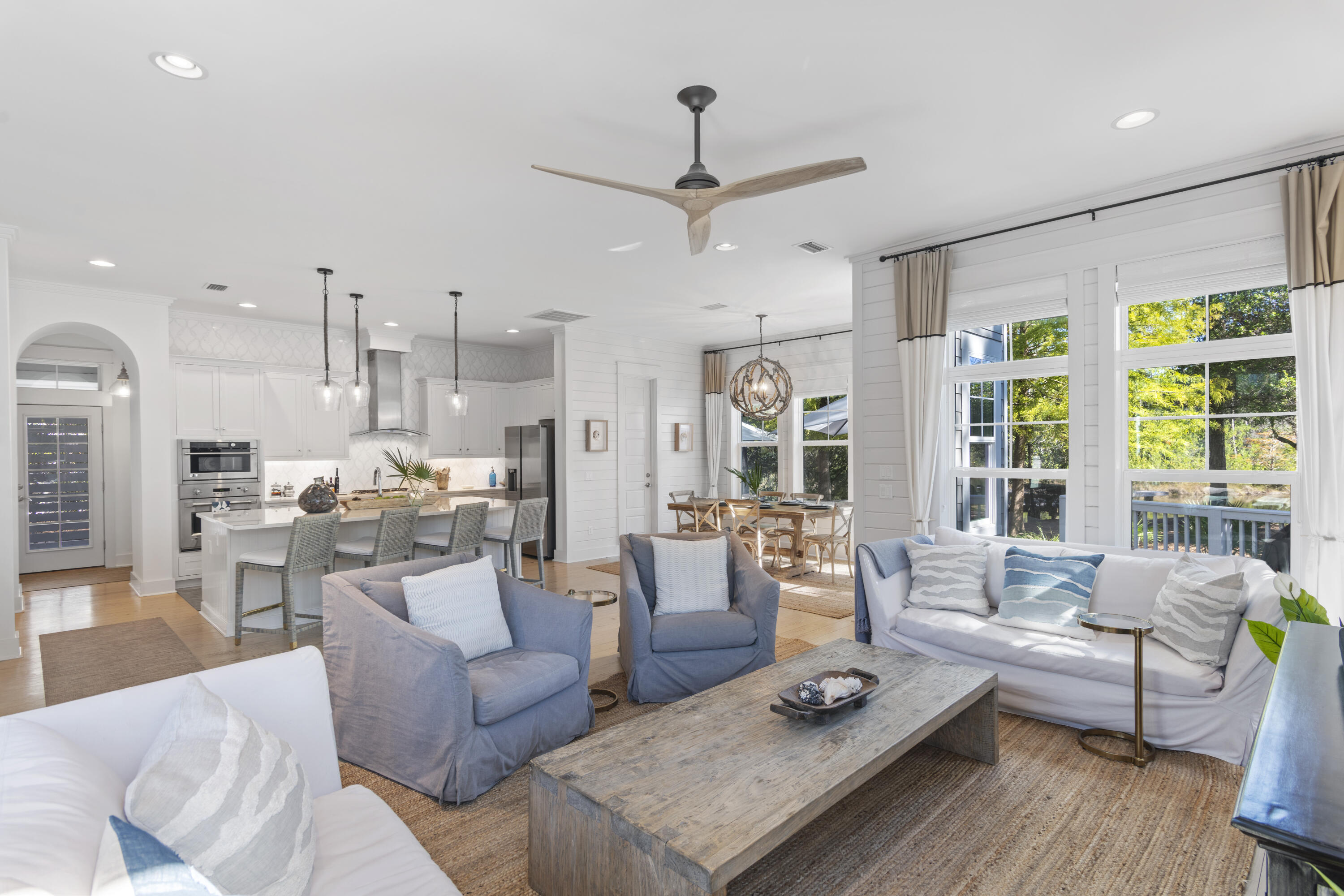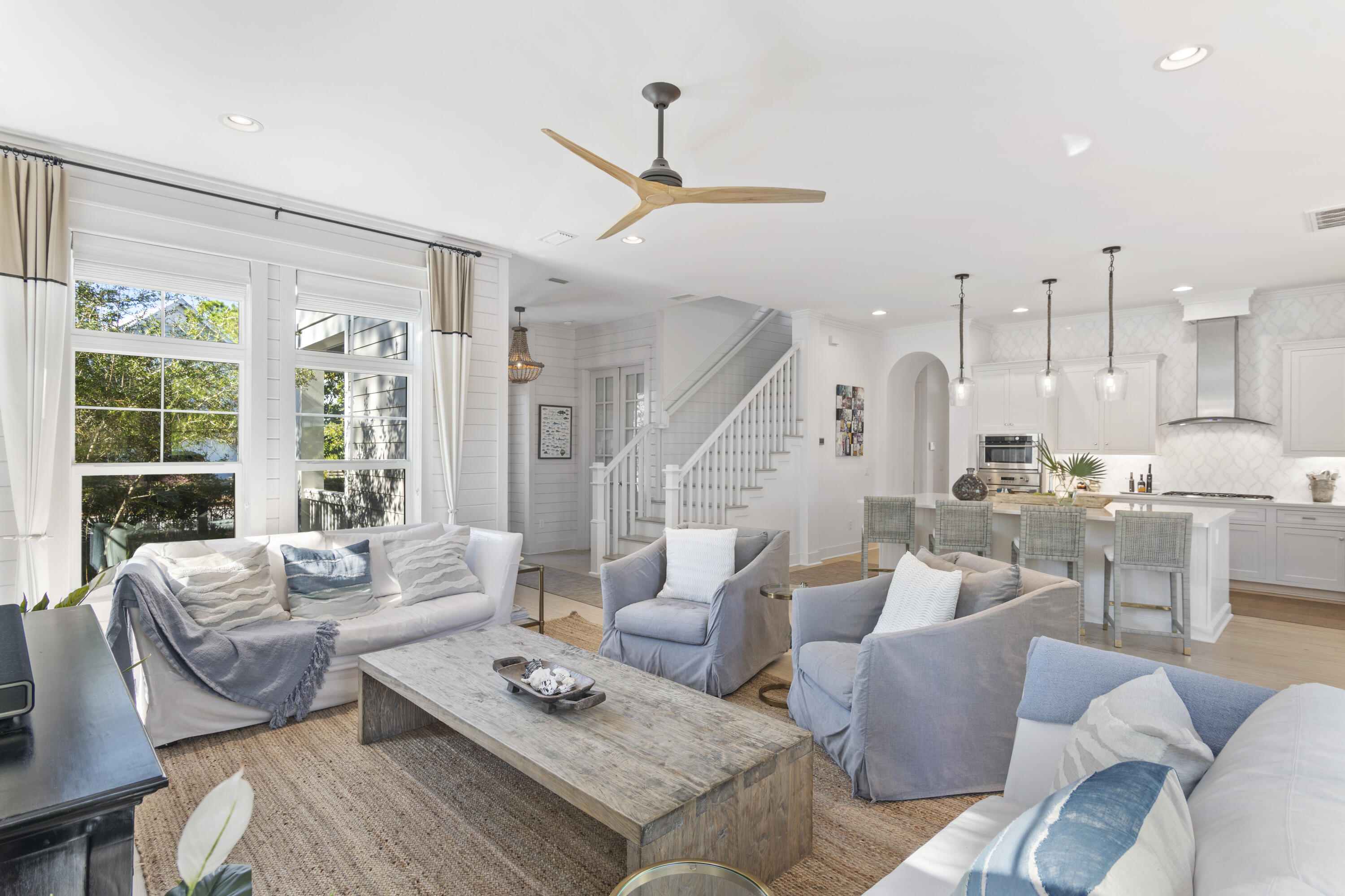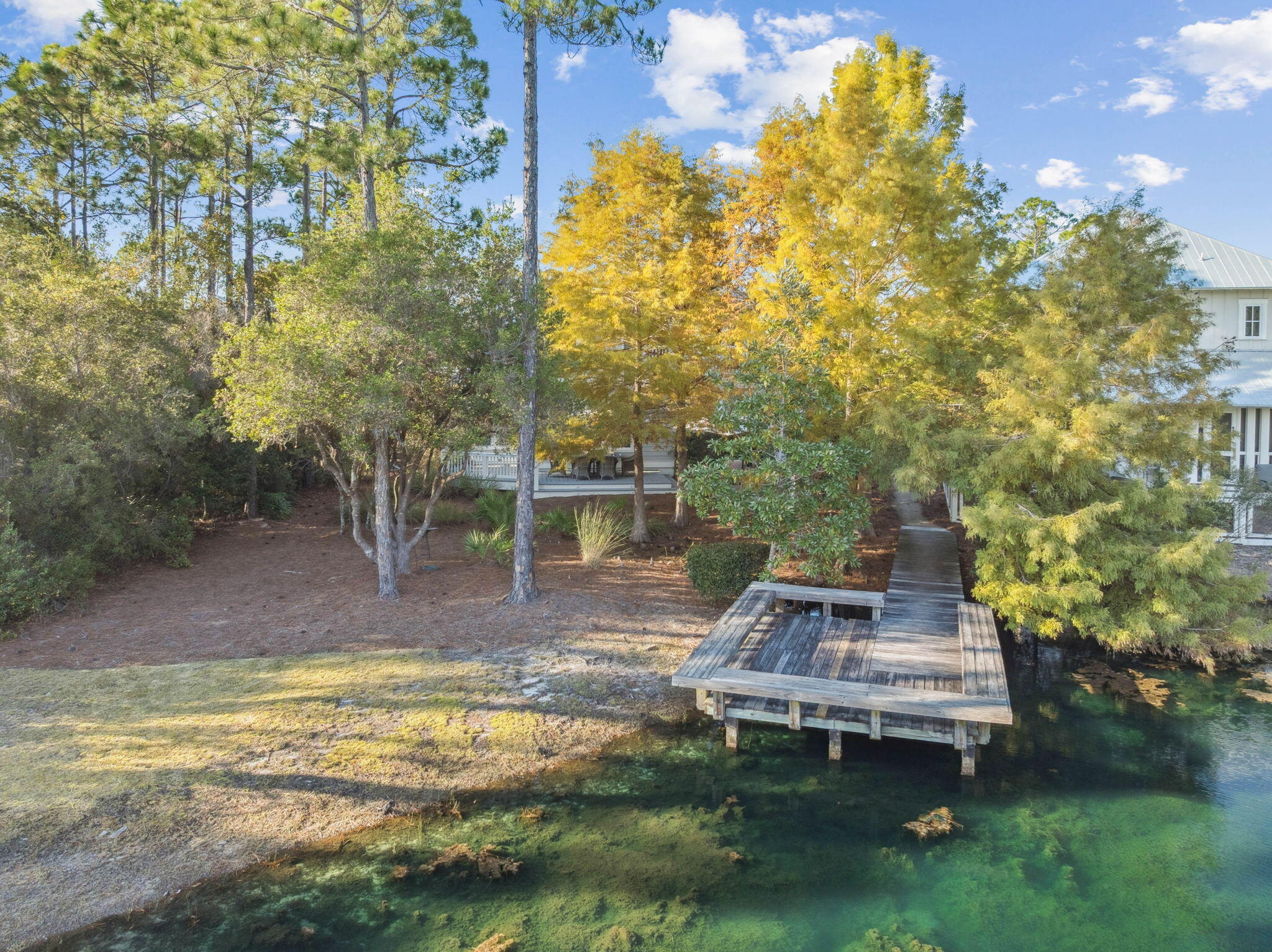 This Watercolor home is in the Cedar Woods area in Phase 4. The house features 4 bedrooms, 4.5 bathrooms, a bunk room, and a carport with three additional parking spaces.Aptly named On Golden Pond, the home is situated on of the prettiest lots in Watercolor, featuring a retention pond in the backyard and designated preserve areas on two sides of the house, which offer beautiful views and privacy. It is within easy walking distance to the Dragonfly pool, Publix and Seaside,along with all Watercolor amenities, including the WC Beach Club, tennis, and pickleball courts, nature trails, and private beach access. The first floor features a primary bedroom with an en-suite bathroom, storage space under the stairs, a walk-in pantry adjacent to the kitchen, and enclosed outdoor storage, as well as a powder bath. The laundry room has been updated to include a bar area with built-in cabinetry, an ice maker, and a Kitchen Aid beverage fridge. The kitchen has been updated with designer tile and quartz countertops.