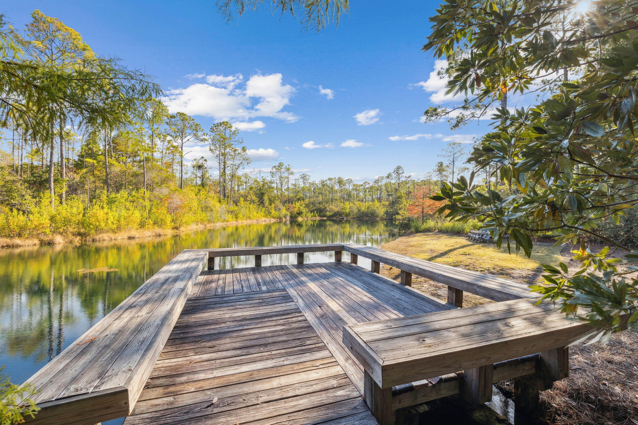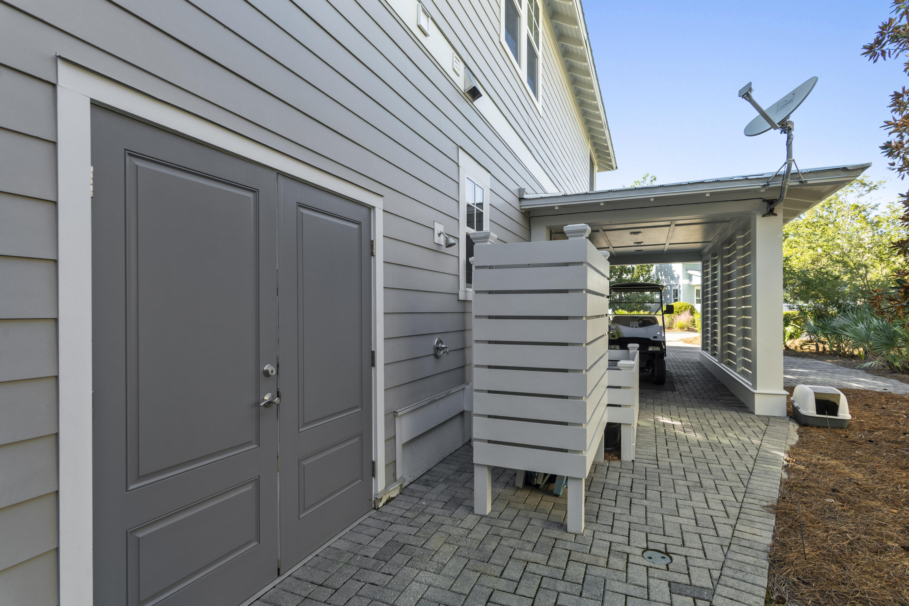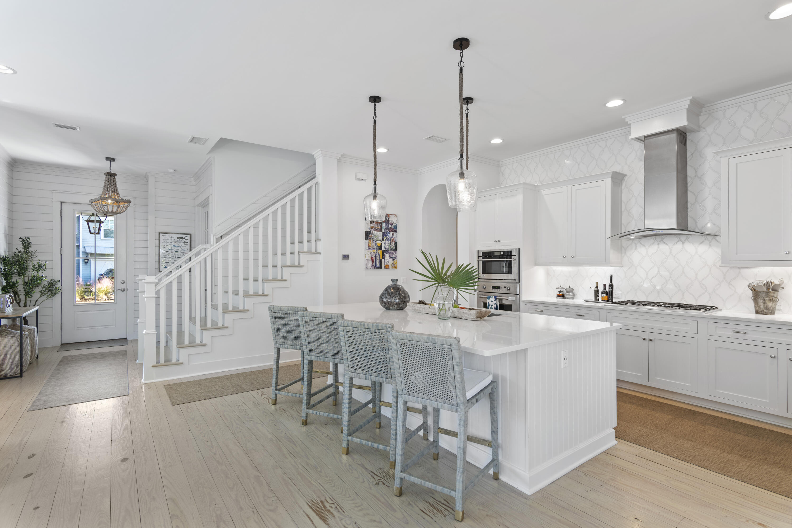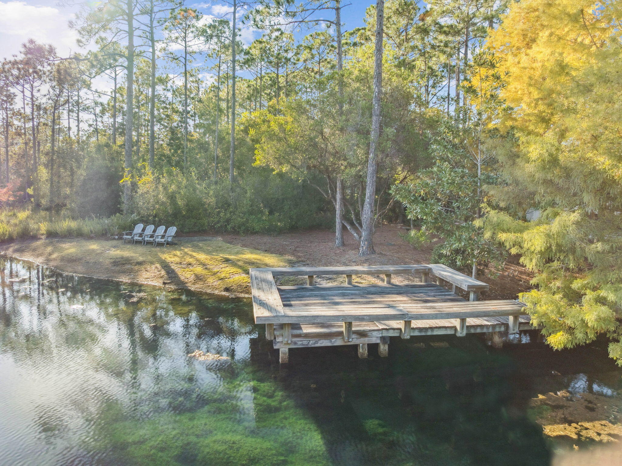 This Watercolor home is in the Cedar Woods area in Phase 4. The house features 4 bedrooms, 4.5 bathrooms, a bunk room, and a carport with three additional parking spaces.Aptly named On Golden Pond, the home is situated on of the prettiest lots in Watercolor, featuring a retention pond in the backyard and designated preserve areas on two sides of the house, which offer beautiful views and privacy. It is within easy walking distance to the Dragonfly pool, Publix and Seaside,along with all Watercolor amenities, including the WC Beach Club, tennis, and pickleball courts, nature trails, and private beach access. The first floor features a primary bedroom with an en-suite bathroom, storage space under the stairs, a walk-in pantry adjacent to the kitchen, and enclosed outdoor storage, as well as a powder bath. The laundry room has been updated to include a bar area with built-in cabinetry, an ice maker, and a Kitchen Aid beverage fridge. The kitchen has been updated with designer tile and quartz countertops.