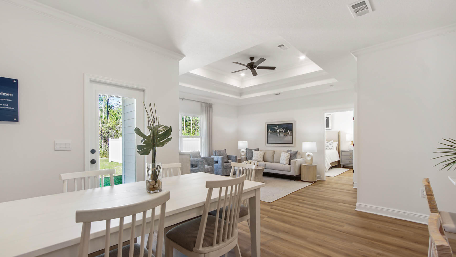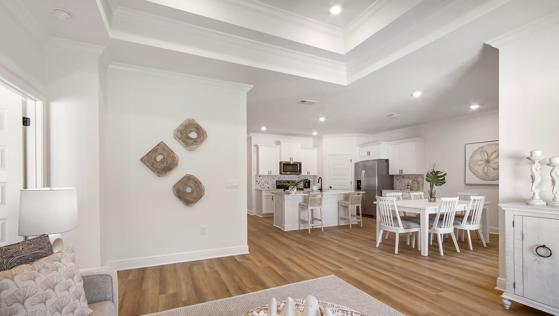 Welcome to 14 Nellie Preserve Lane located in the quaint neighborhood at Nellie Preserve in Santa Rosa Beach. Step inside this home to a well-lit entry hall that sets the stage for the home's warm and welcoming atmosphere. EVP flooring unites the living spaces in an effortless flow. This home has three bedrooms off the front hall and they share a full bathroom. This is a model home and sales center. It is being sold As Is and furnishings and window treatments including draperies will not convey. All window hardware will remain. Appliances currently in the home will convey, and the warranty will be for the time remaining on each item. The sales center will be converted to the original space as shown on the floor plan. The heart of this beautiful home is the kitchen. It serves as the central focal spot with its center island that holds a single basin sink and a dishwasher. It has been appointed with elegant quartz countertops, custom backsplash, and refined crown molding. The open concept of this kitchen allows family and guests to visit while preparing meals and it overlooks the expansive living room, where a double tray ceiling adds a dramatic touch to gatherings.