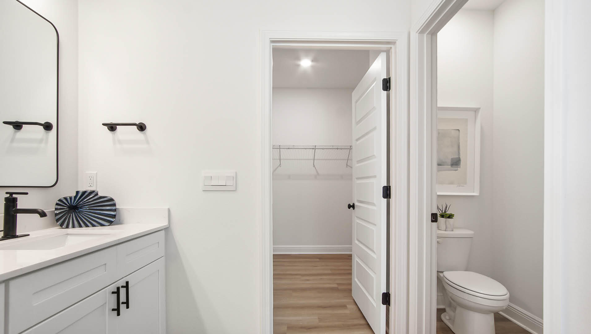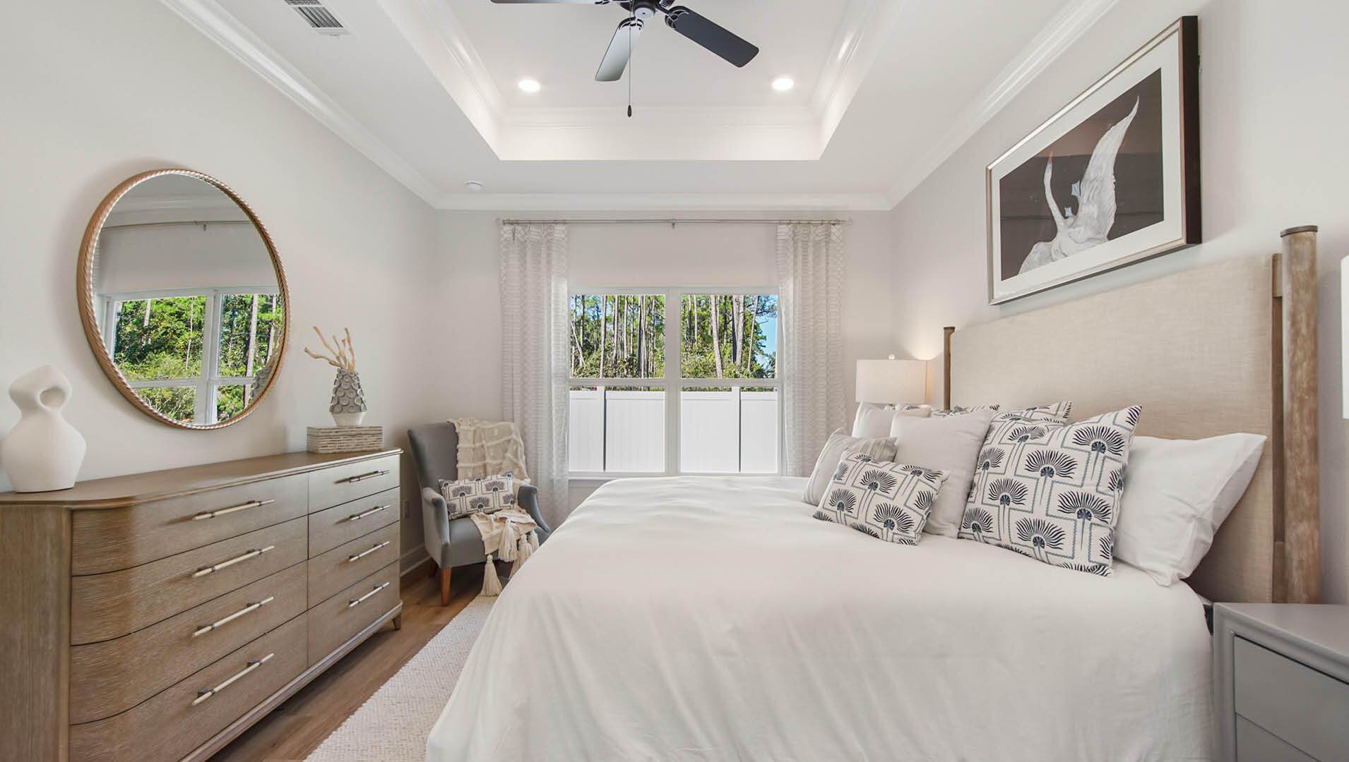 The sanctuary of the primary bedroom is secluded at the back of the home offering a peaceful retreat with stylish tray ceiling and crown molding details. Indulge in the en-suite's spa-like amenities, including black fixtures, a serene soaking tub beneath a generous window, a frameless tile shower, and a spacious closet.