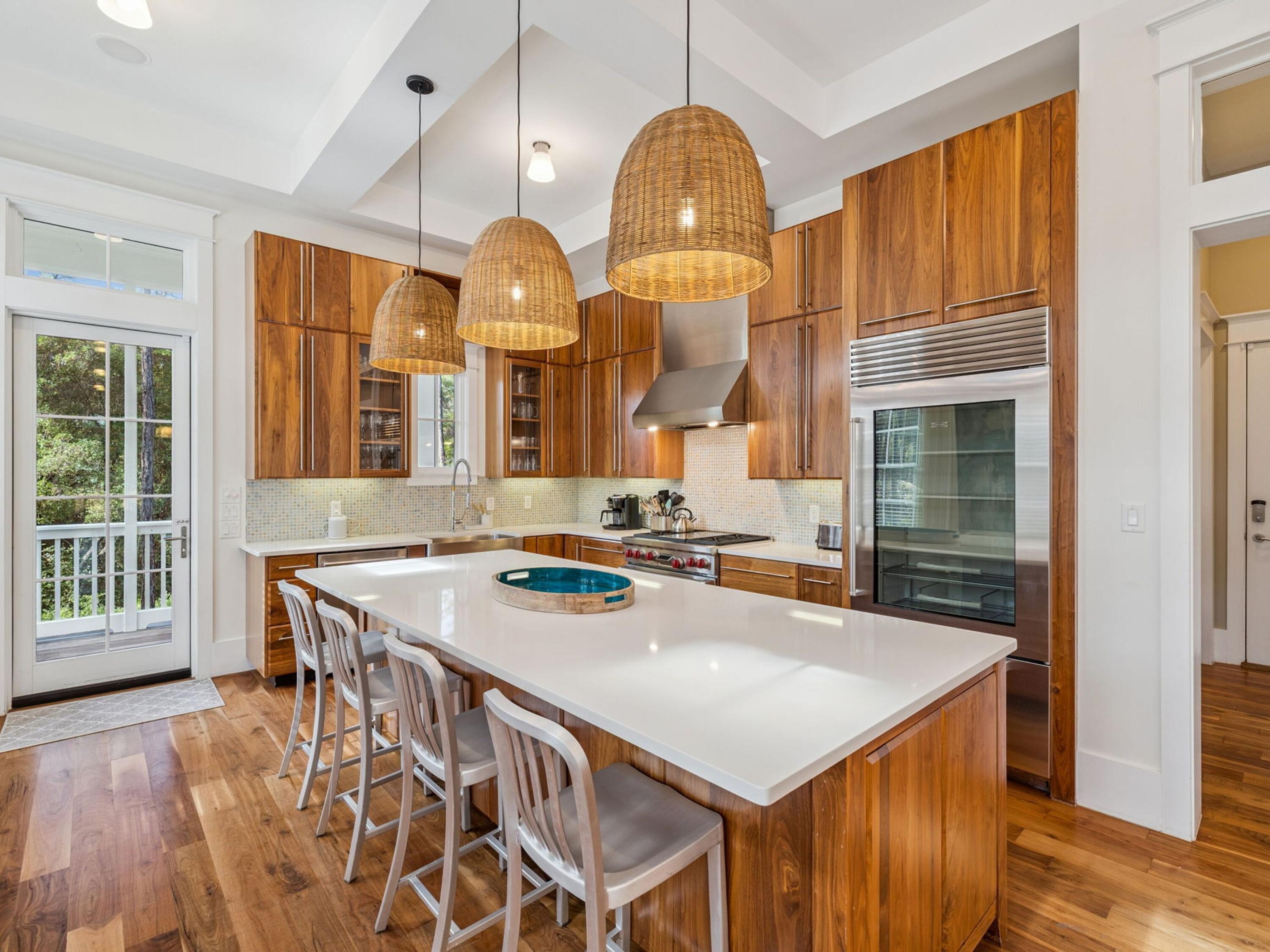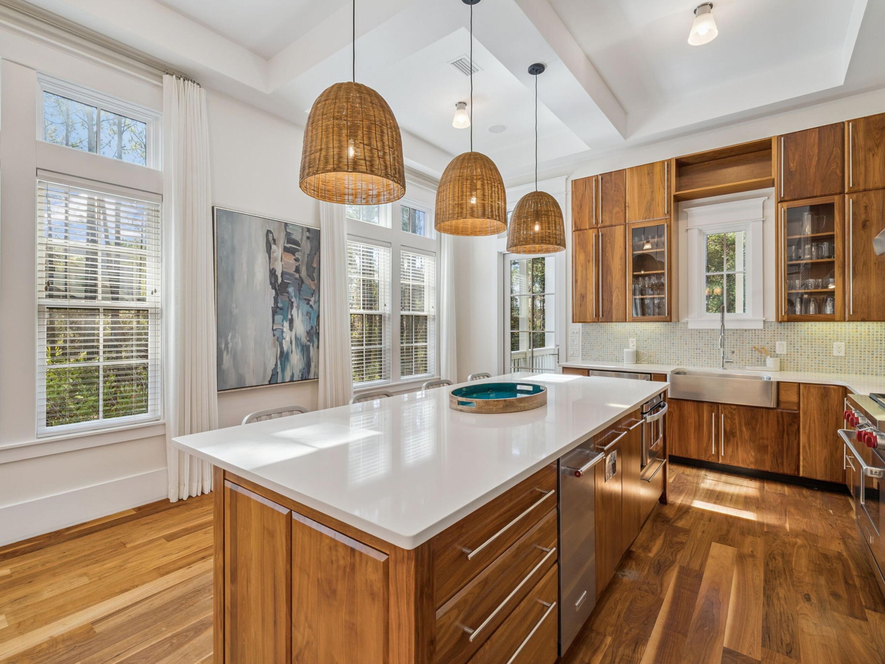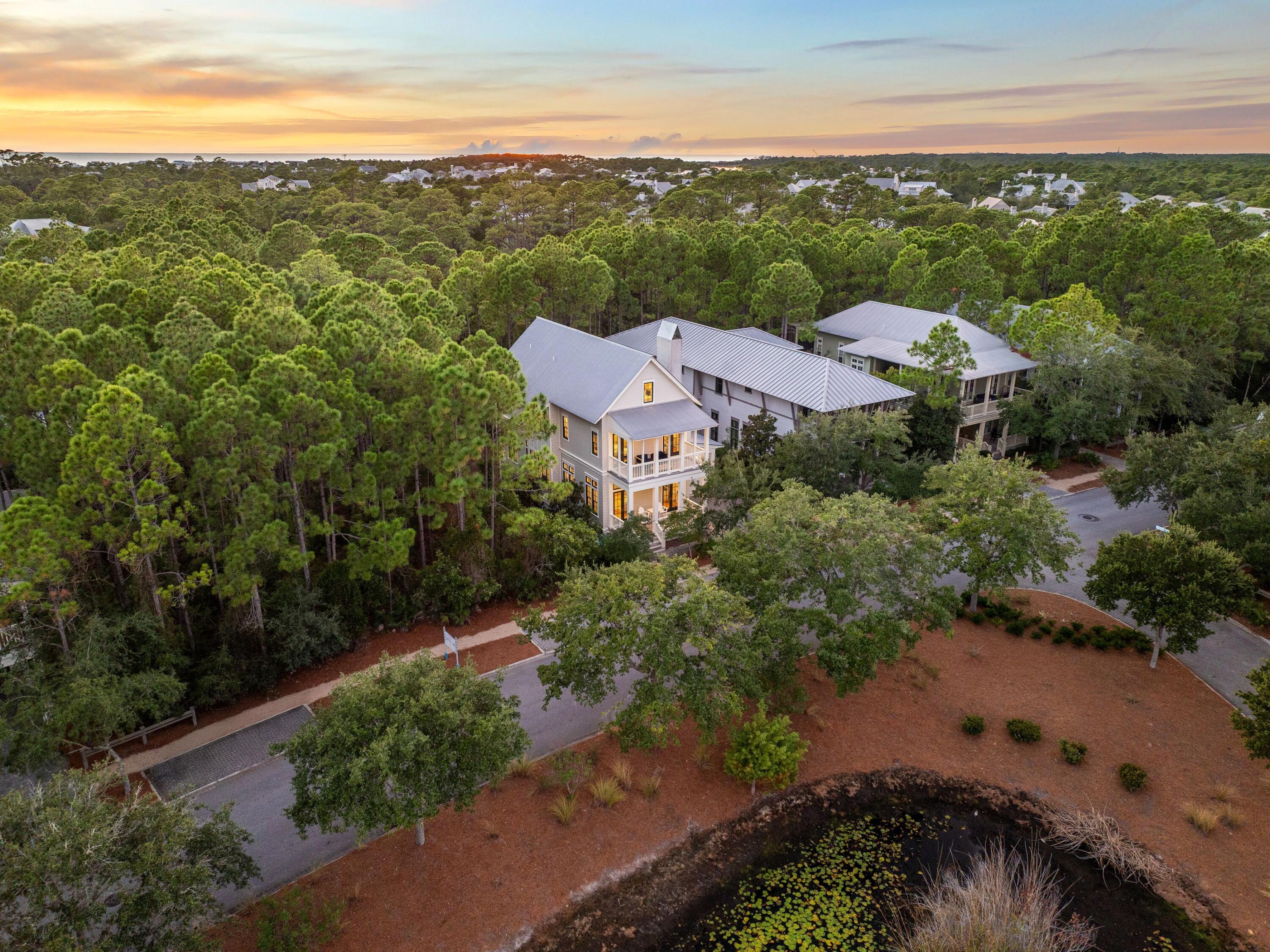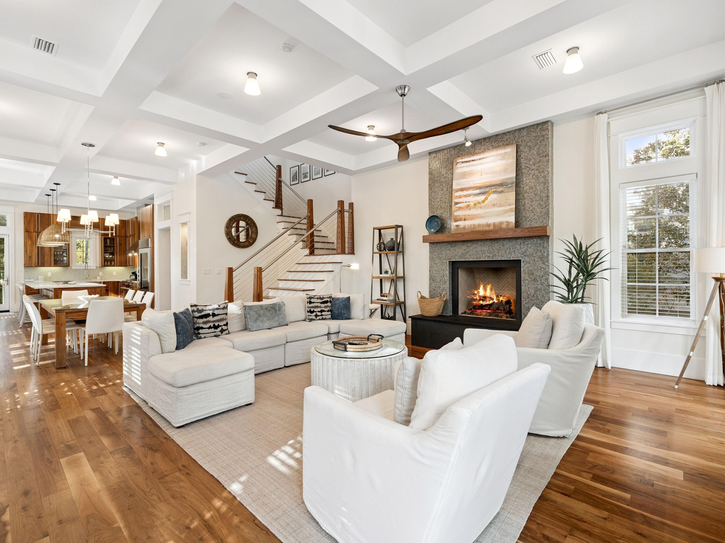 Perfectly positioned on the edge of Phase Two, this stunning five-bedroom, four-and-a-half-bathroom WaterColor home offers the ideal blend of privacy, luxury, and convenience. Designed by the renowned Geoff Chick, this architectural masterpiece embodies a seamless fusion of timeless coastal elegance and contemporary flair. Ideally located near Camp WaterColor, the home sits on a spacious, serene lot overlooking the lily pond, offering a tranquil setting with room to add a private pool. The first floor is designed for effortless entertaining and everyday living featuring open-concept living, dining, and gathering space with soaring ceilings and walls of windows that bathe the home in natural light. The warmth of American walnut floors flows throughout, adding timeless coastal elegance.