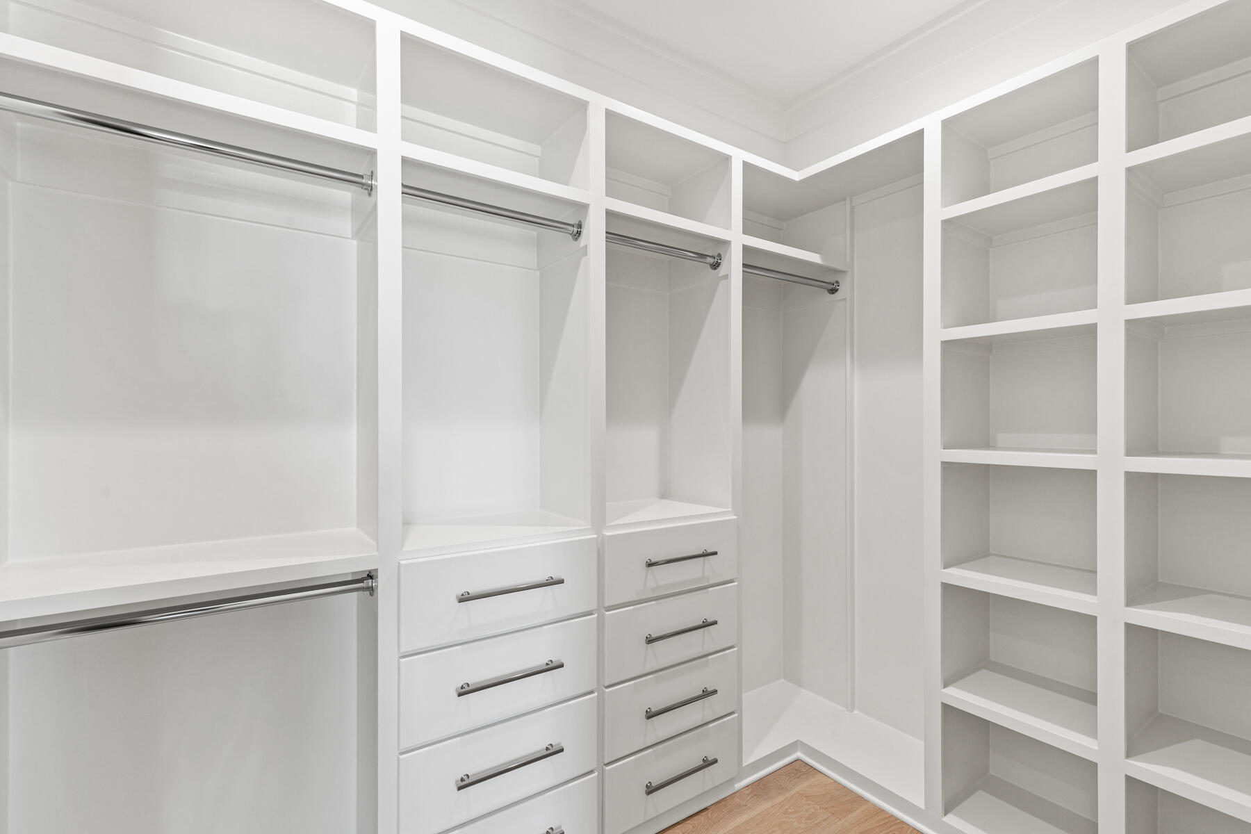 The primary suite provides a serene first-floor retreat, with a freestanding soaking tub, dual vanities, an oversized walk-in shower, a substantial custom-fitted closet, and direct access to the covered porch and pool terrace, creating an effortless indoor-outdoor connection. A second bedroom on the first floor serves as an ideal guest suite with its own private bath.