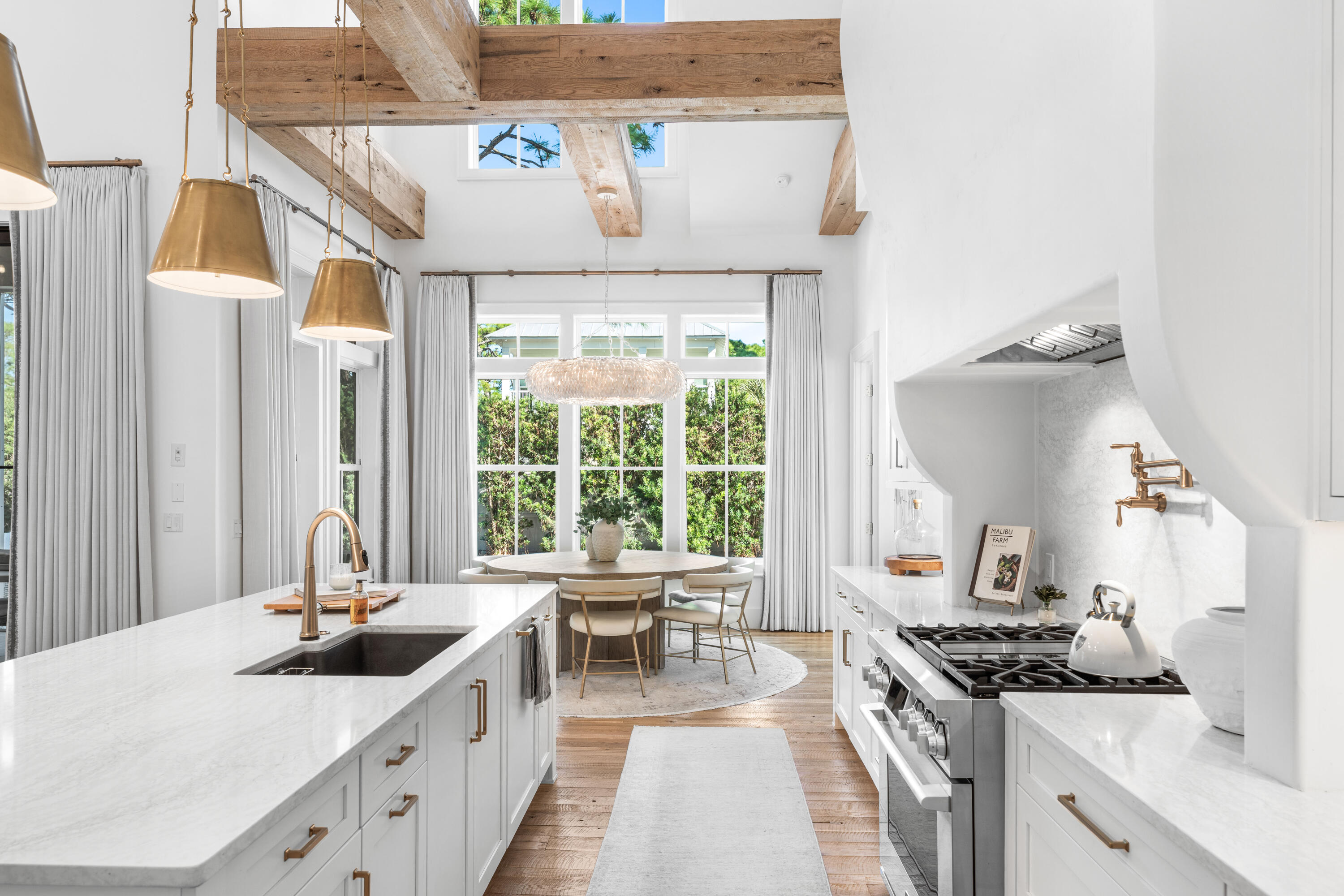 Welcome to 272 San Juan Ave, an exceptional luxury residence in the heart of Seagrove Beach 30A, blending down-to-earth comfort with refined European influence. Expertly designed by Kalon Home Interiors and masterfully built by Borges Brooks Builders, this fully furnished home showcases premium craftsmanship, curated designer finishes, and timeless architectural details.Step inside to soaring spaces defined by arched openings, custom doors, wood beams, and warm oak ceilings. The ambience is elevated by Visual Comfort and Palecek lighting throughout, paired with top-of-the-line furnishings that create a cohesive, elegant, move-in-ready retreat. The gourmet kitchen features Signature appliances, quartz countertops, and exquisite custom cabinetry. Each bathroom is uniquely designed with distinctive tile and countertop selections, giving every suite its own personality. The spectacular primary suite offers a show-stopping master closet that feels like a luxury boutique.