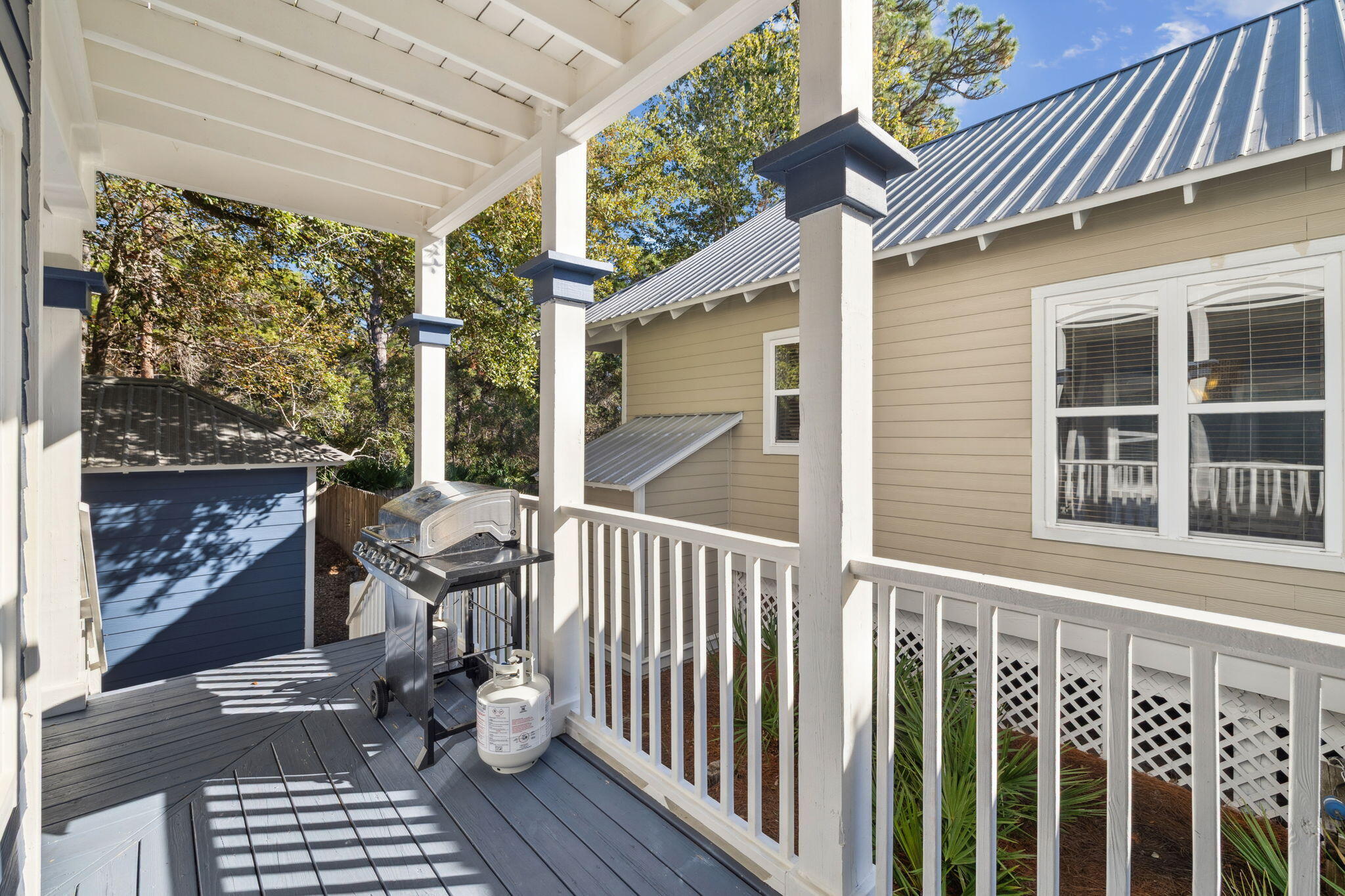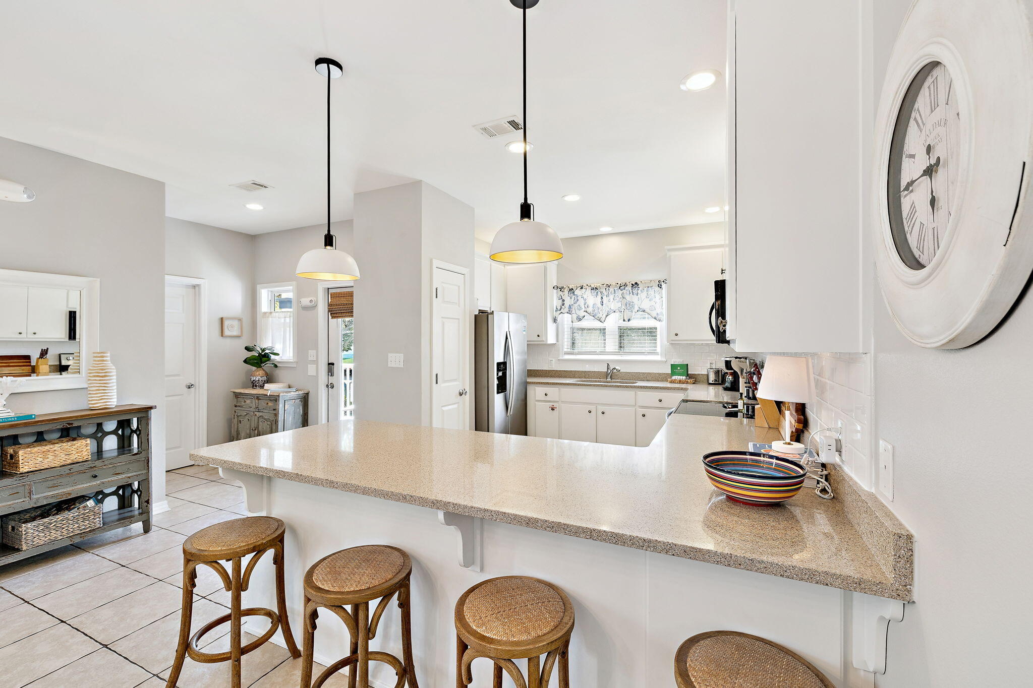 Experience effortless coastal living in this refreshed and turnkey 3-bed, 2.5-bath cottage set in the gated Old Florida Village with two pools and beach-town charm. Recent updates shine throughout, including new interior paint, a stylish kitchen backsplash, a tankless hot water heater, and new furnishings and fixtures. Fiber-optic internet is now available in the community for added convenience. The open kitchen connects to a bright dining and living area perfect after a day on the sand. A deep backyard with a golf cart garage opens to an undeveloped natural buffer for rare privacy. Enjoy quick access to Gulfview Heights and Spooky Lane beaches and the shops and dining at Gulf Place. Extra street parking adds ease, and the home suits second-home, short-term rental, or full-time use.