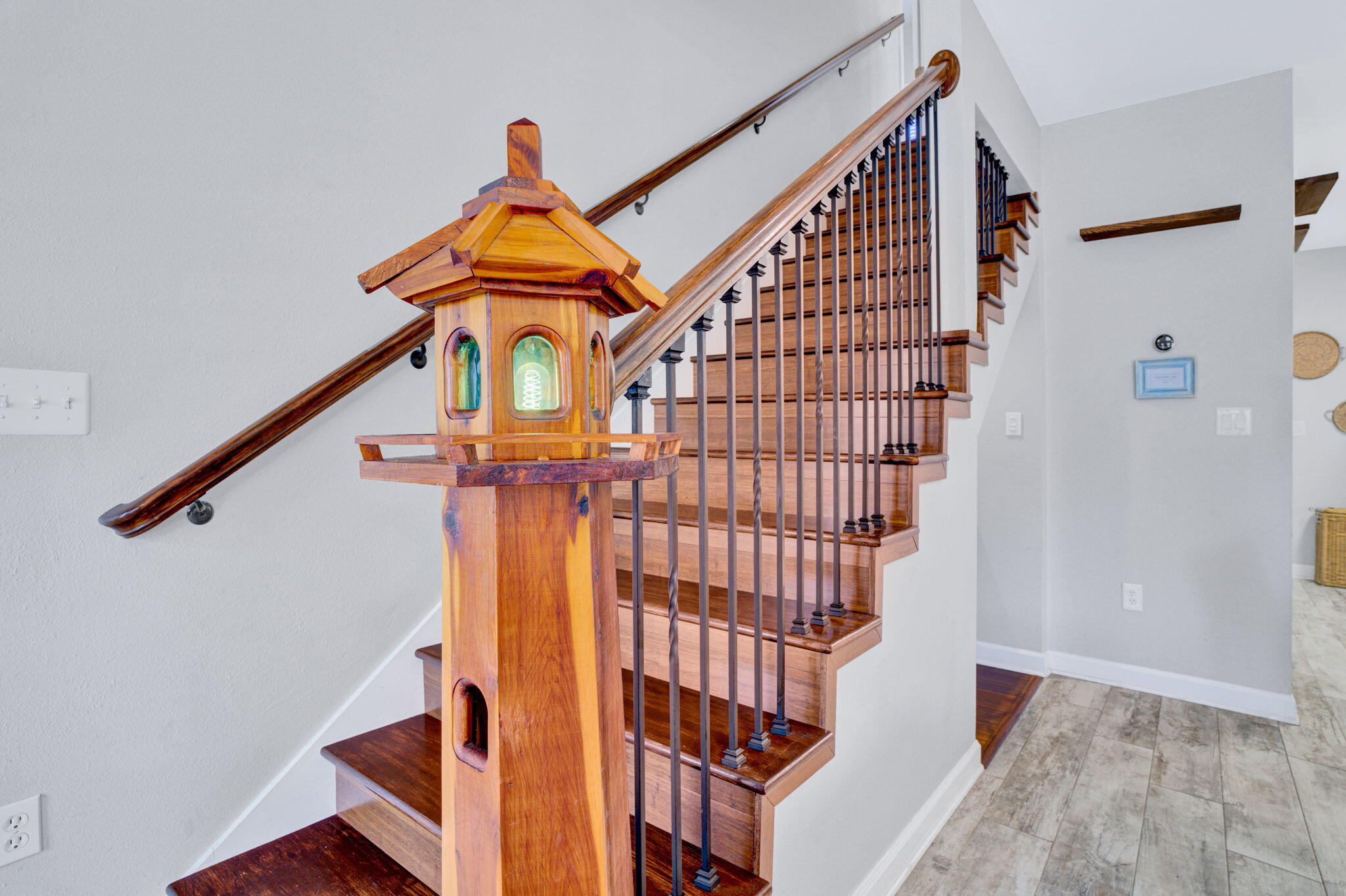 Exterior features include Hardi-plank siding, a metal roof, an oversized two-car garage, a covered front porch, and a fenced back patio complete with an outdoor shower ideal after a day at the beach.