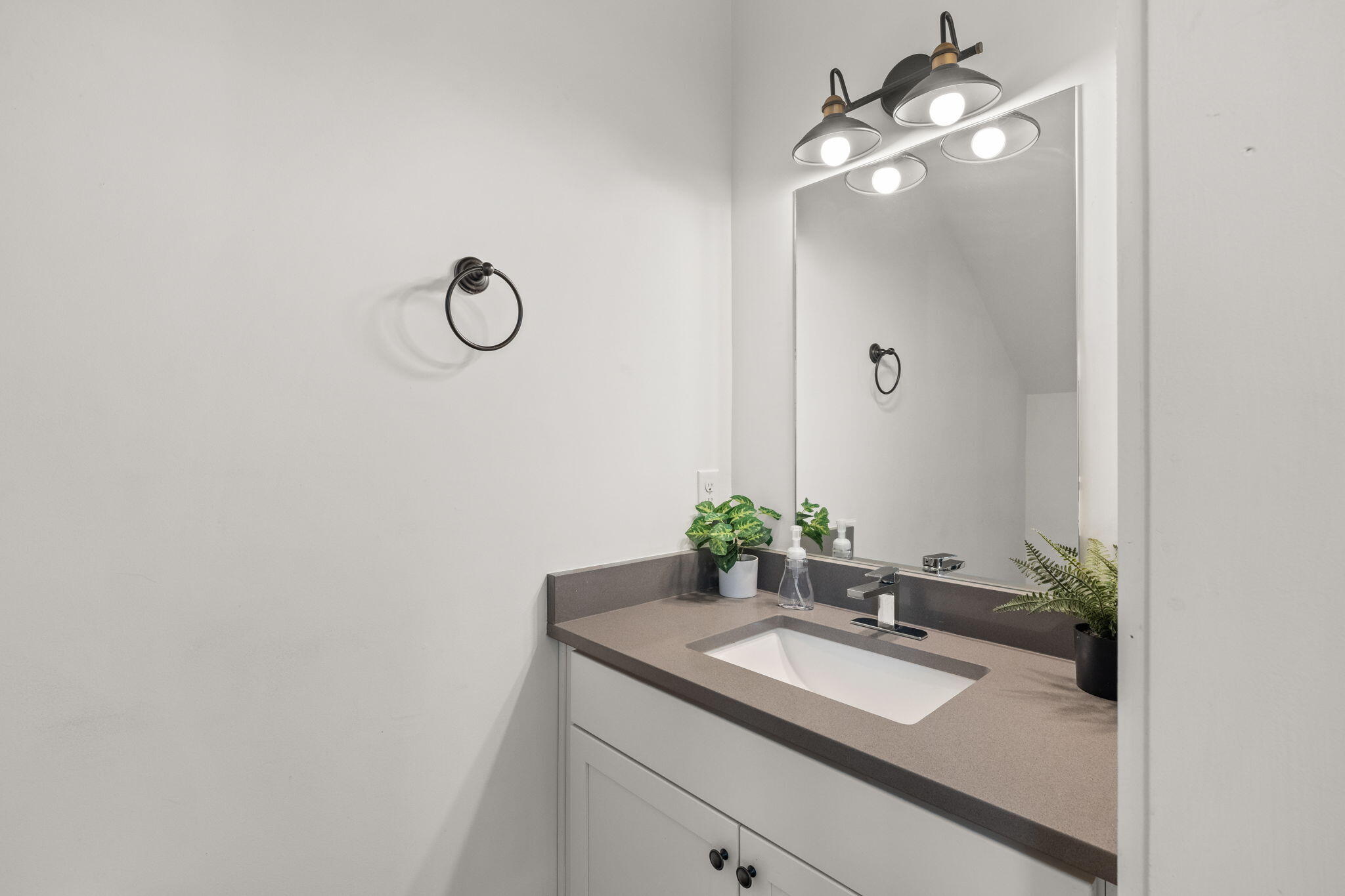 The expansive primary suite is also found along the main level offering tall ceilings, walk-in closet, and private ensuite with featuring dual-vanity sinks, quartz countertops and glass-door walk in shower. Completing the first floor, notice the powder room just off the kitchen and laundry room for ideal functionality within the space.