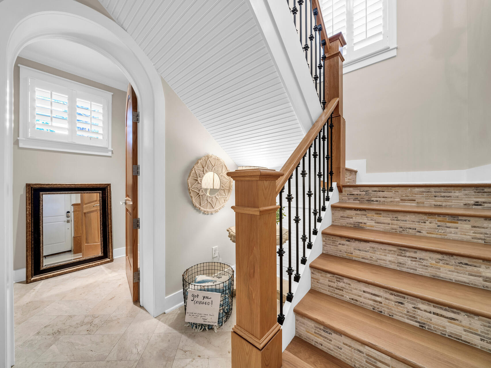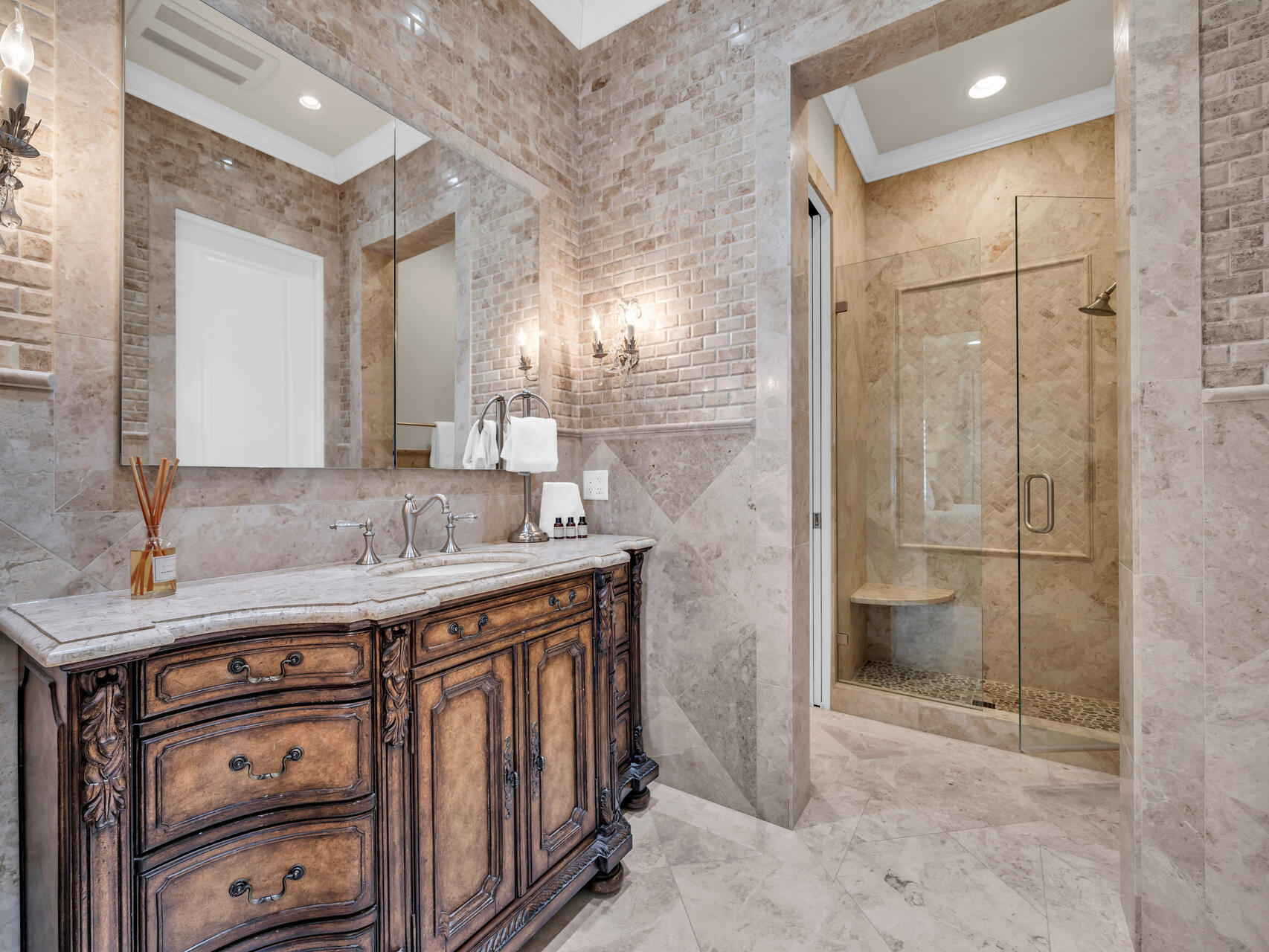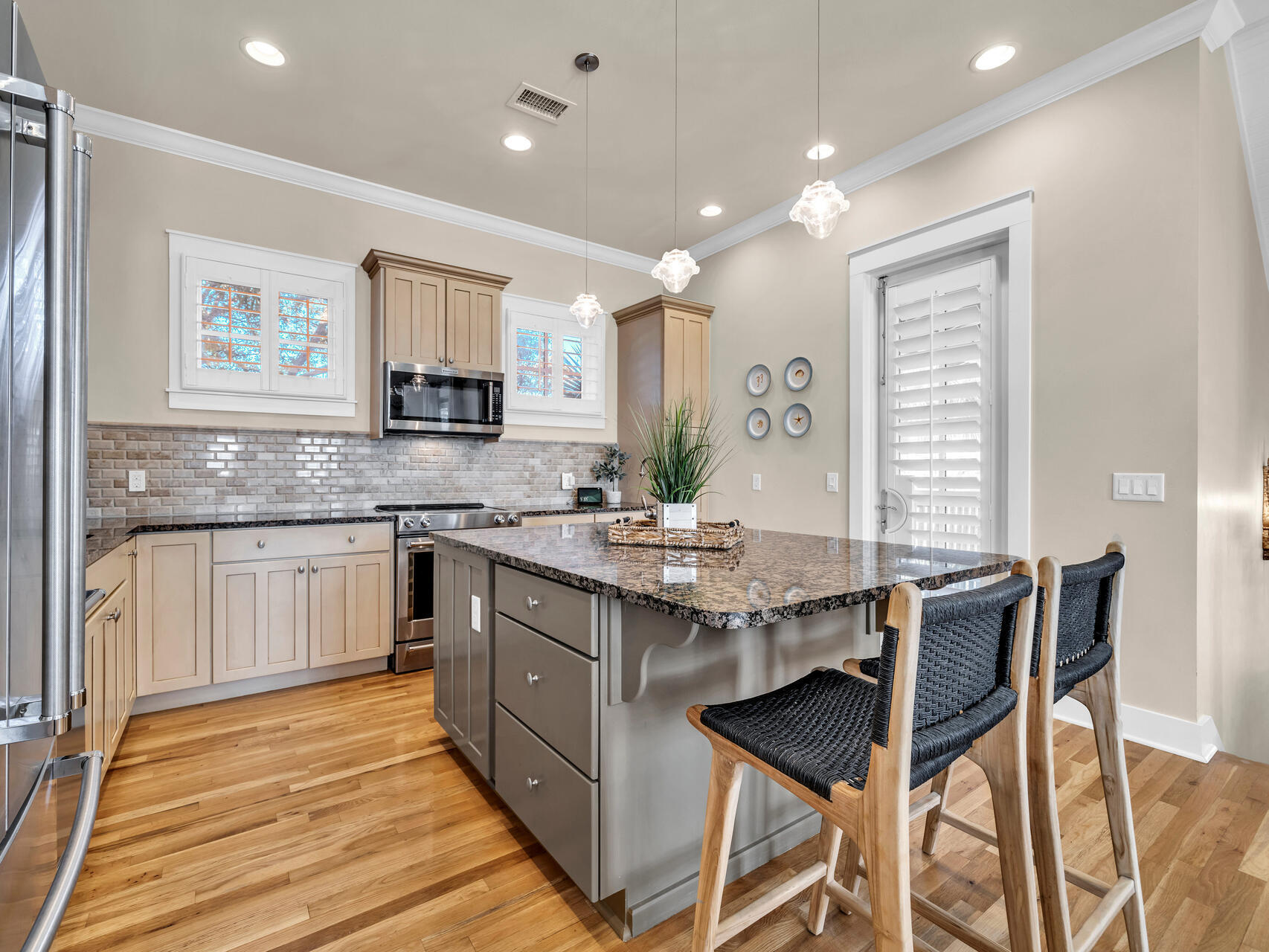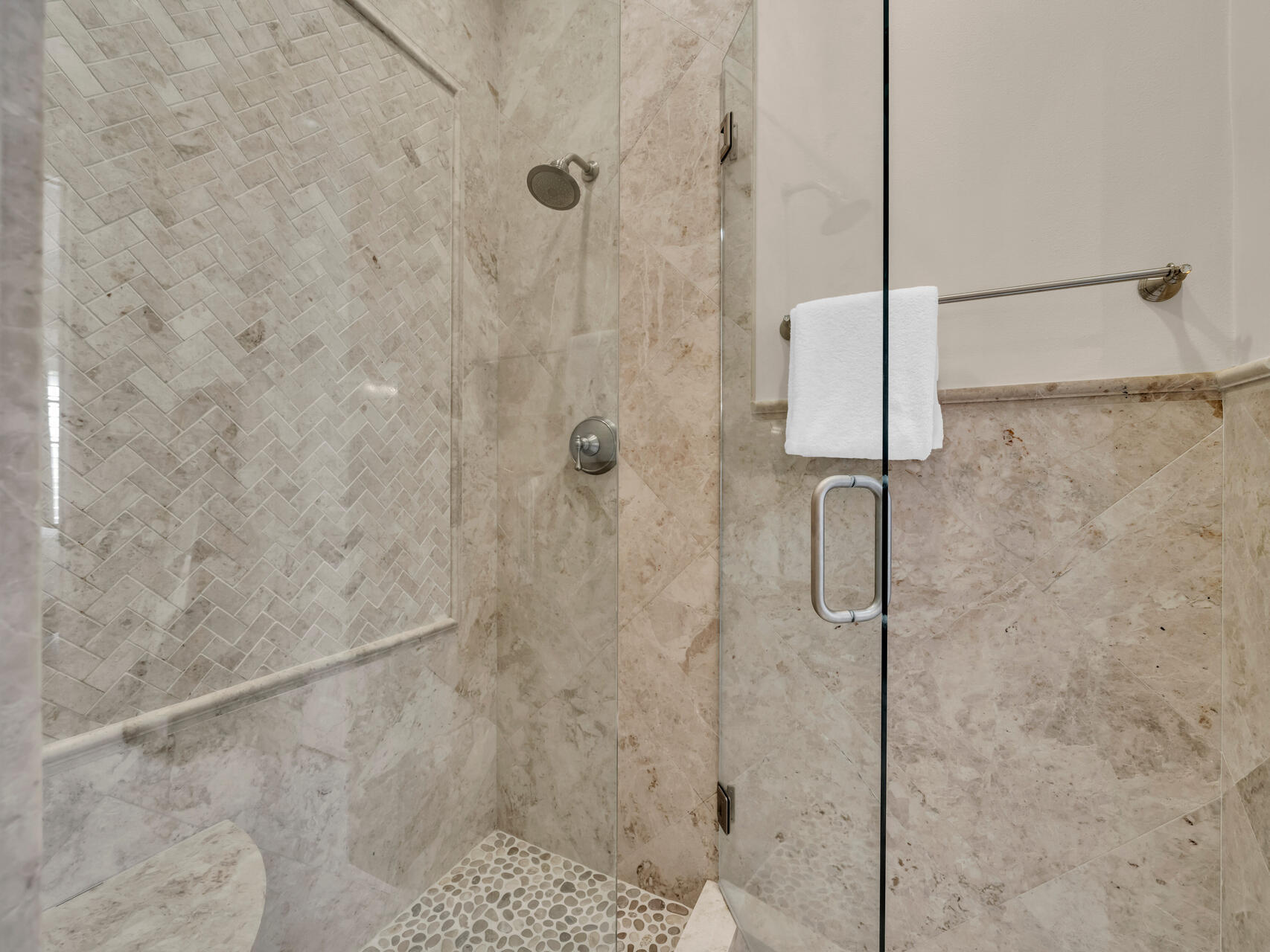 On the 2nd floor you have the open living and entertaining area with two covered patios and a balcony, as well as a full bathroom with walk-in shower. The kitchen features all stainless steel appliances, granite countertops, and large kitchen island. On the 3rd floor you will find the second guest suite with private bathroom, washer/dryer closet, and your primary suite. The primary suite boasts both a balcony and covered patio with private seating area and Gulf views. The master bath features a walk-in shower as well as a spacious walk-in closet with built-in shelving.