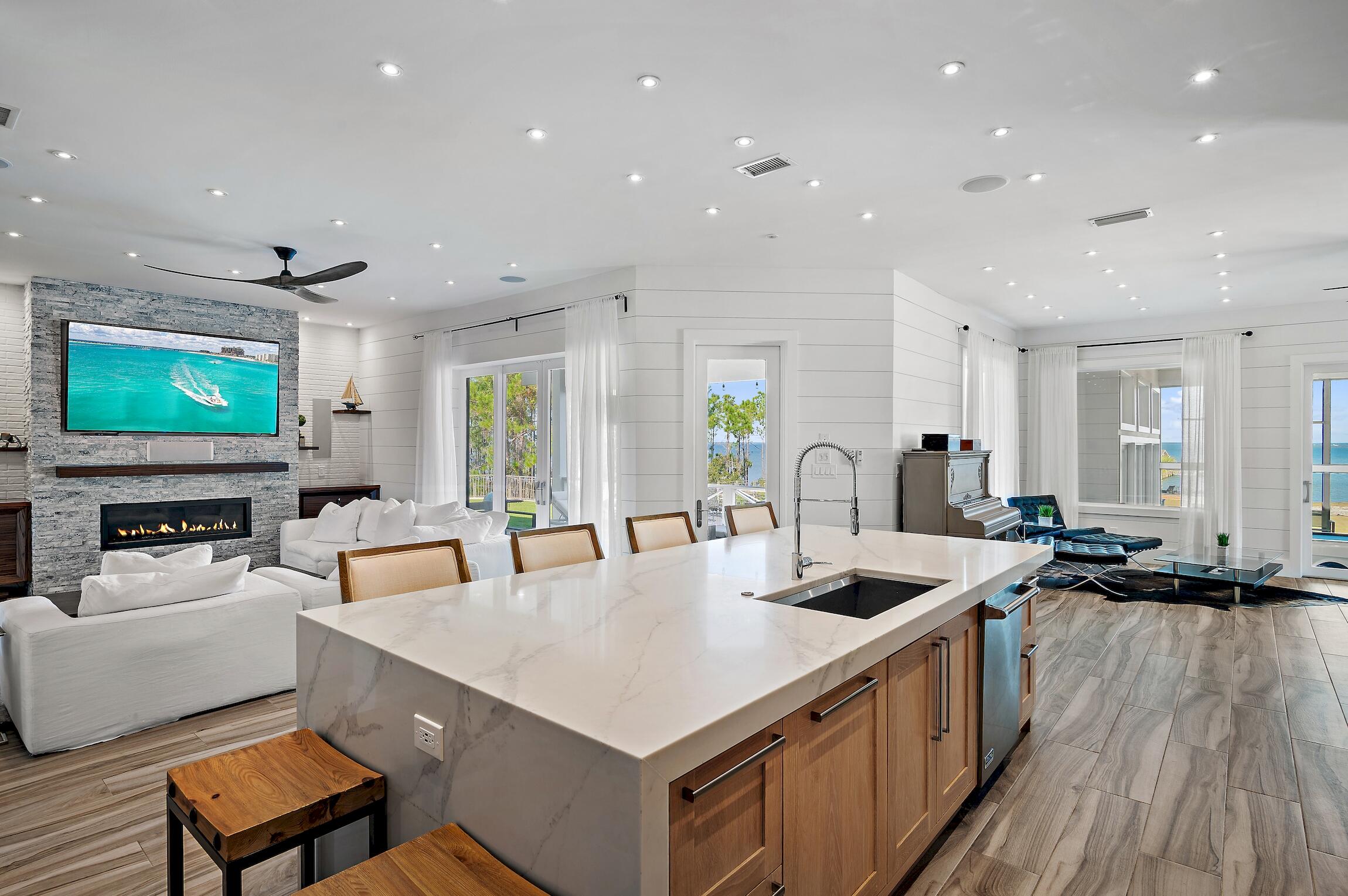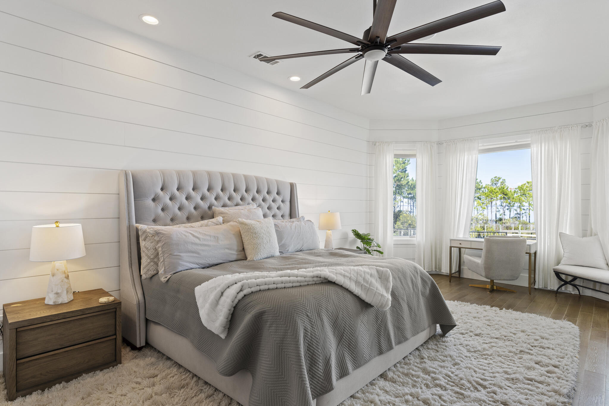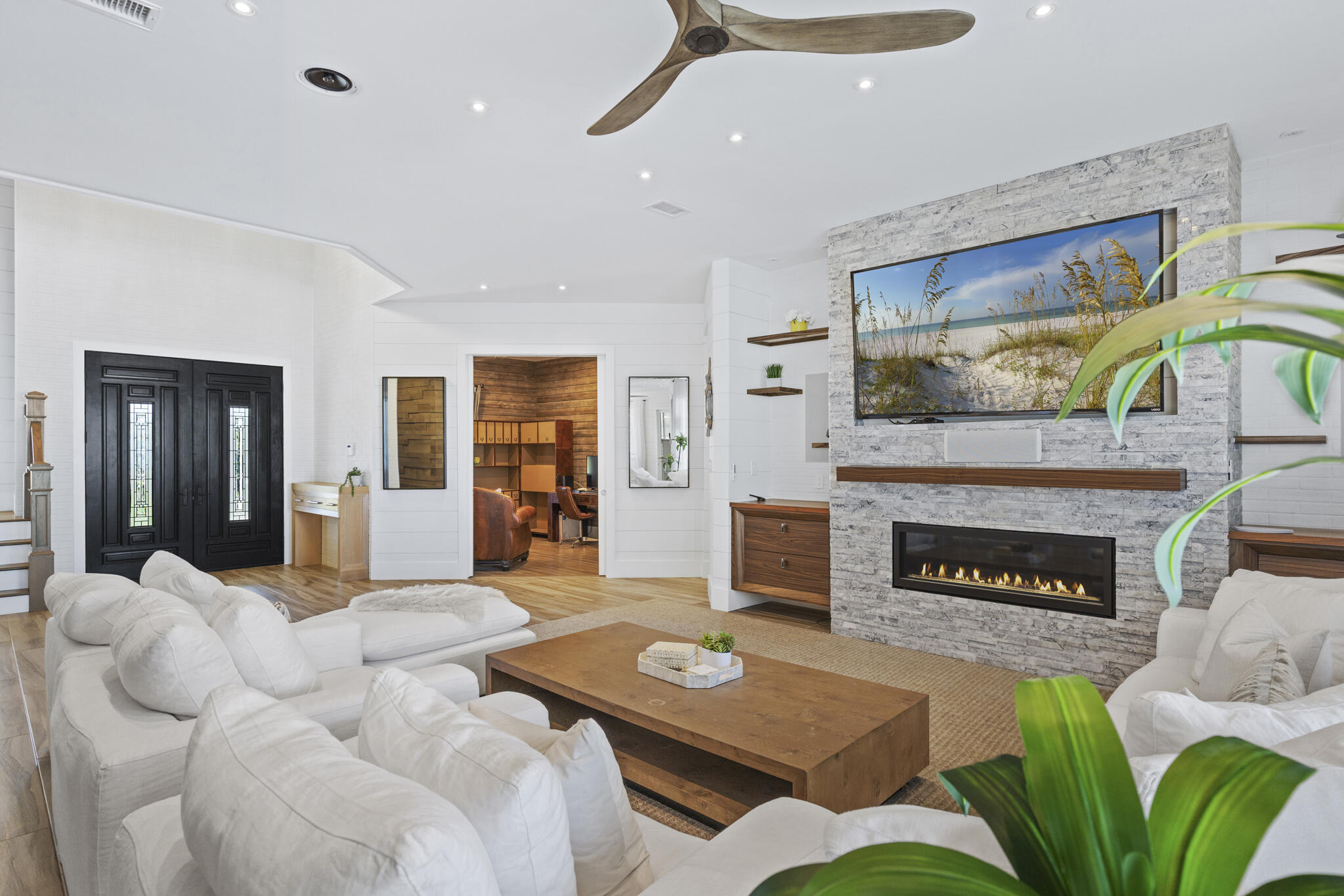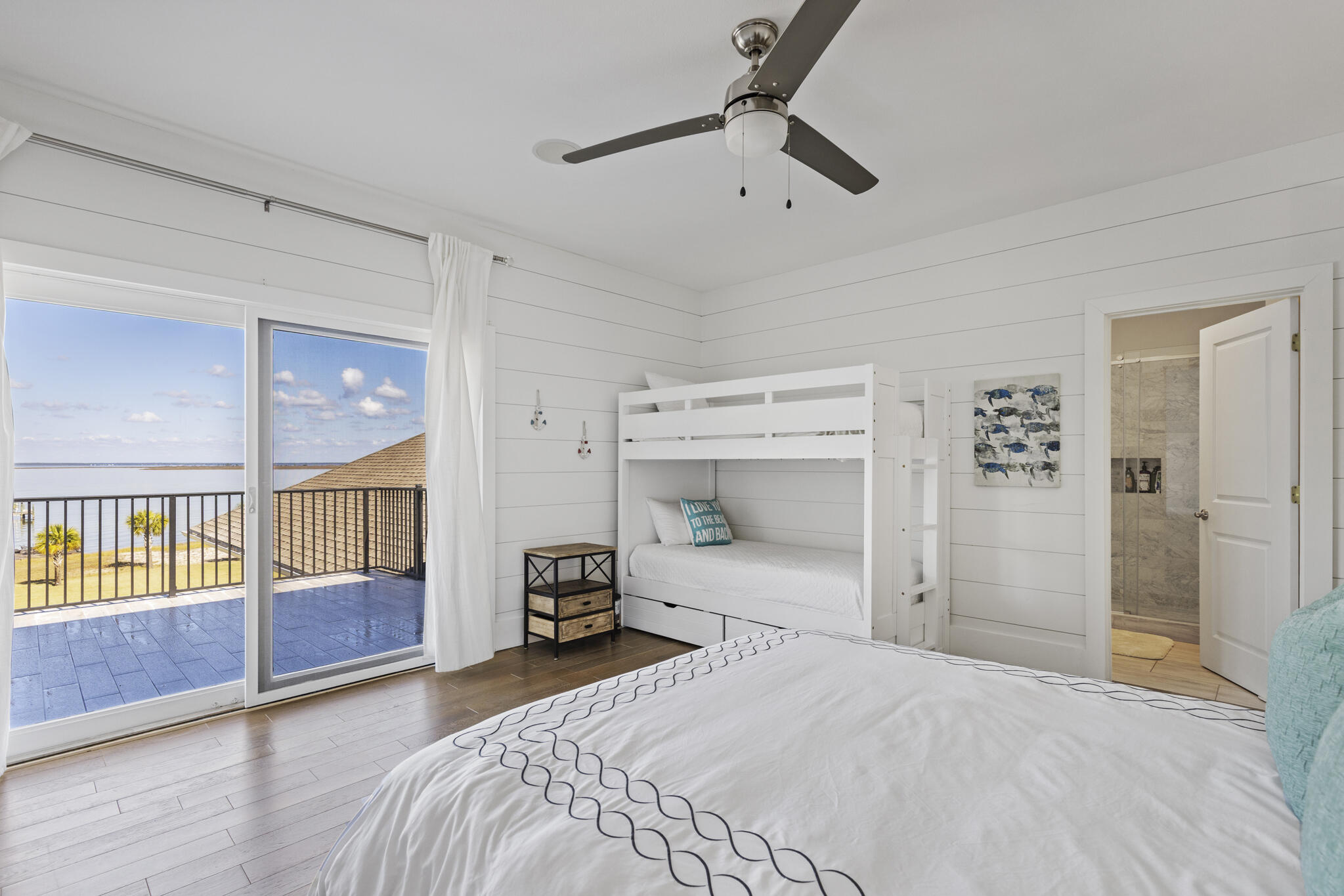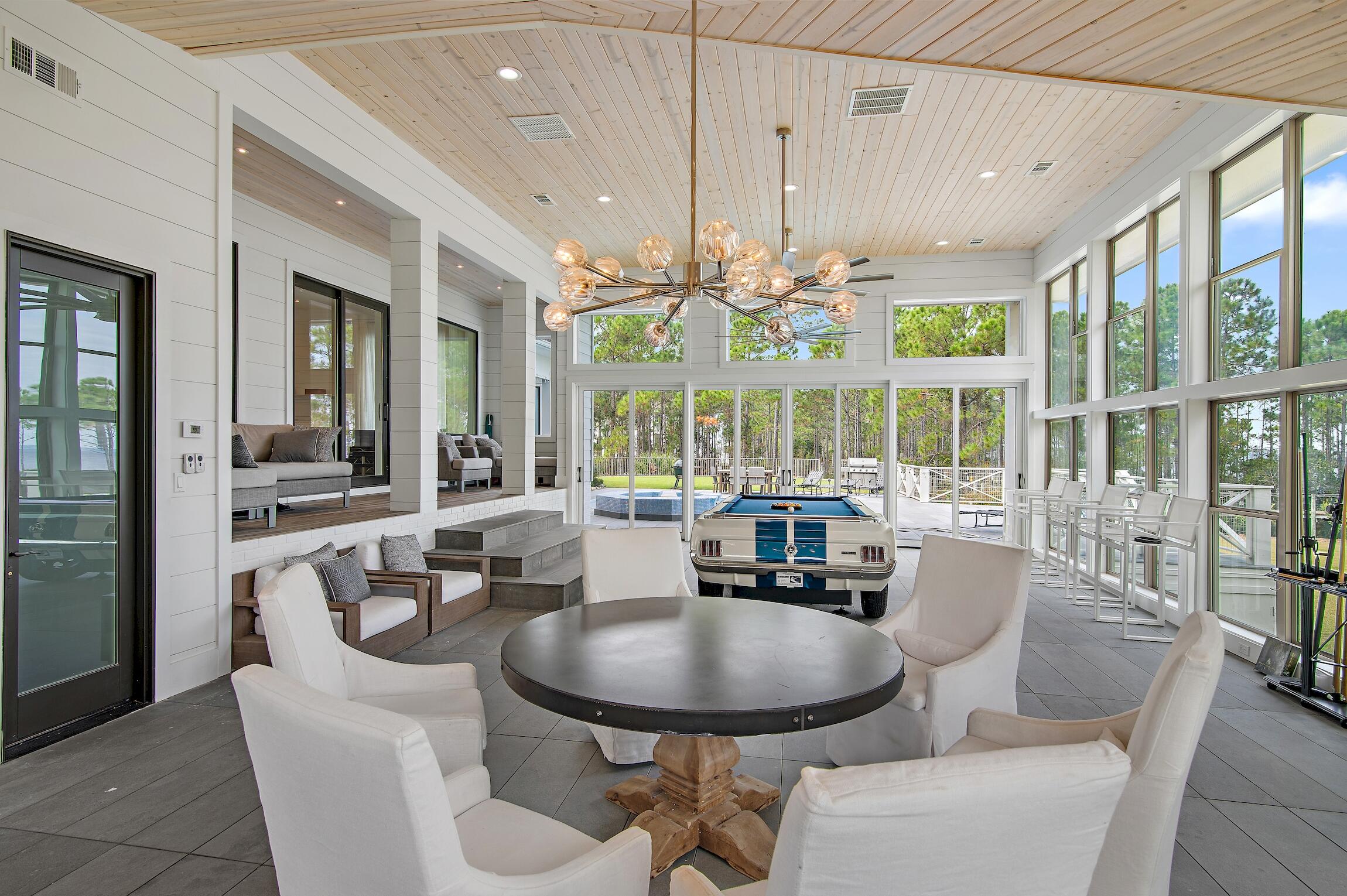Rare Find! Incredible Estate on the Bay perched on 3.38 acres with 240 feet of Choctawhatchee Bay frontage, this fully renovated 6-bedroom estate offers over 5,700 sq. ft. of luxurious living space and unparalleled privacy. Outdoor living is a true highlight, featuring a brand-new heated pool, spa, and pool deck, plus a 250-foot dock with two boat slips, tropical landscaping, and even a stocked pond with bass and brim for fishing and relaxation. Enjoy complete seclusion with this gated home surrounded by nature while still being just one light away from Scenic 30A and Gulf-front Topsail State Park. The home's Florida room is an enclosed entertainment haven with raised wood ceilings, glass surrounds with panoramic views, added pool bath and seamless access to the new pool deck. Inside, thoughtful renovations and elegant finishes abound. The main level features solid wood cabinets, new porcelain tile floors, shiplap, 10' ceilings, and stone accents. Glass sliders and large Pella windows bring the serene outdoors inside. A chef's kitchen with state-of-the-art Viking appliances, Quartz countertops, wet bar, prep kitchen, and temperature-controlled wine room (holds ~1,200 bottles) is ideal for entertaining. A formal dining area overlooks the Bay with sliders to the Florida room, while a spacious living room features a modern electric fireplace paired with abundant natural light, picturesque views and cozy atmosphere. The first-floor master suite is a coastal retreat, boasting shiplap accents, a sitting area, private lanai with an electric fireplace, two walk-in closets, and a spa-like bath with a clawfoot tub, walk-in shower with four shower heads, and herringbone tile floors. The east side 1st floor bedroom provides a second master essentially with a separate French door entry to the front patio. This room is large enough for two queen beds and offers a beautiful ensuite bath. There is an additional room by the entry with double doors and wood walls that is an ideal office or can be a true bedroom with a bathroom right across. The oak staircase, highlighted by an elegant chandelier, leads upstairs to three additional bedrooms, each with an ensuite bathroom. Two of the bedrooms are Bayfront, each opening onto a spacious balcony with breathtaking views. Ample storage, two laundry areas, and a two-car garage complete the home.
