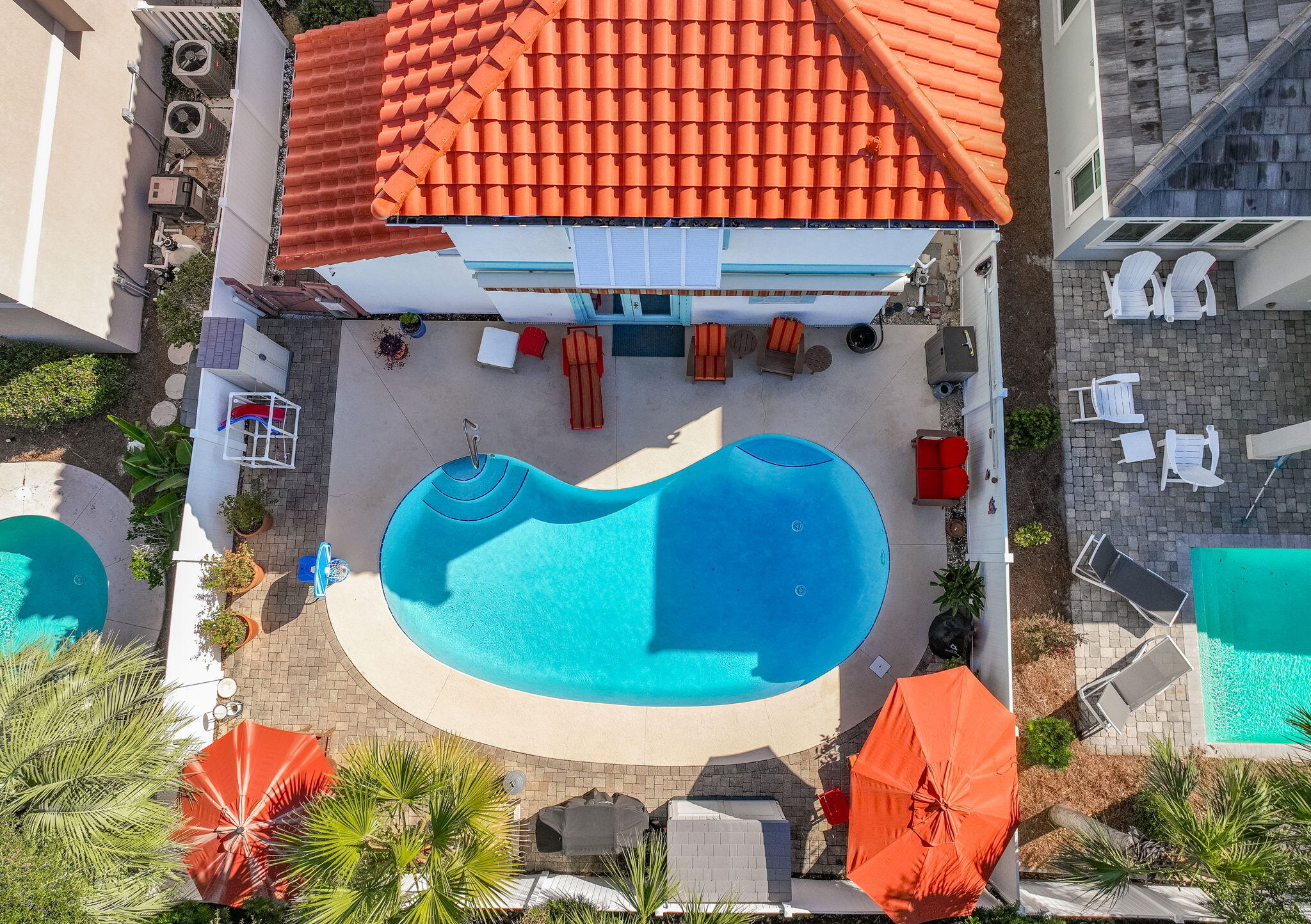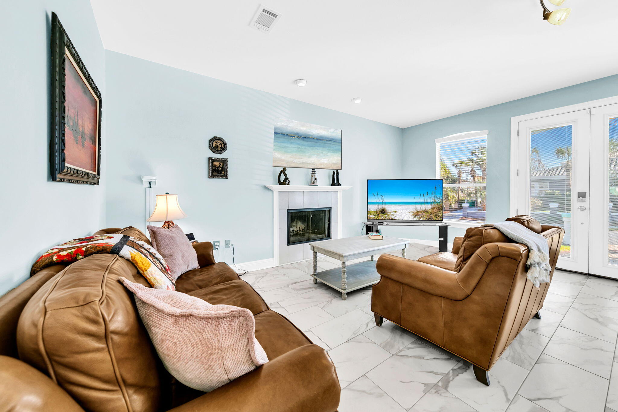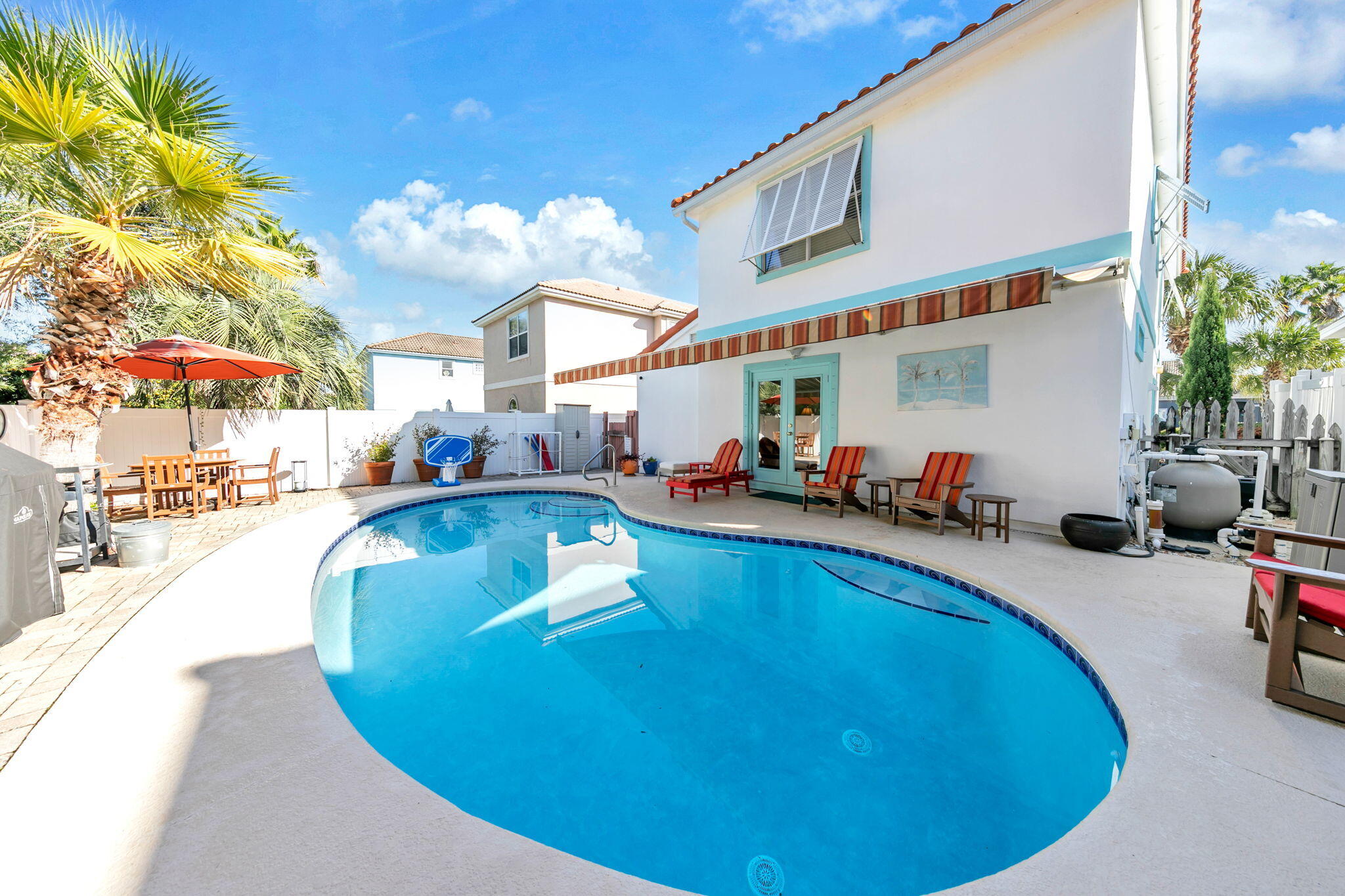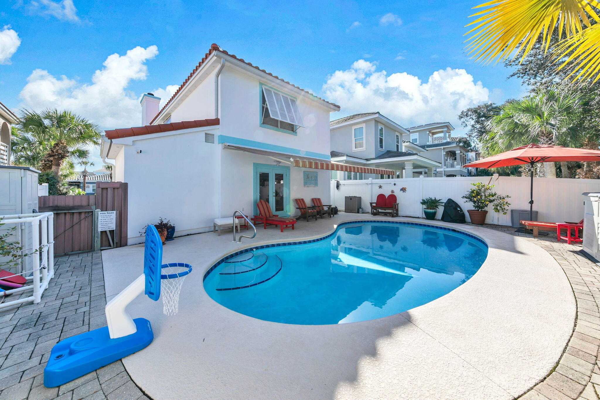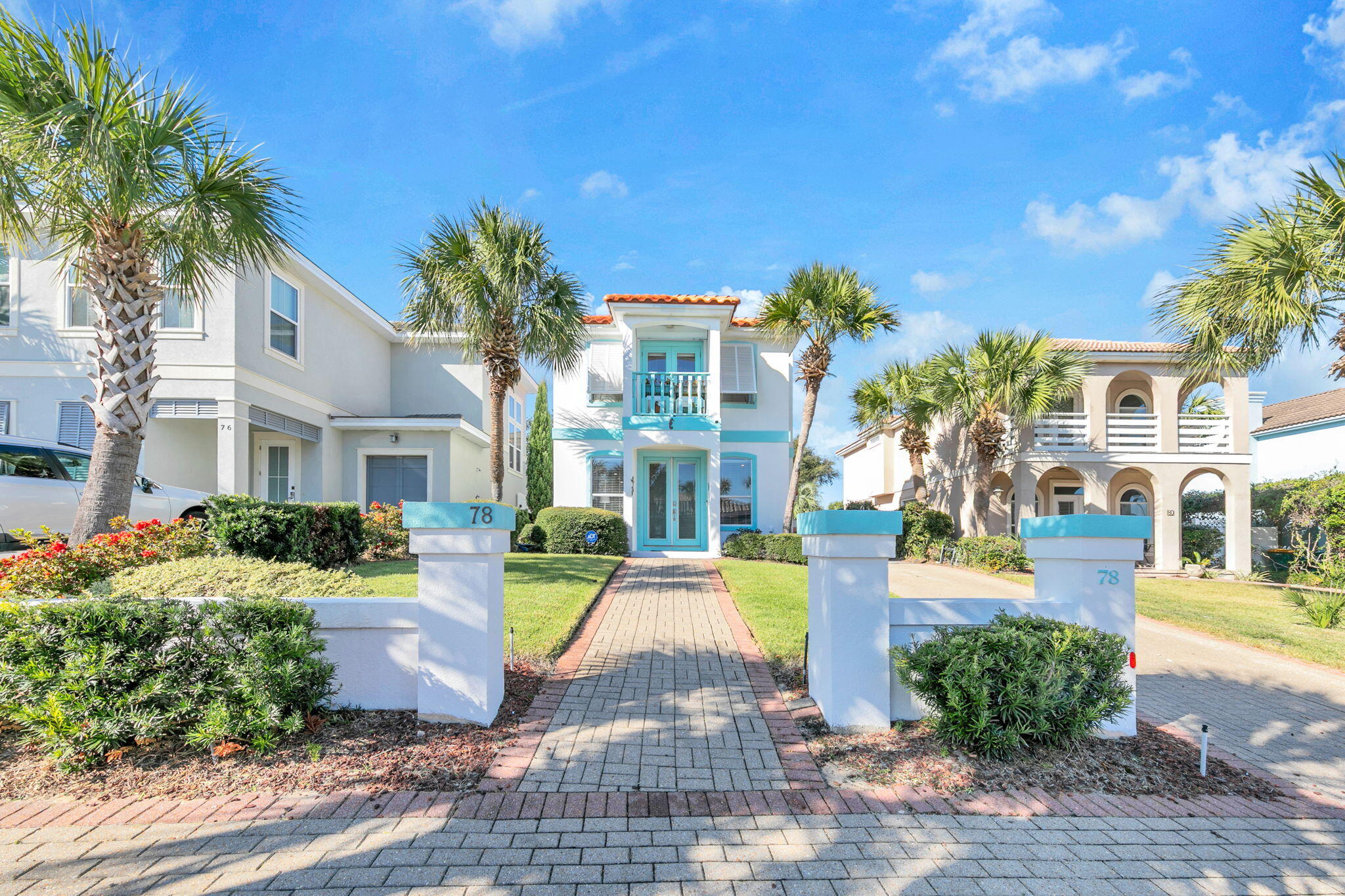 A Luxuriously Remodeled Beach Retreat Featuring a Private Heated Saltwater Pool and Exclusive Beach Access awaits! 78 Terra Cotta Way, an exquisitely reimagined 3-bedroom + office/bunk room, 3-bath luxury beach home featuring a private heated saltwater pool and exclusive deeded, gated beach access, perfectly situated in the prestigious Terra Cotta Terrace community. This remodeled coastal haven welcomes you with a new roof, tropical landscaping, a brick paver driveway, a charming covered front porch, fresh 2021 exterior paint with completed stucco inspection, and additional outdoor storage added to the exterior of the home. Inside, the open-concept layout is elevated by Calacatta Gold tile flooring, crisp white trim, an elegant real wood-burning fireplace, and designer finishes throughout The totally remodeled chef's kitchen showcases breathtaking Misterio Vico Subra quartz waterfall countertops, Storybook greige lower cabinetry, Charlotte Beach upper cabinetry, champagne hardware, a gas range with double oven, and a stunning glass subway tile backsplash, all hand-crafted to create a luxurious statement for your friends, family and vacationing guests. The spacious bedrooms and spa-like bathrooms offer comfort and serenity, while the flexible office/bunk room provides the perfect space for guests/bunk room or remote work. The second-floor master suite invites you onto a serene private balcony facing east, where each morning greets you with Destin's breathtaking sunrise - an intimate moment that we all need. The first-floor primary suite provides effortless luxury as well, offering elegant French-door access to the sparkling pool. Outside, the pool area features a remarkable motorized shade system that extends from the home to cover the water, creating a blissfully cool retreat during the warm summer months.