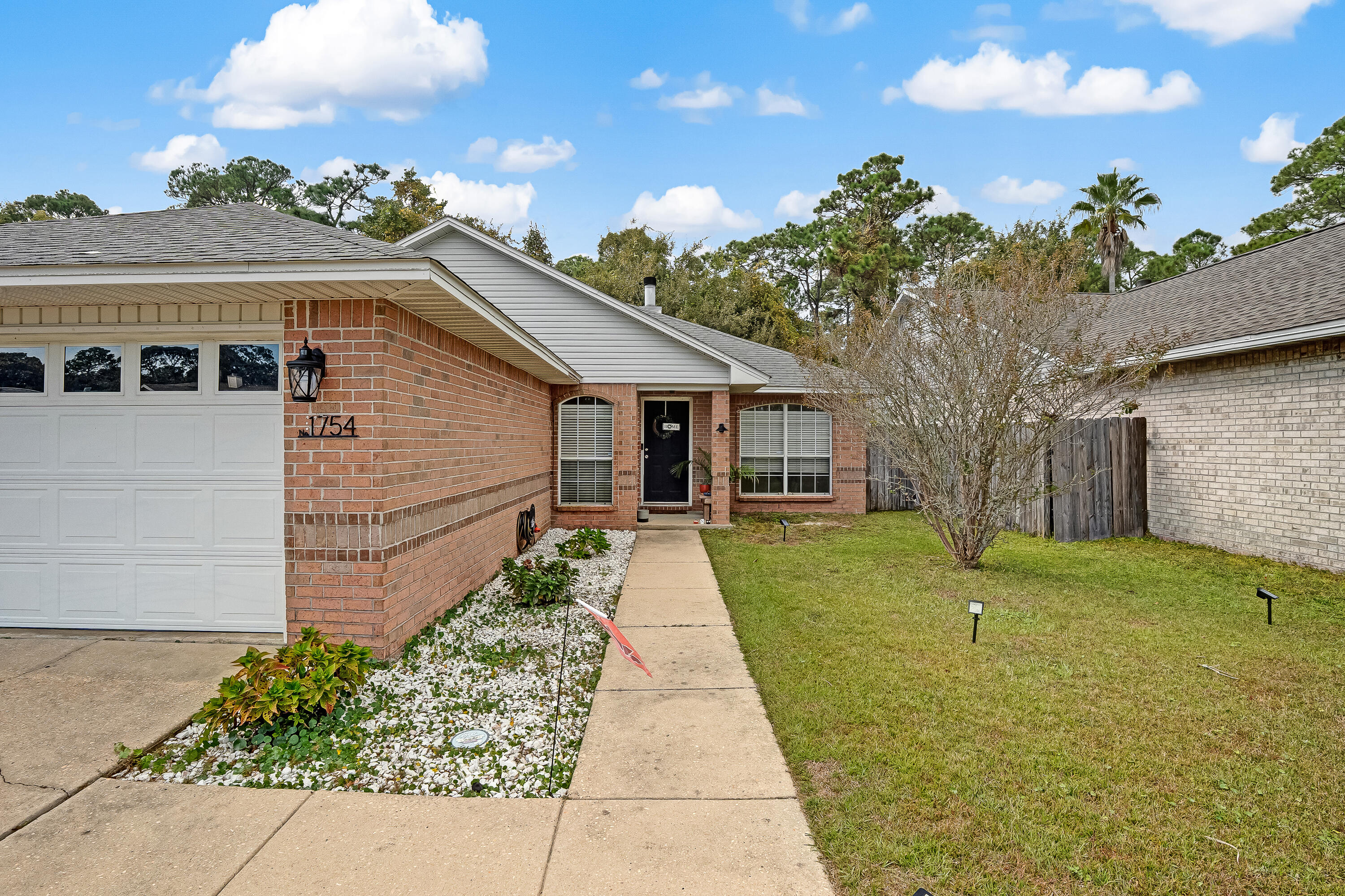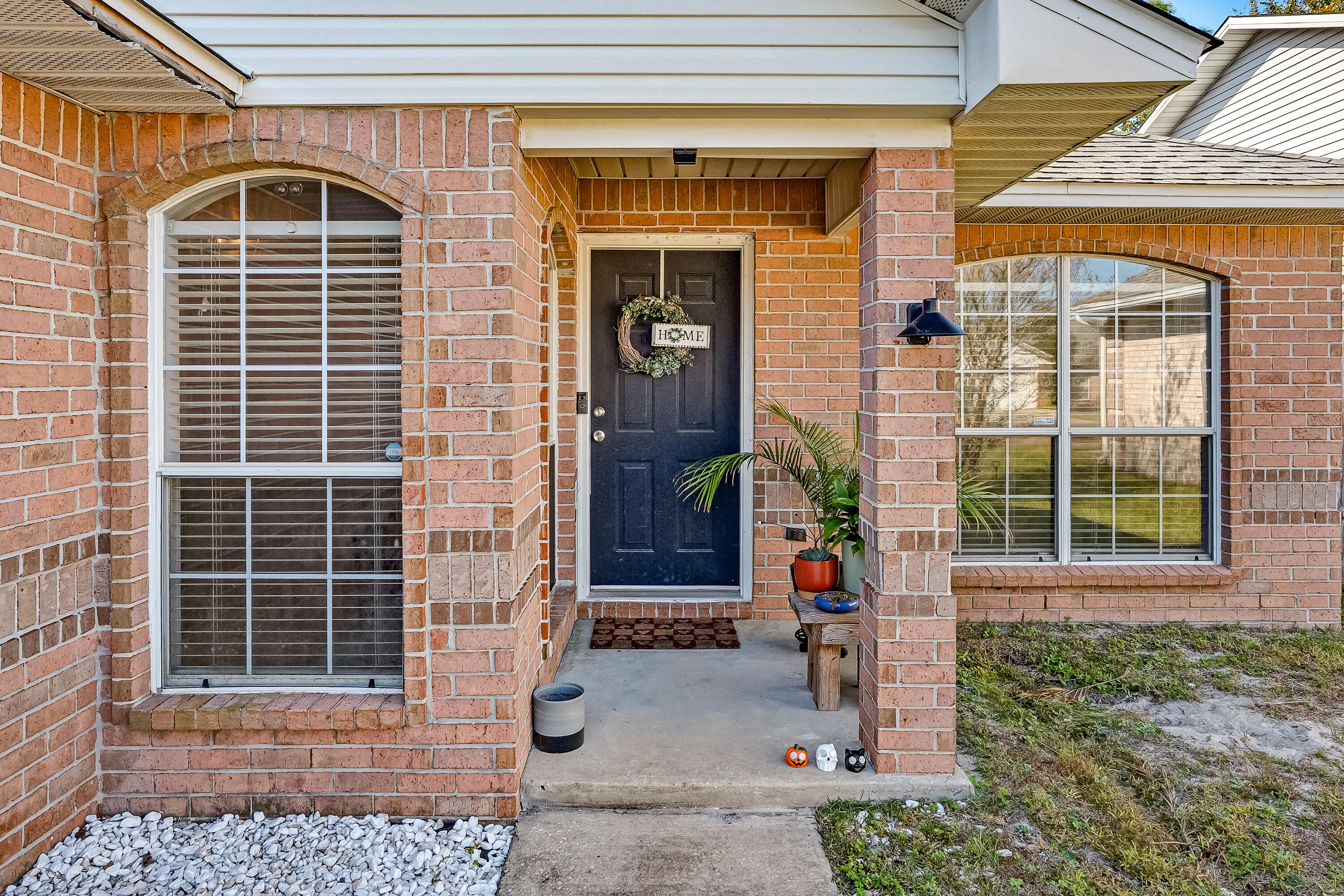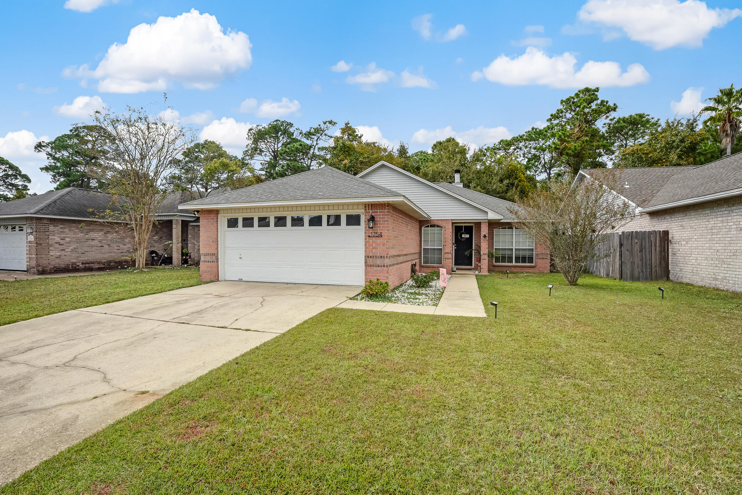 Lovely 3-bedroom, 2-bath all-brick home in a quiet Soundside neighborhood in Navarre. Step inside from the covered front porch into a bright, inviting great room filled with natural light, featuring cathedral ceilings and a cozy corner fireplace. Double sliding glass doors open to a covered patio, creating an easy indoor-outdoor flow.The home offers matching wood-look tile throughout the living room, dining area, kitchen, primary suite, guest bath, and laundry room, both stylish and low-maintenance.The kitchen includes stainless steel appliances, a built-in microwave, and abundant cabinet space. The private primary suite enjoys excellent natural light with double windows and direct access to the patio. The en-suite bathroom features a walk-in closet. This split floor plan includes two additional bedrooms and a full guest bath. Ceramic tile covers all wet areas for easy care. Located in an area that does not require flood insurance, this home offers peace of mind along with comfort and convenience. A wonderful opportunity to own an inviting, light-filled home in one of Navarre's most desirable areas.