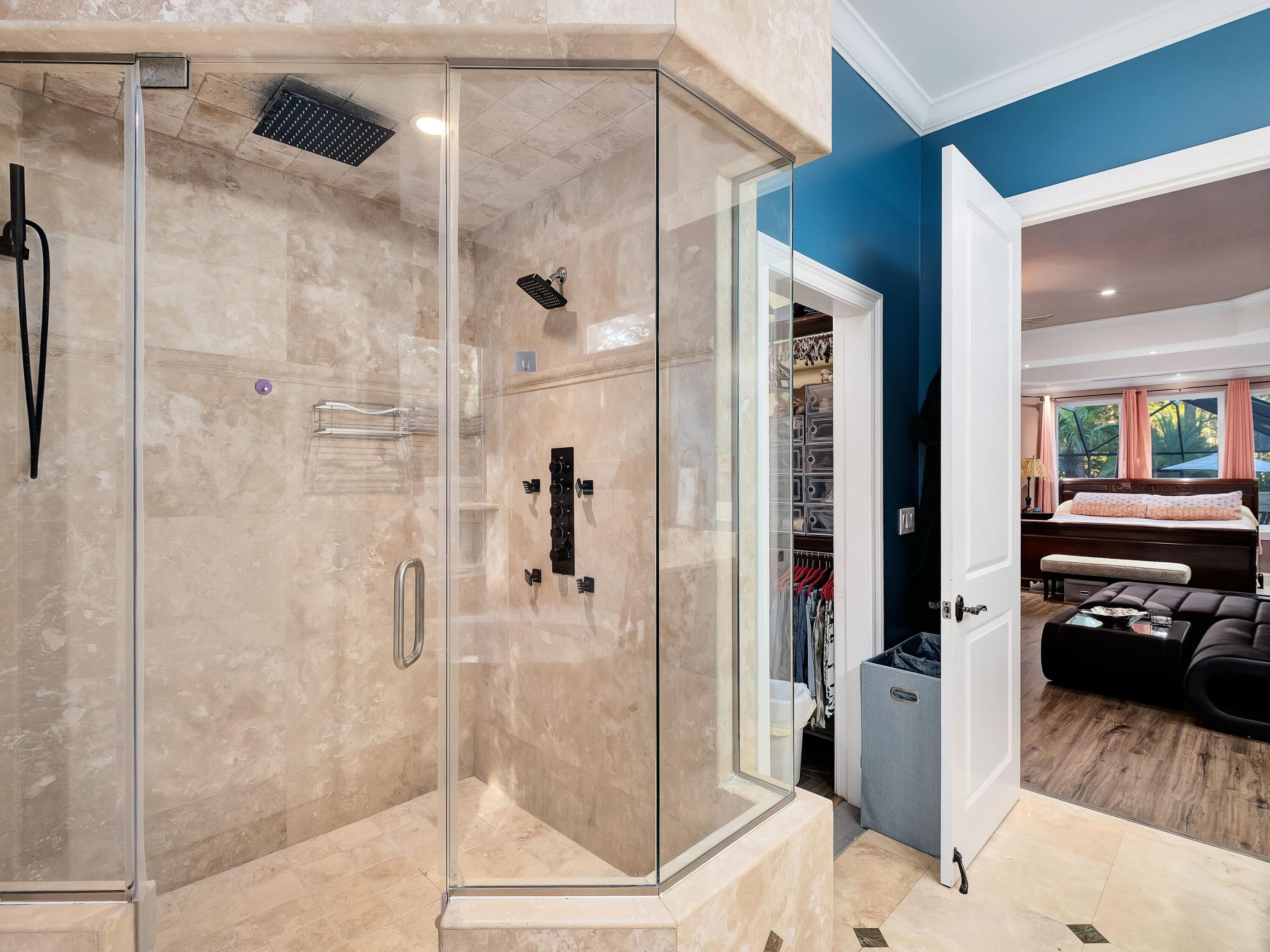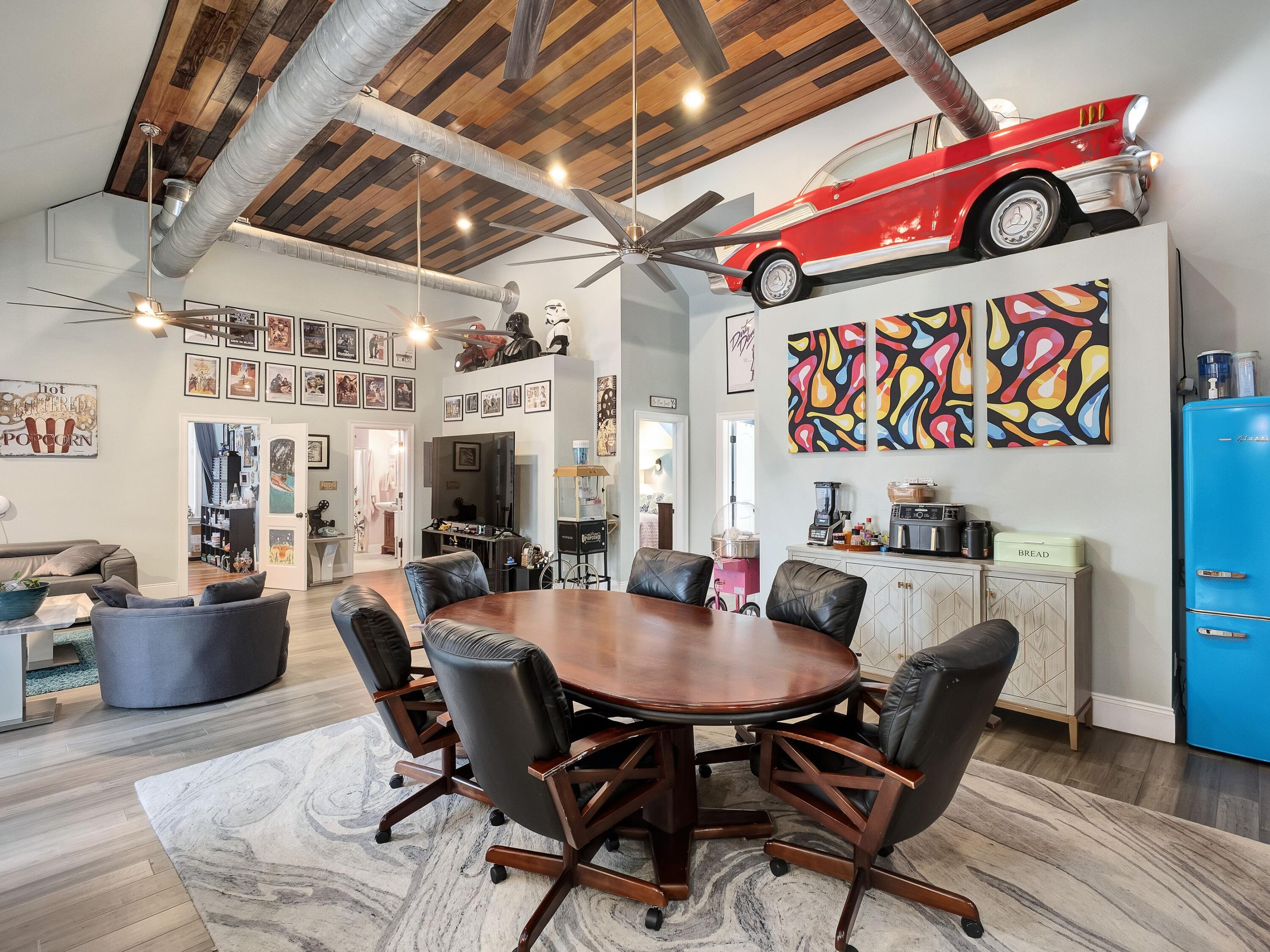 A vibrant bayou-front estate that blends luxury, personality, and pure fun. Set behind a private gate on 2.5 lush acres with 150 feet of bayou frontage, this one-of-a-kind property offers nearly 7,000 square feet of living space designed for entertaining, relaxing, and gathering. From its striking coastal-blue exterior and colorful architectural accents to its resort-style amenities, every inch of this home radiates character and warmth. Inside, generous living areas provide room for everyone perfect for large families, multigenerational living, or hosting unforgettable retreats. The main level features the primary suite and multiple gathering spaces that flow easily to the outdoors. Upstairs, a spacious second living area, game room with mini kitchen, balcony overlooking the pool, and additional guest suites create plenty of places to spread out. The attached guest houseconnected on the second floor but with its own private entryoffers a full kitchen and bath, ideal for guests seeking privacy or extended family visits. The outdoor living spaces feel like your own private resort, with a heated pool and spa under a screened lanai, a full outdoor kitchen and bar, and a pickleball/basketball court surrounded by mature landscaping. The private dock includes boat and jet ski lifts plus a rooftop viewing deckperfect for soaking in the bayou sunsets.