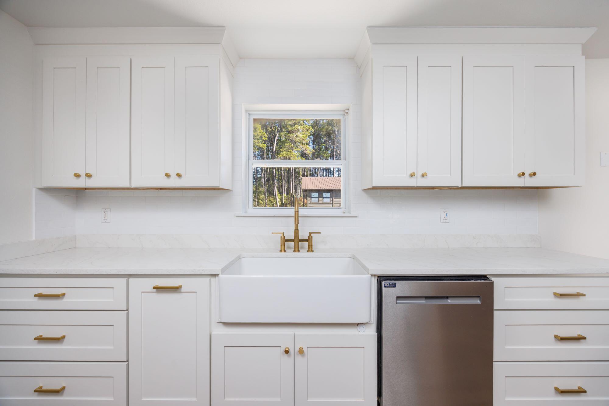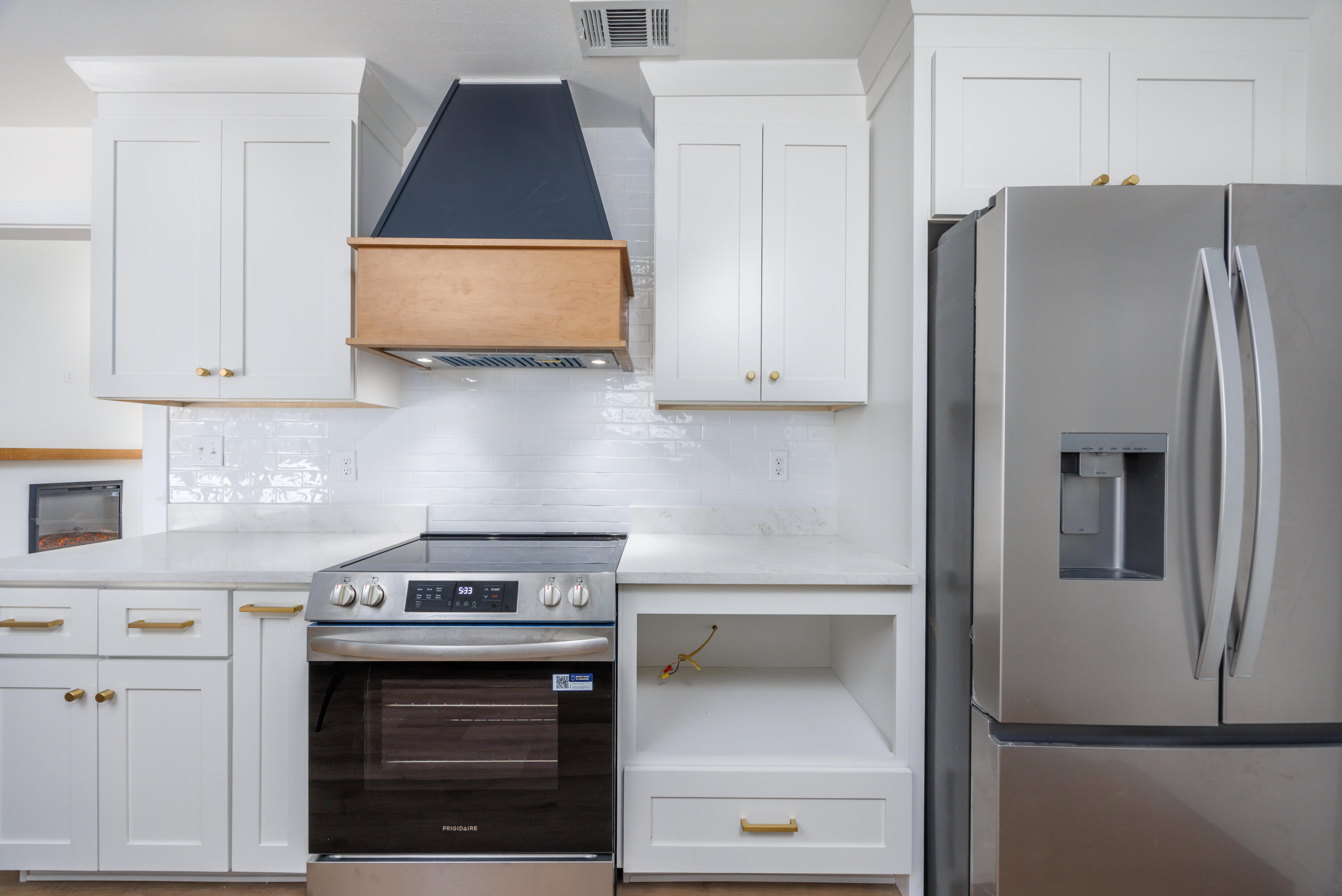 The beautifully updated kitchen is a chef's delight, offering white cabinetry, quartz countertops, stainless-steel appliances, a farmhouse sink, and brass fixtures. Hardwood flooring flows seamlessly throughout the home, creating a unified and elegant living space.