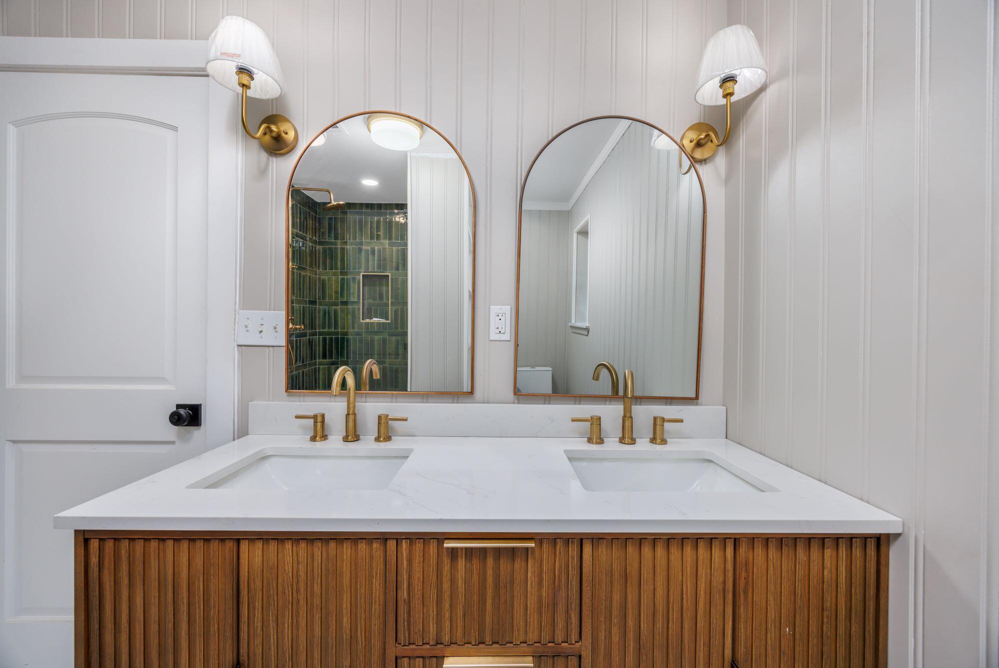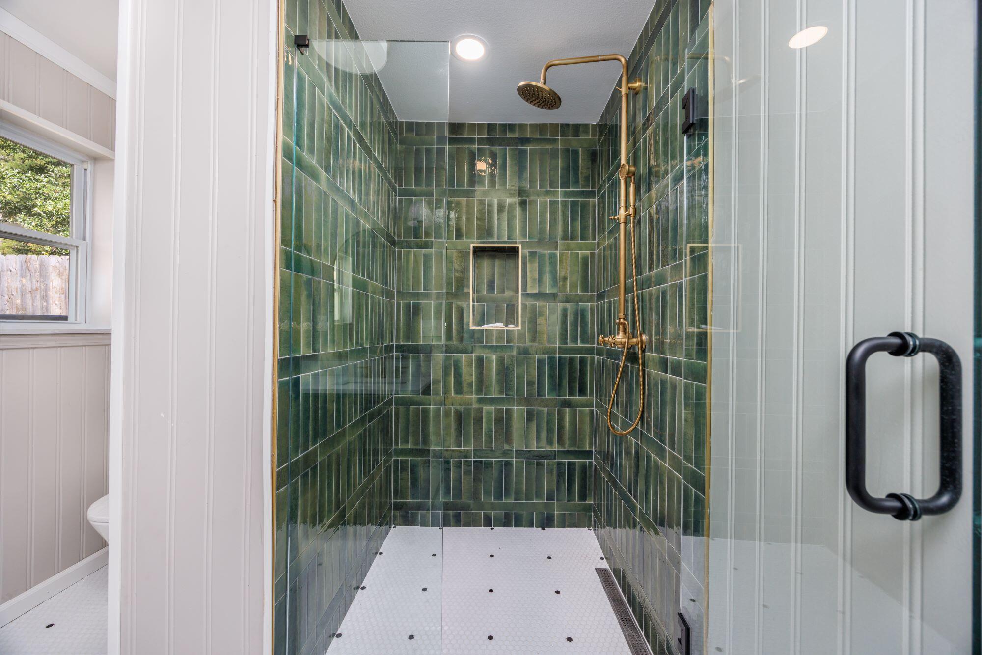 Bedrooms are generously sized with large windows overlooking the natural surroundings. Bathrooms showcase standout design, including a walk-in shower with iridescent teal tile and gold fixtures and another with stylish star-pattern flooring. With five total closets and a well-designed hallway layout, storage and functionality are abundant.