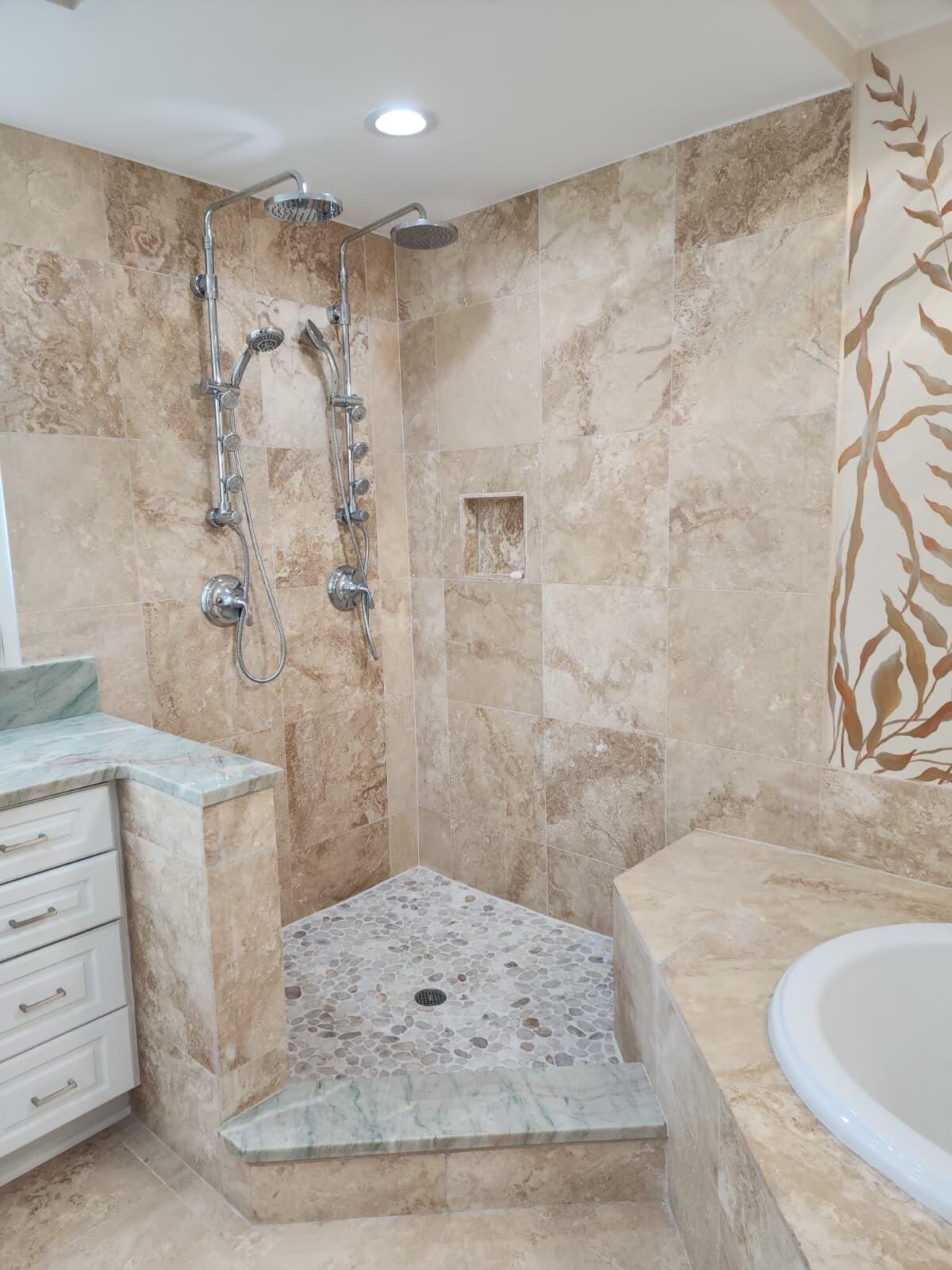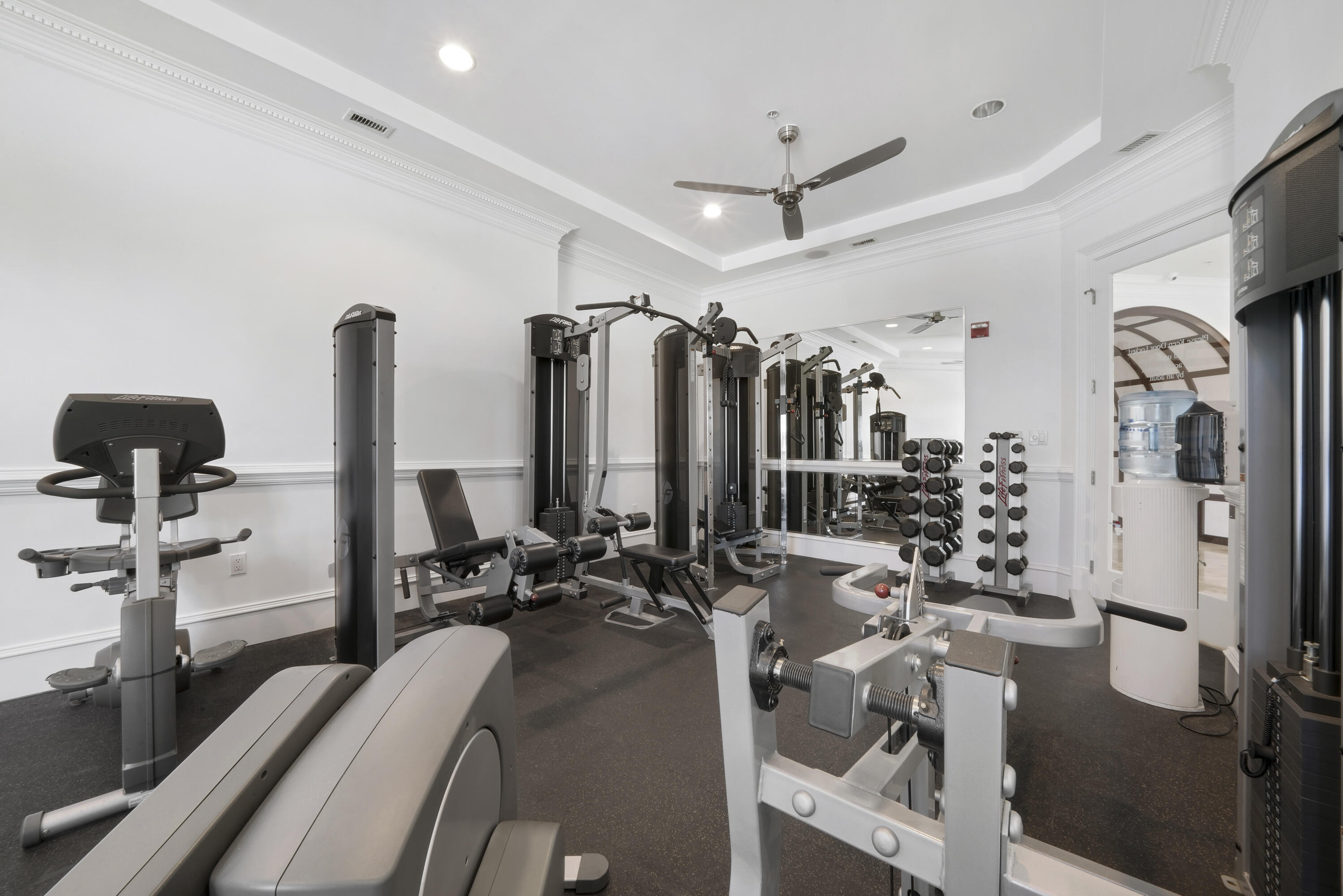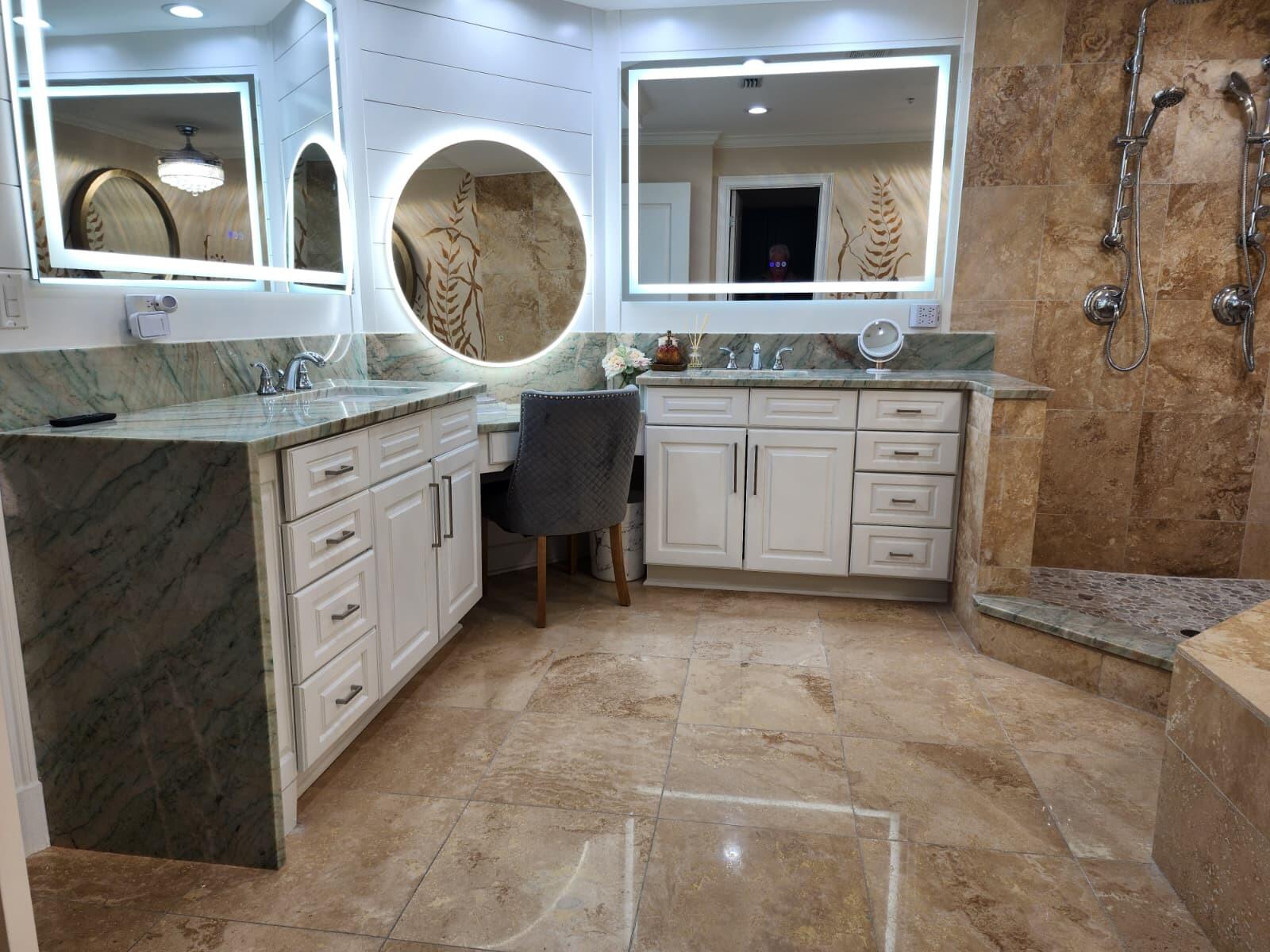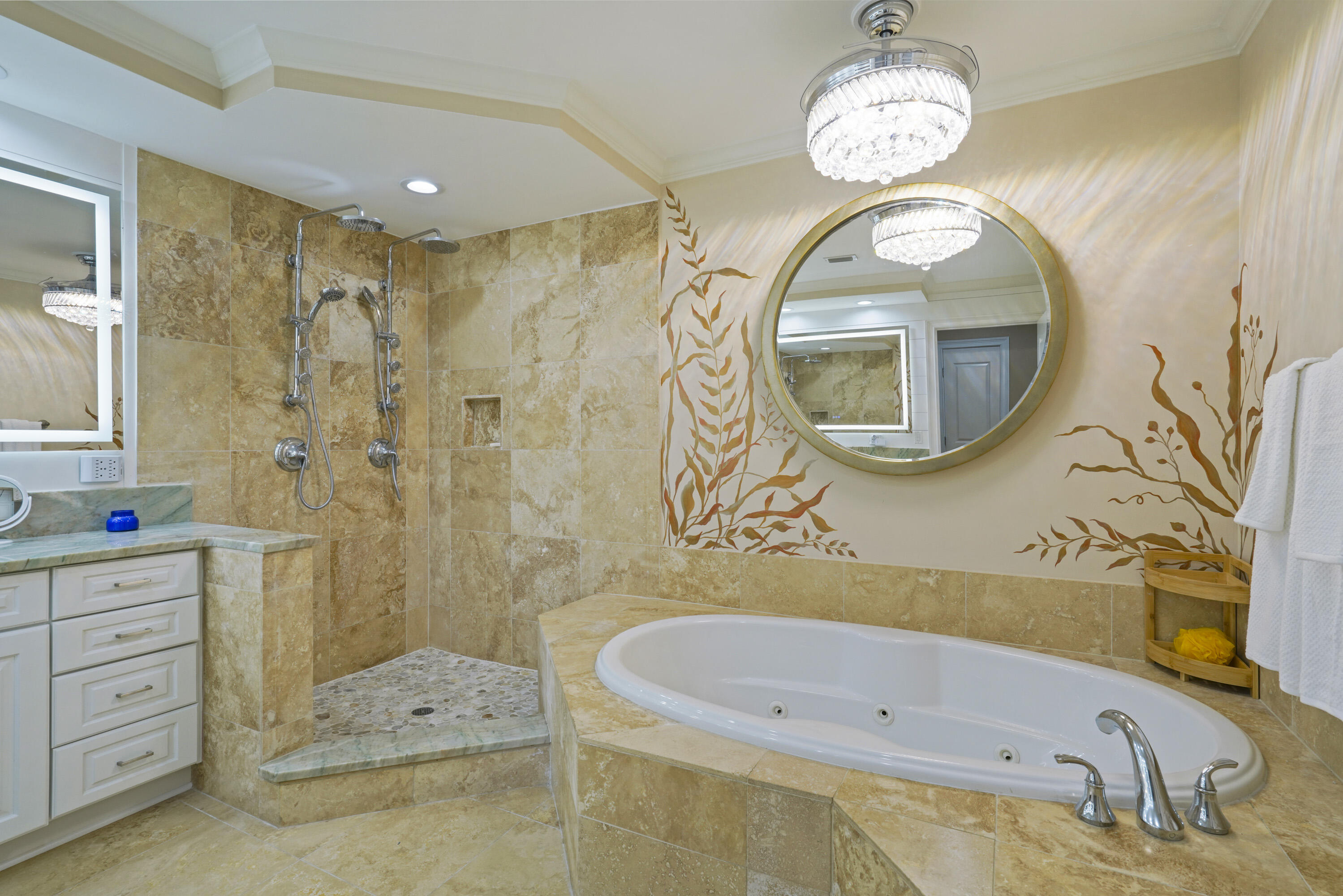 The Gulf-front Primary Suite is a private retreat showcasing tray and coffered ceilings, a relaxing sitting area, dual walk-in closets, and a built-in safe. The Primary Bath offers new dual vanities topped with cascading ALEXANDRITA QUARTZITE waterfall countertops, paired with new sinks and modern hardware for a refined, spa-like feel. A doorless walk-in shower with multiple spray options and a jetted soaking tub surrounded in travertine create the perfect retreat for relaxation. LED mirrors and a sparkling crystal chandelier with retractable fan blades elevate the space with style, while a separate water closet with an ergonomic-height toilet adds both comfort and privacy.
