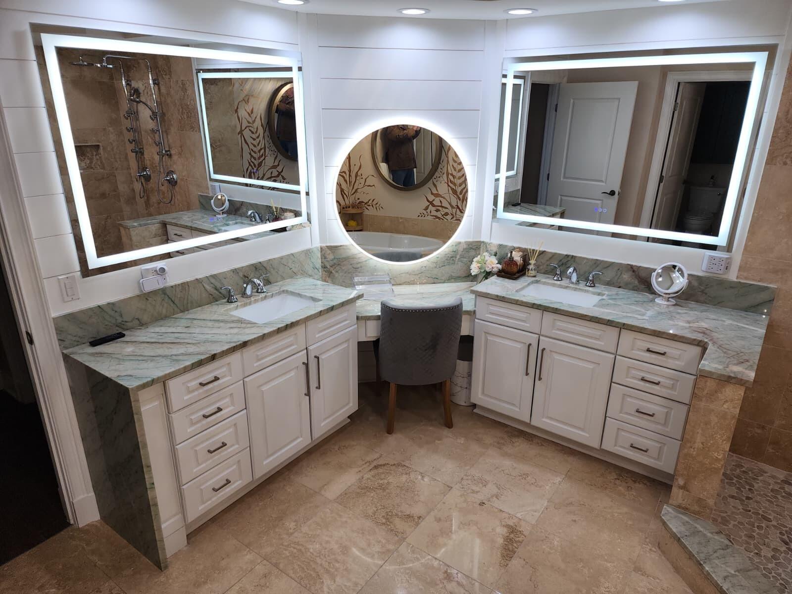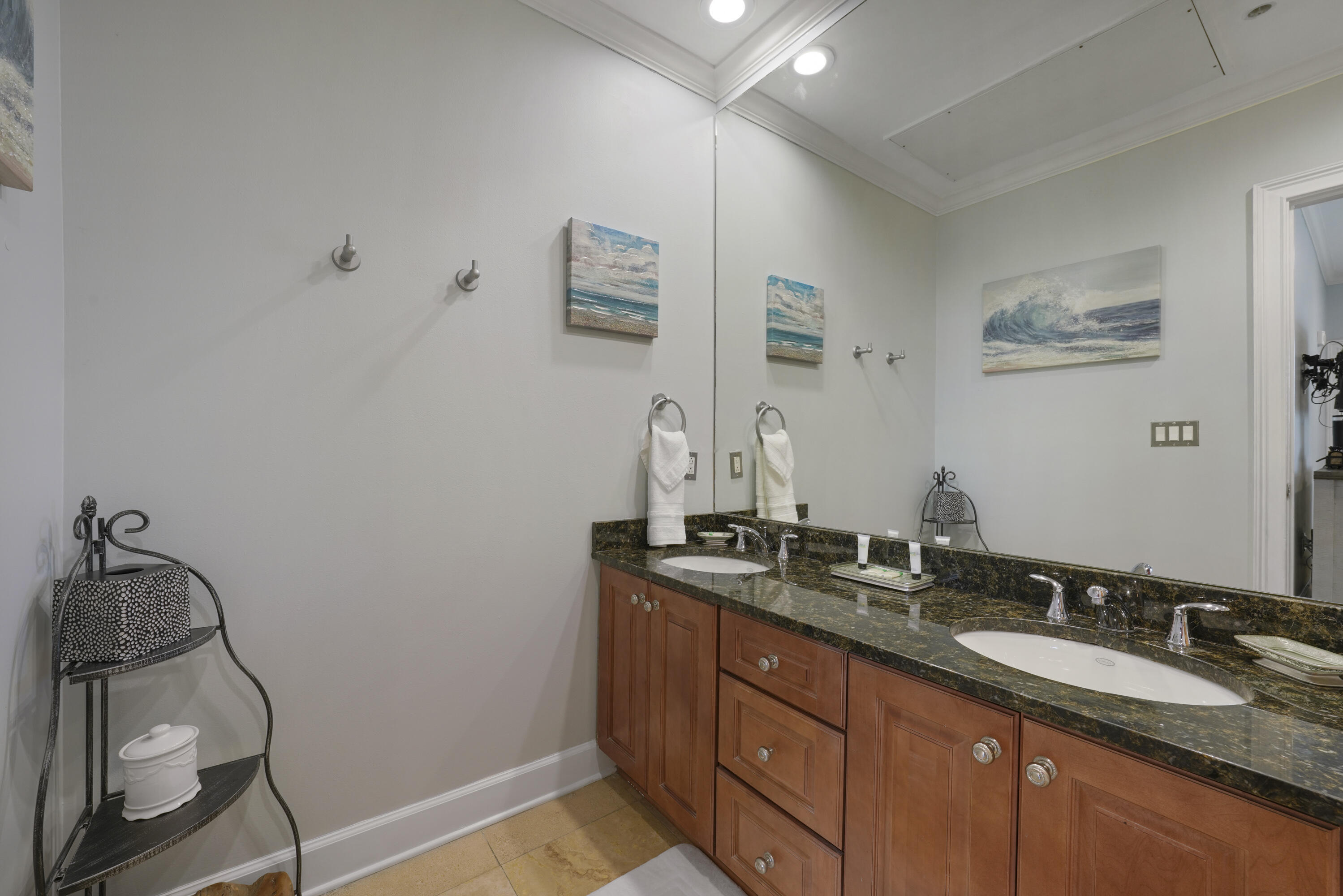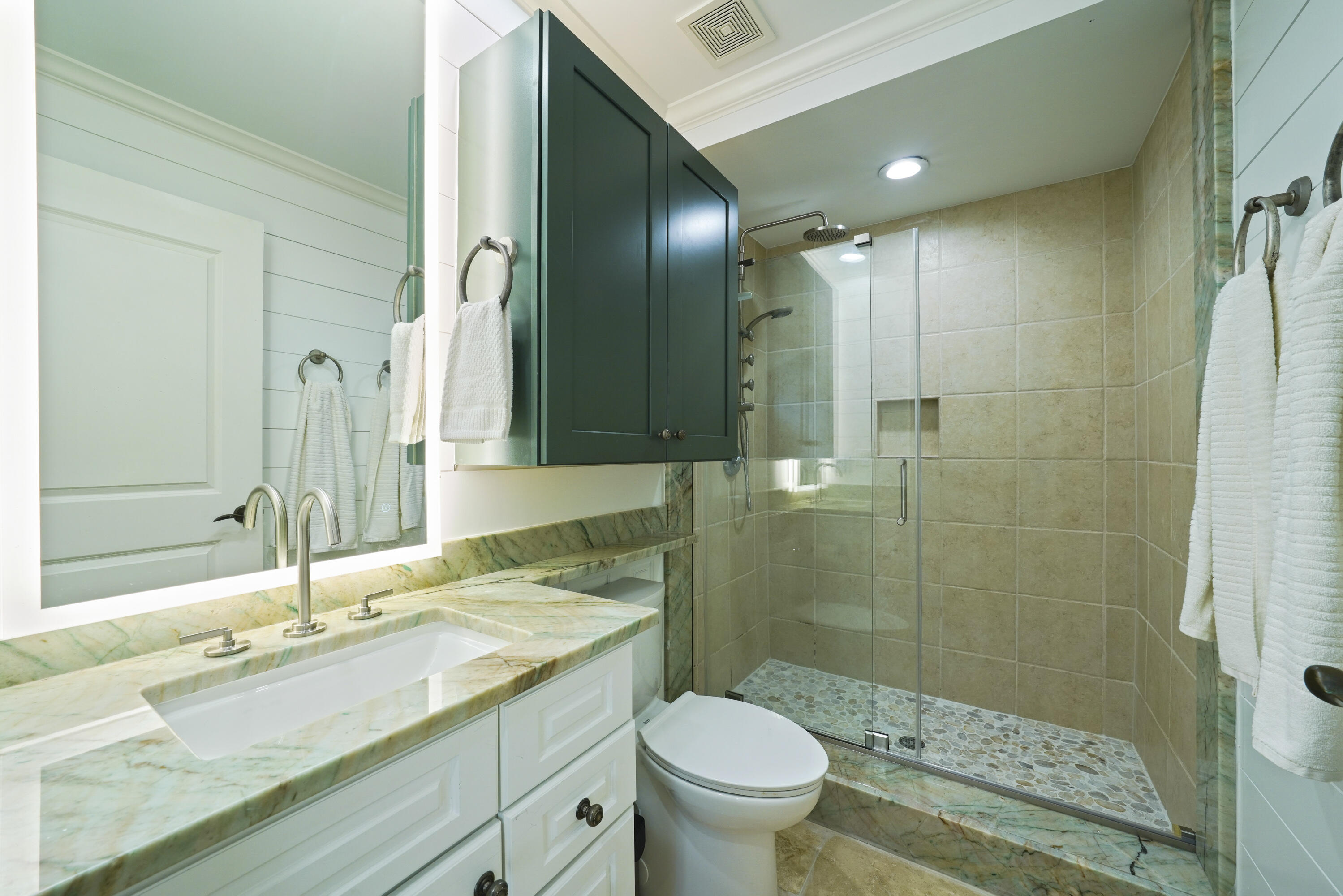 In addition to the Primary Suite, the Gulf-front Guest Suite offers stunning views of the emerald waters, complemented by thermal-tint windows for added ease. Its updated bath features a custom ALEXANDRITA QUARTZITE banjo-style countertop with upgraded sink and fixtures, a contemporary LED mirror, a frameless glass shower with a multi-function showerhead, and an easy-access toilet.