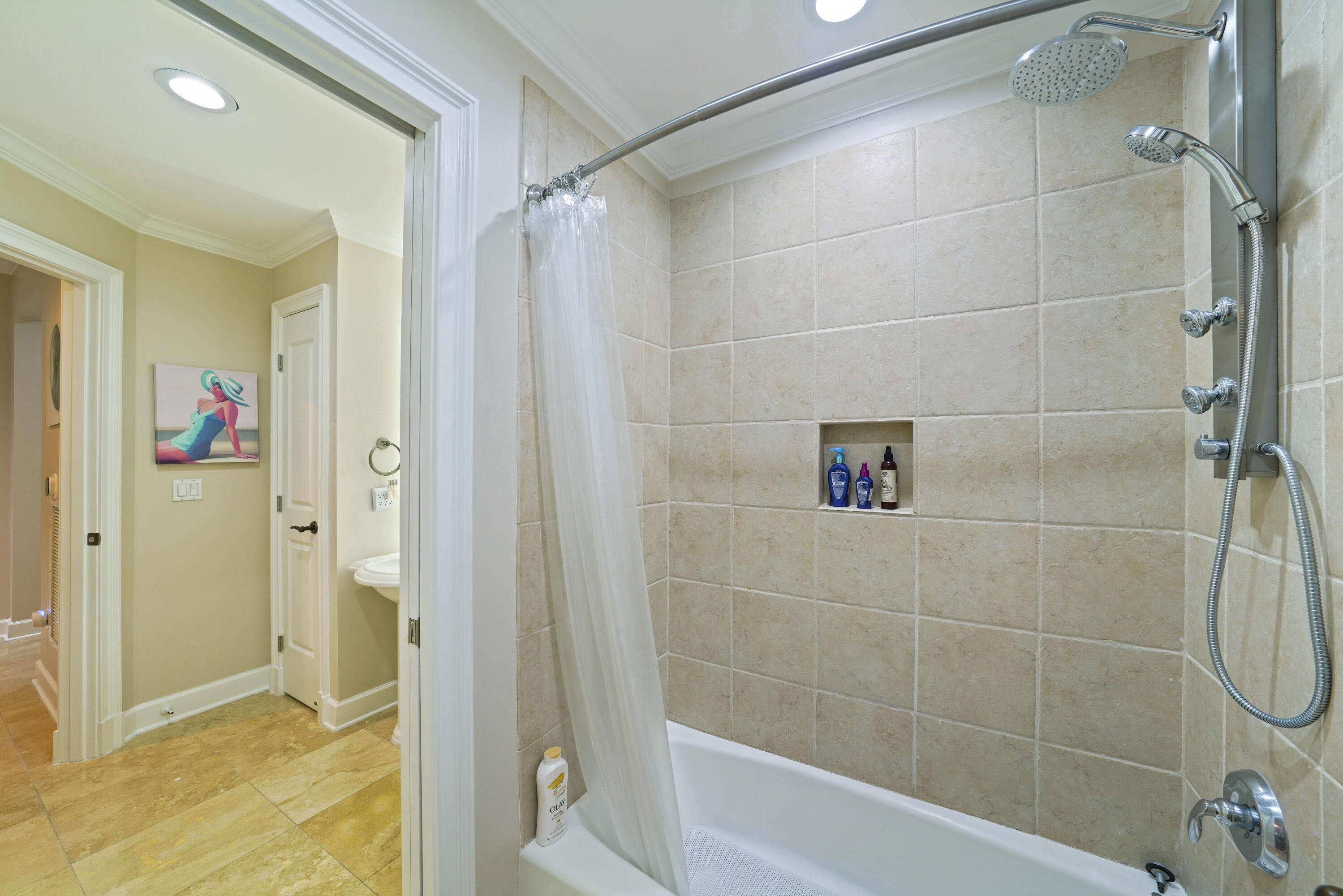 A second Guest Suite highlights elegant ceramic tile "faux" hardwood flooring, custom closets, and energy-efficient tinted windows for eco-friendly and relaxation. The en suite bath, which also serves as a powder room, offers a versatile multi-function showerhead, a modern LED mirror, and an elevated toilet for ease of use.