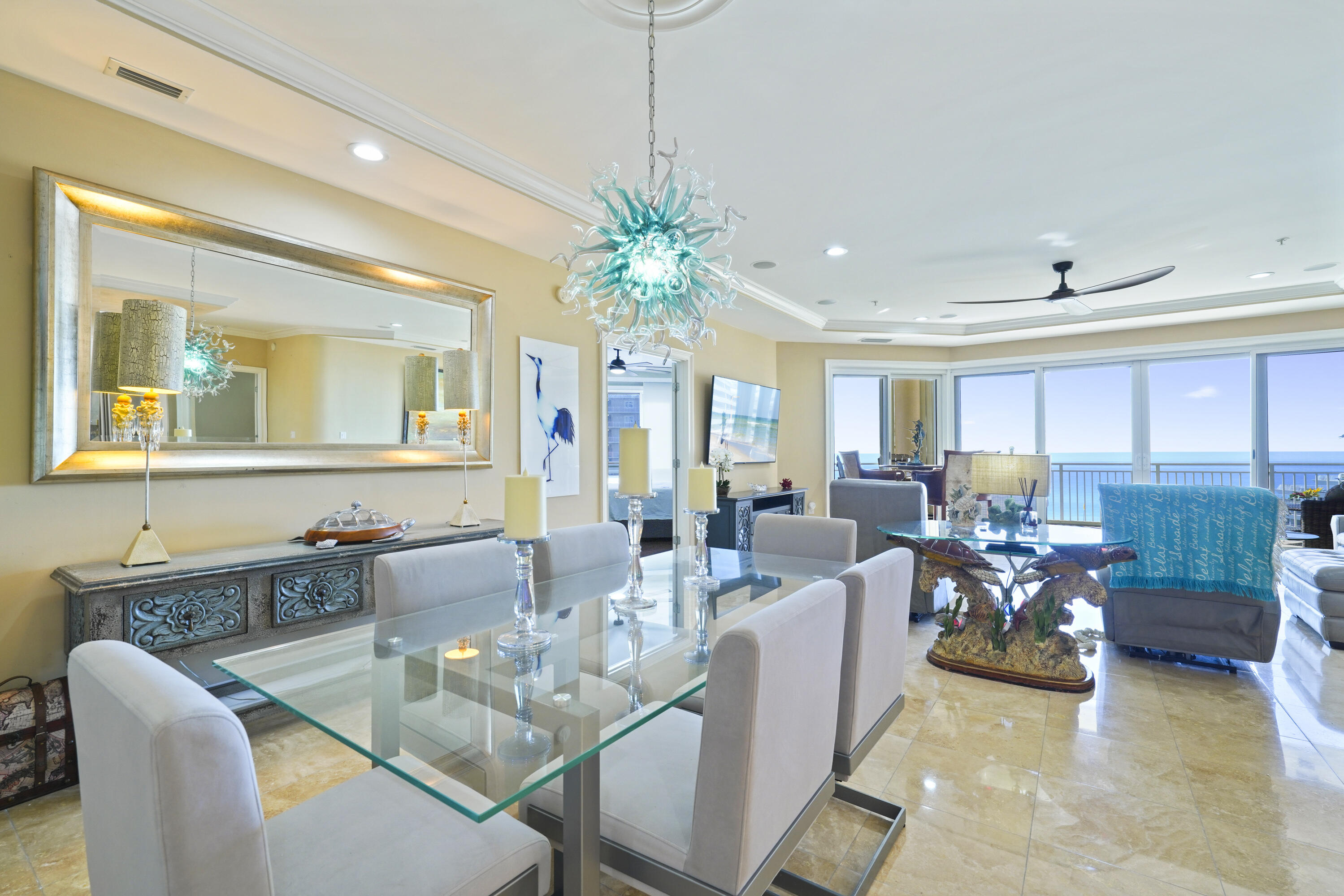 Experience the coastal lifestyle at its finest in this beautiful, rental-restricted 3 bedroom, 3 bathroom villa, perfectly situated in the heart of Miramar Beach. Offering 2,490 square feet of elegant living space with breathtaking views of the Gulf, this villa combines refined style with everyday comfort. Perched on the 6th floor of Grand Dunes II; enjoying the perspective of an 8th-floor elevation; the views are absolutely stunning. The villa conveys fully furnished and turnkey, ready for immediate enjoyment, and represents the largest 3-bedroom floor plan available in Grand Dunes II. The semi-private elevator opens directly into your private foyer, enhanced with motion-sensor lighting and a dazzling Swarovski crystal chandelier. From there, the open concept living area unfolds with floor to ceiling windows that flood the space with natural light and frame uninterrupted views of the emerald waters. Notable design features include soaring 9.5' ceilings, travertine flooring throughout main spaces, ceramic "faux" hardwood in bedrooms, custom variable LED lighting, solid wood interior doors, sound attenuated interiors for quiet comfort, and wiring for audio/visual systems.