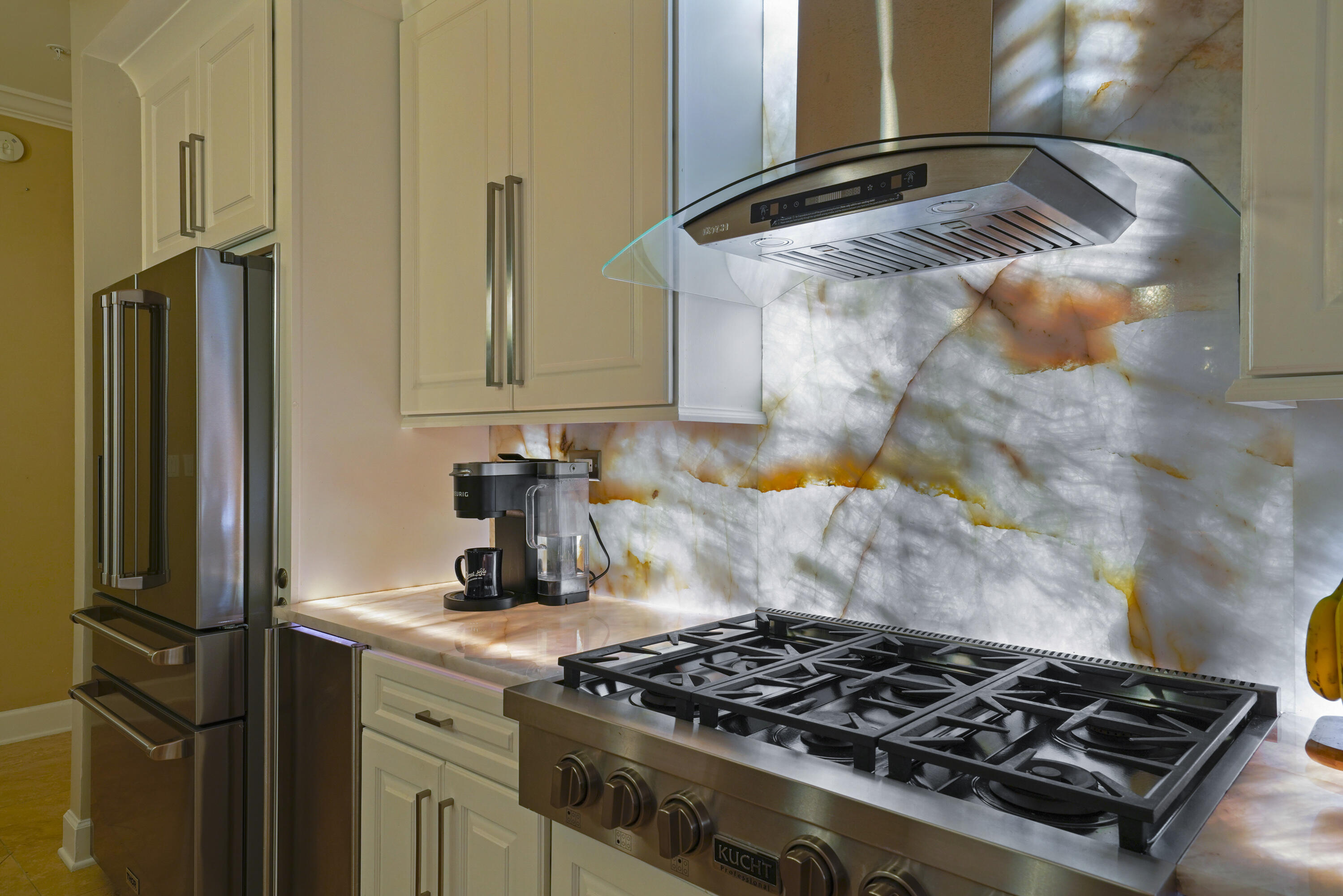 One-of-a-kind and truly remarkable, this Kitchen showcases a rare and breathtaking 8.5' CRISTALITA QUARTZITE island and bar; an extraordinary natural stone prized for its translucent crystalline beauty. Under-lit with integrated LED lighting, the surface radiates a luminous glow, creating a dramatic effect that is simply impossible to capture in photos and must be experienced in person. The CRISTALITA QUARTZITE continues seamlessly into the backsplash, where dramatic backlighting creates a striking and unique effect. Surrounding this centerpiece, the chef's kitchen features top-of-the-line professional-grade stainless steel appliances, including a natural gas 6-burner cooktop. Custom cabinetry with soft-close drawers and pull-down shelving enhances both elegance and functionality, while hand-blown pendant lighting by a regional artisan and a masterfully faux-finished ceiling complete the blend of performance, luxury, and design.