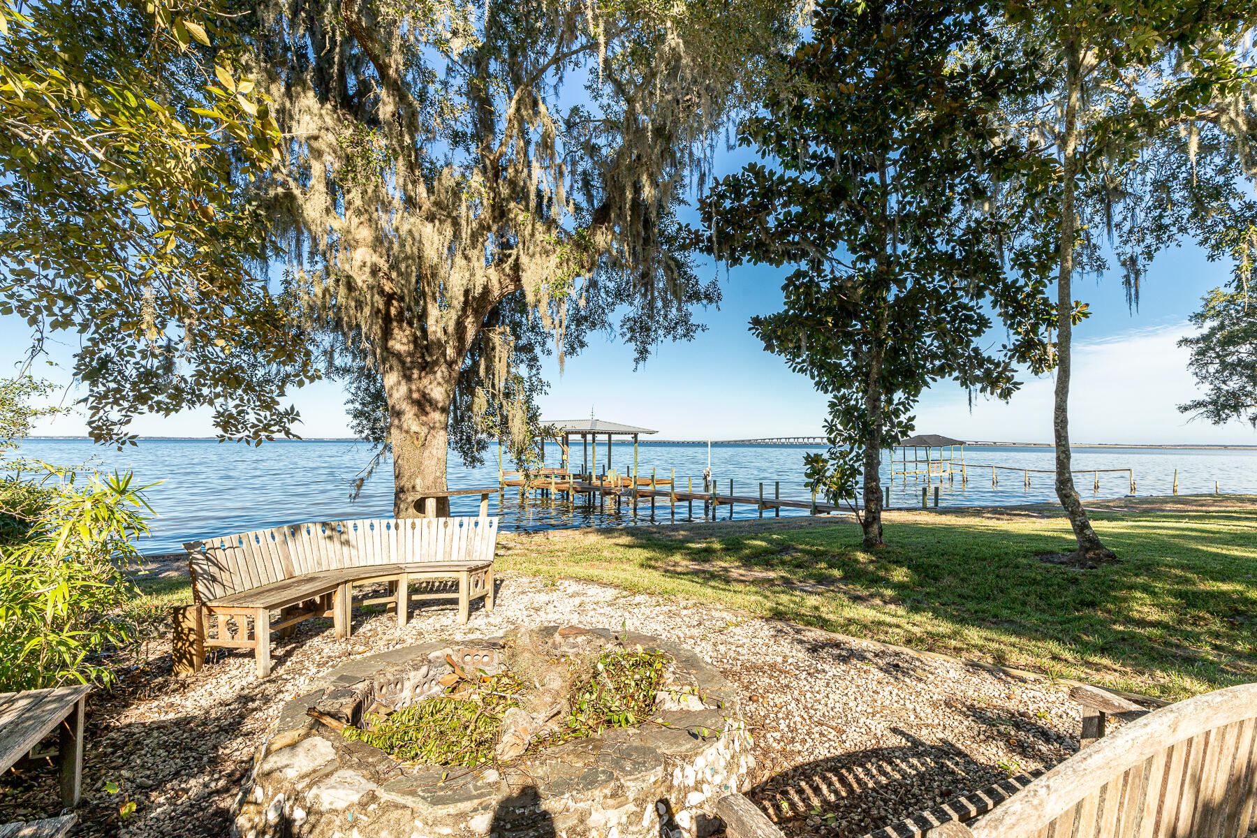 Featured in HGTV magazine in 2013, this big open water bay front property features 126ft of water frontage a large dock with boat house. The main house (1674) consist of three large bedrooms, three full baths, large living space with vaulted ceilings, windows galore that highlight the amazing a bay views, large dock and recently fortified seawall and rip rap. The back house (1676) features a large 1000 sq ft guest apt currently rented for $2000 a month, the lower level of the bak house features a large office space with two work bays and a powder room heated and cooled as well as 3 large storage areas. For a small business owner this owner this property is a one of a kind opportunity. Sold furnished, property grossed $91,000 in long term rental income for both homes combined.