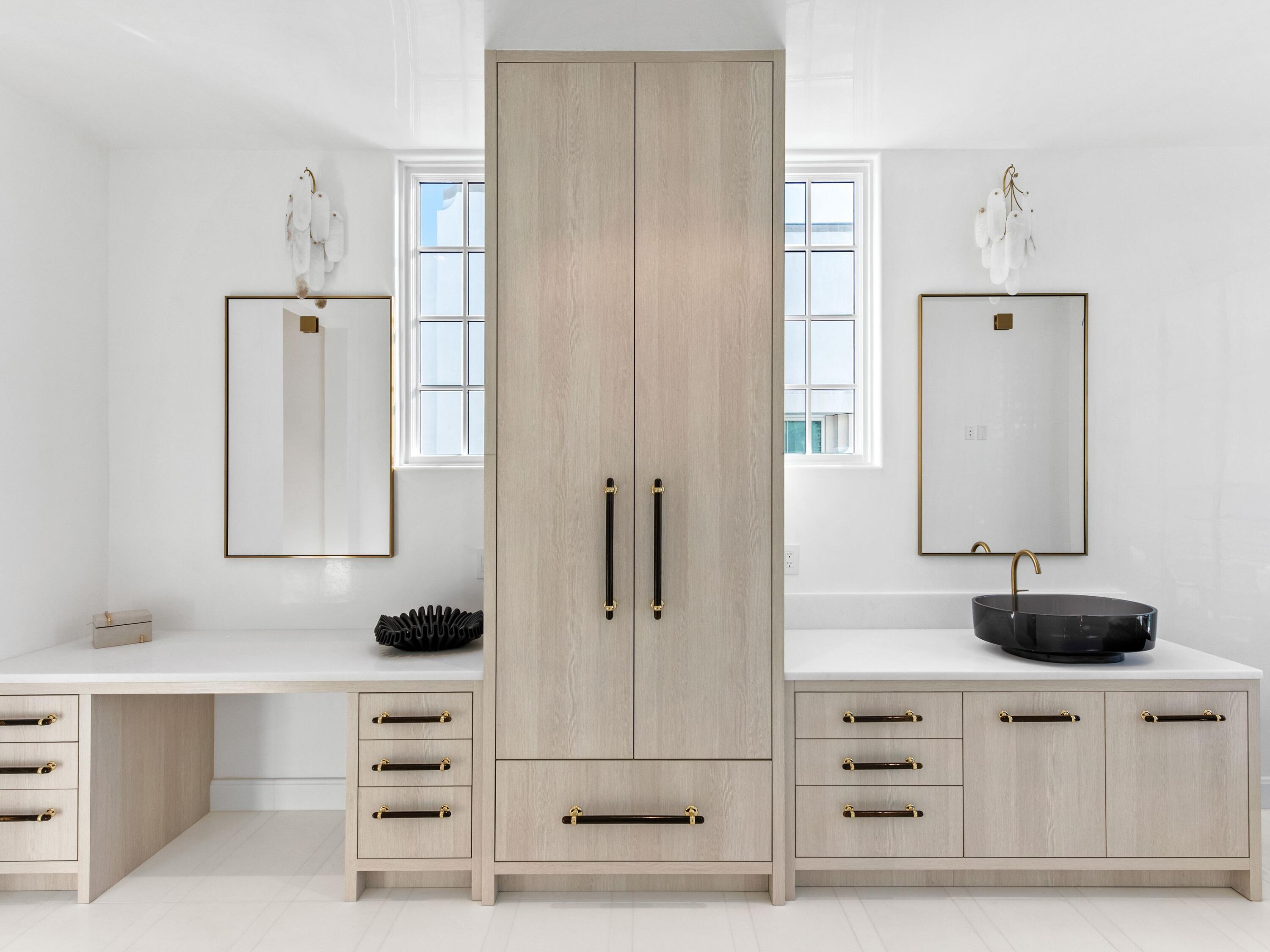 A secluded courtyard pool sets the tone on the ground level, offering a calm, cloistered retreat framed by Venetian plaster and stone. Guest suites, a lounge and bar, and a dedicated beach-entry laundry room turn the entire floor into a refined hospitality wing.