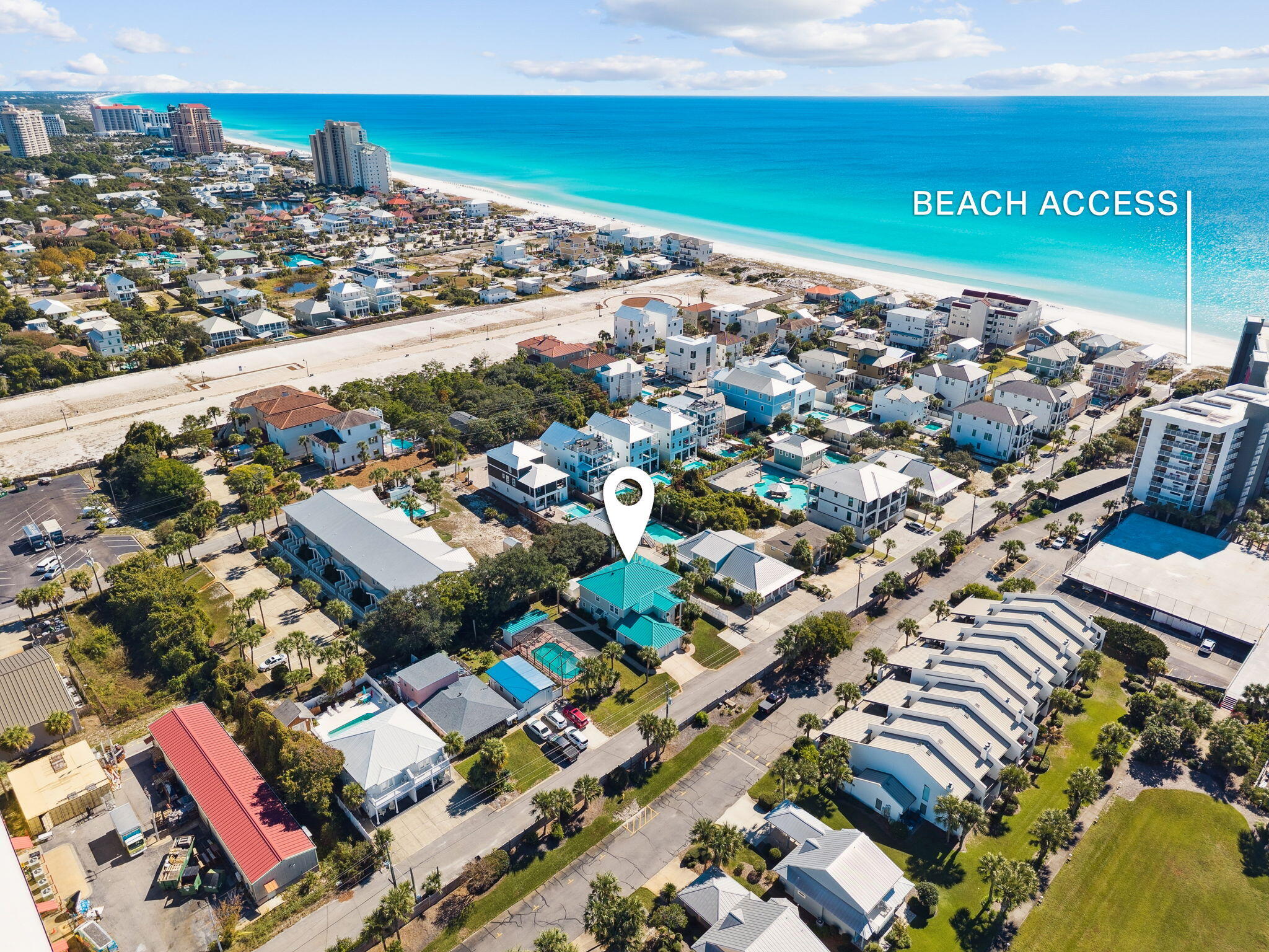 A rare opportunity to own a spectacular double lot in the heart of Miramar Beach. With two adjoining parcels, the property offers room to expand or build a second residence for guests, rental income, or future investment. Sitting approximately 32 feet above sea level, this elevated, private homesite features a custom, two-level, steel-constructed home in a gated community with deeded beach access. Inside are 5 bedrooms (including two primary suites), 4.5 baths, generous storage, an elevator, and both an upstairs full kitchen and a second kitchen on the lower level. Notable highlights include a fireplace in the upstairs primary suite, abundant natural light from expansive windows, a two car garage with a golf cart bay, and multiple outdoor living spaces, including a screened-in upper patio perfect for enjoying coastal breezes. Outside, the pool and cabana feature a kitchen, bathroom, and outdoor shower, ideal for entertaining, with irrigation systems on both lots adding everyday convenience. Ideally located near restaurants, grocery stores, and world-class shopping, this home blends comfort, coastal living, and unmatched accessibility.