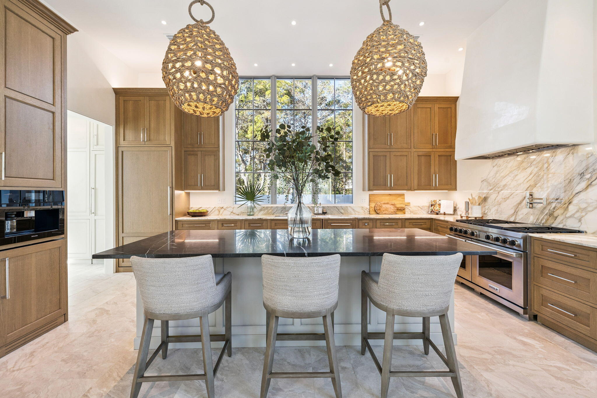 The chef's kitchen showcases Borghini marble surfaces and is equipped with a 48-inch Wolf dual-fuel range, Sub-Zero refrigeration columns, and a built-in Miele coffee system.