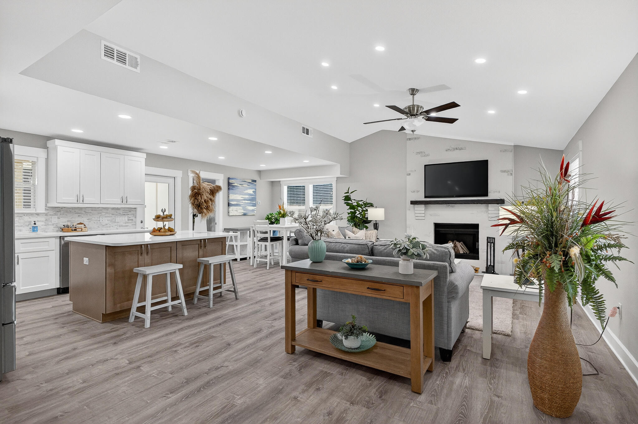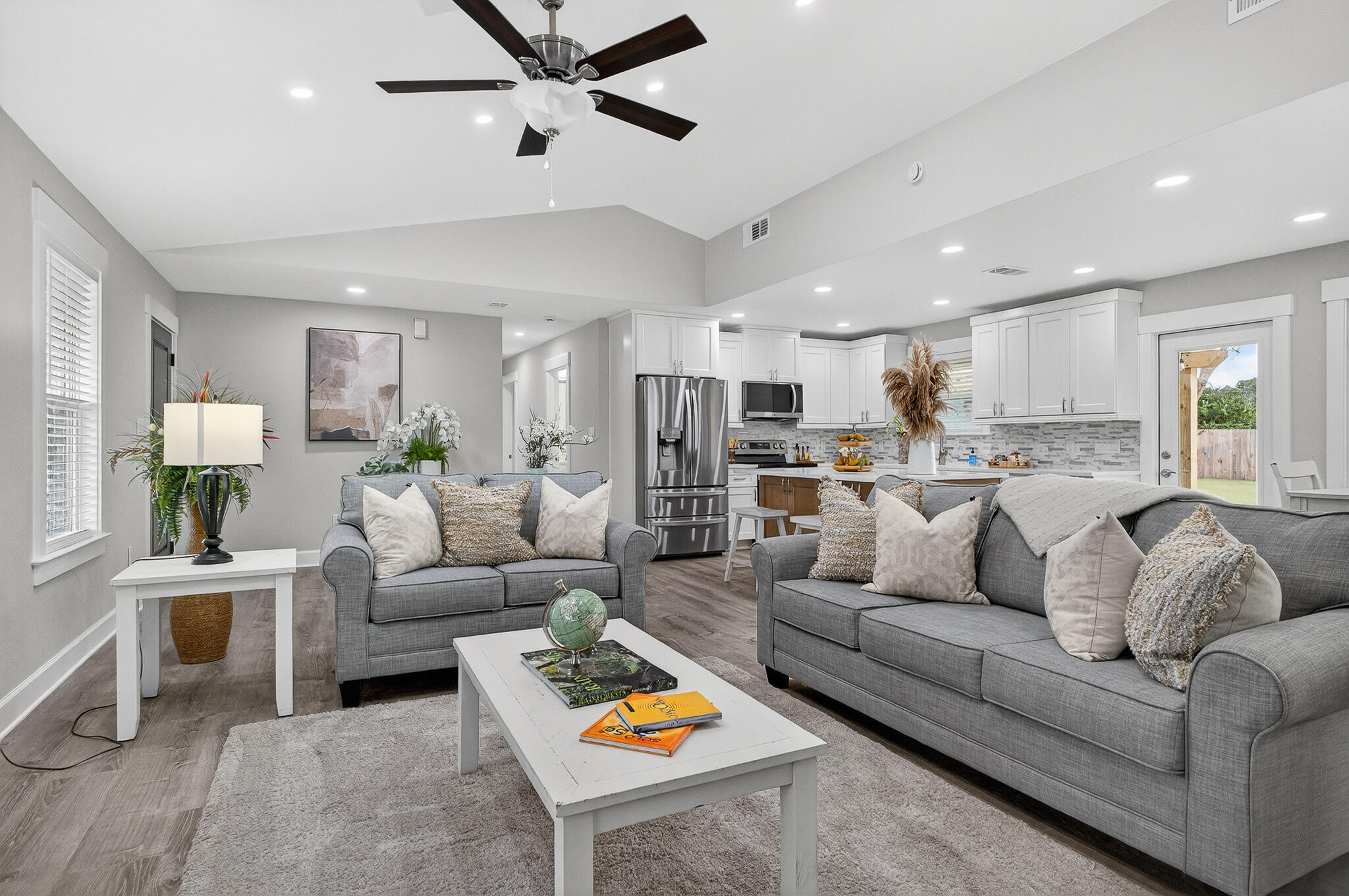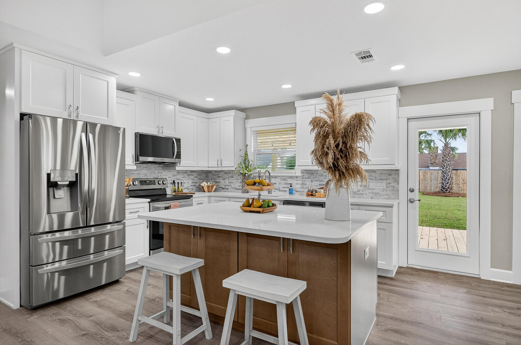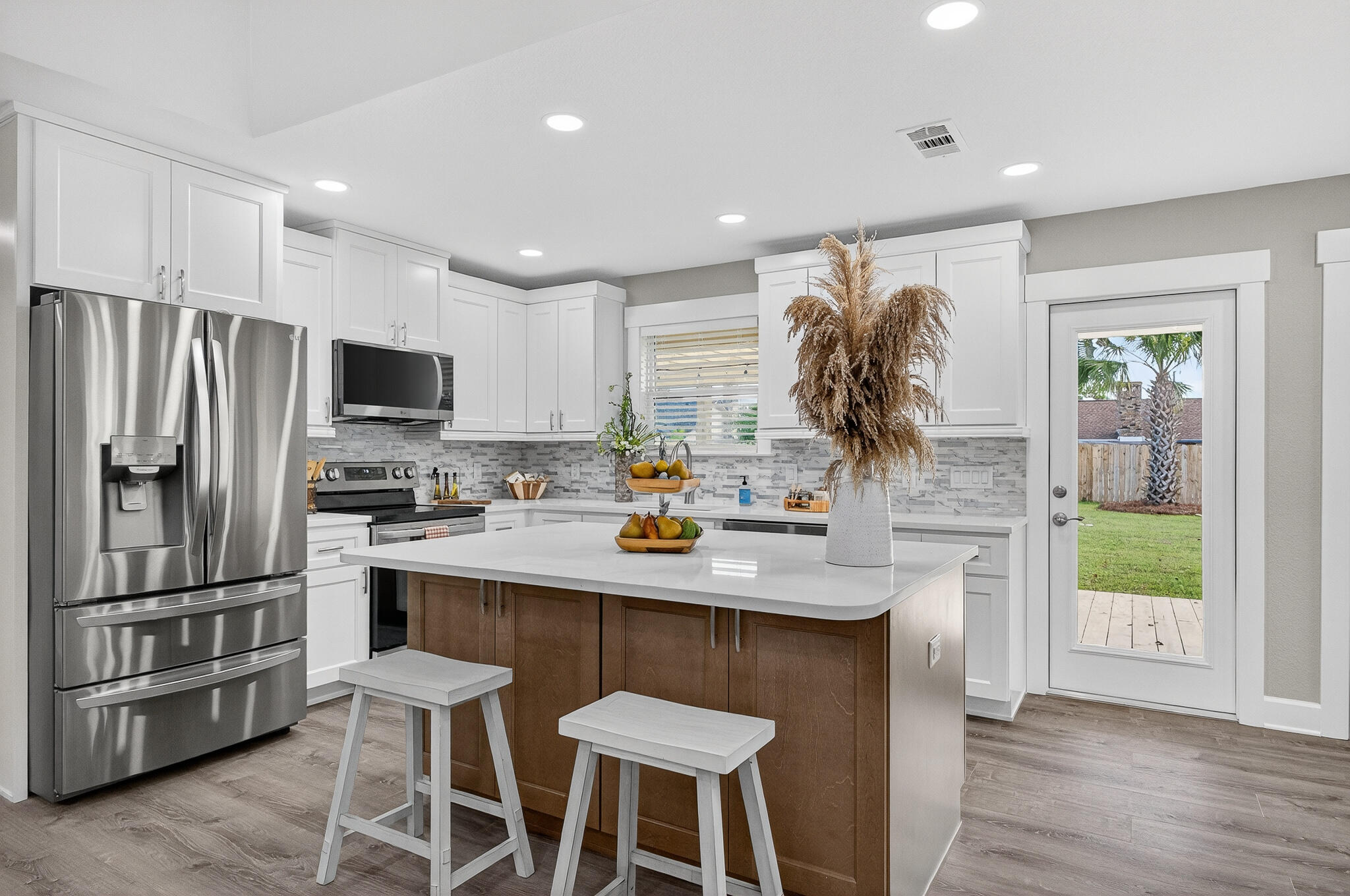 Charming and beautiful updated home within 2 miles of Hurlburt Field AFB. This stunning remodeled home offers stylish upgrades perfect for relaxing, entertaining, or simply enjoying every day in comfort and style. Step through the front door into a bright, open-concept living space with fresh paint, luxury vinyl plank flooring, and abundant natural light throughout. The fully updated kitchen includes new stainless steel appliances, quartz countertops, modern cabinetry, and a large island with seating--ideal for hosting guests or enjoying casual family meals. The home features 3 spacious bedrooms and 2 beautifully renovated bathrooms. Home has new roof, HVAC, water heater, windows, doors.The backyard is fully fenced and features new landscaping, creating a peaceful, low-maintenance retreat.