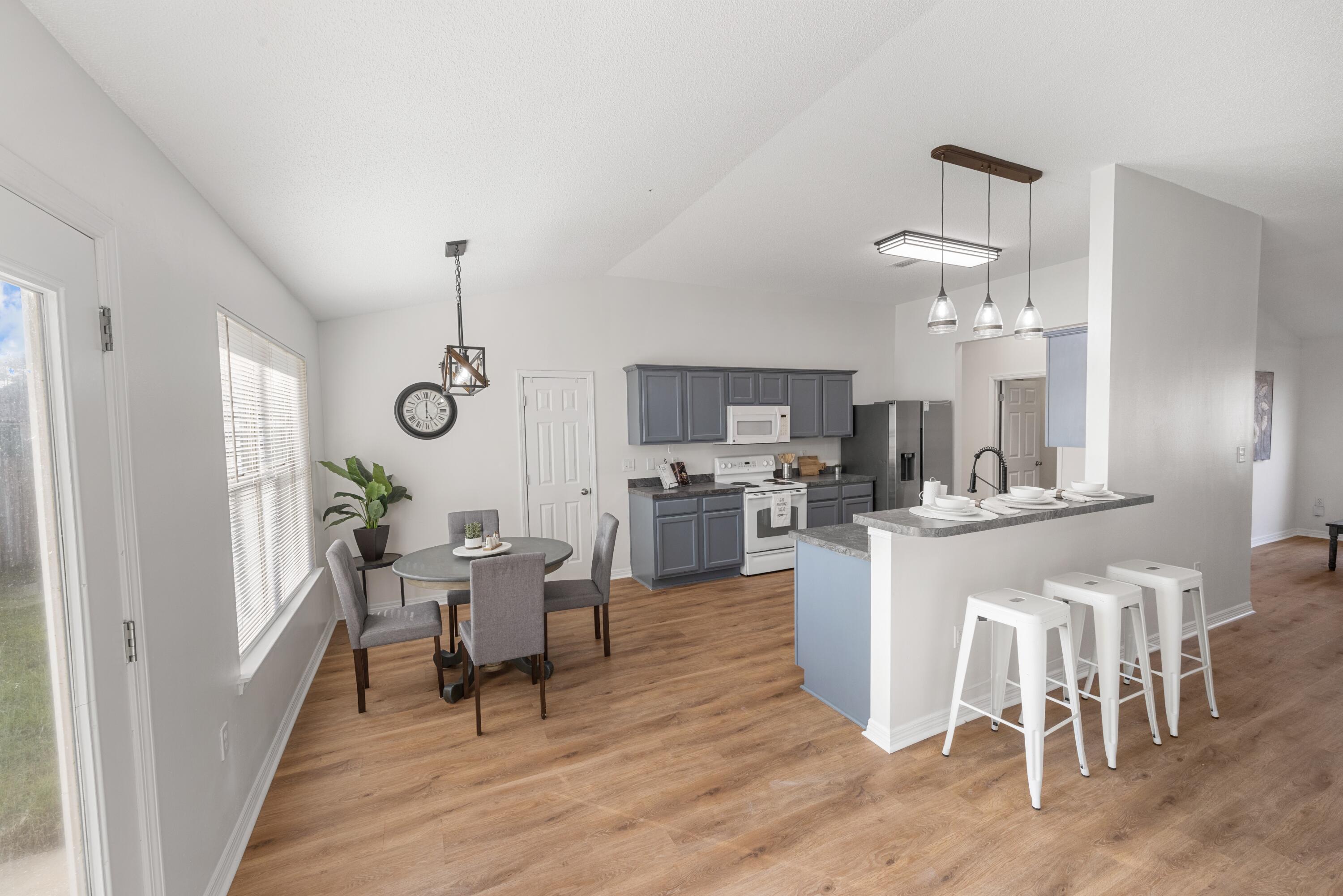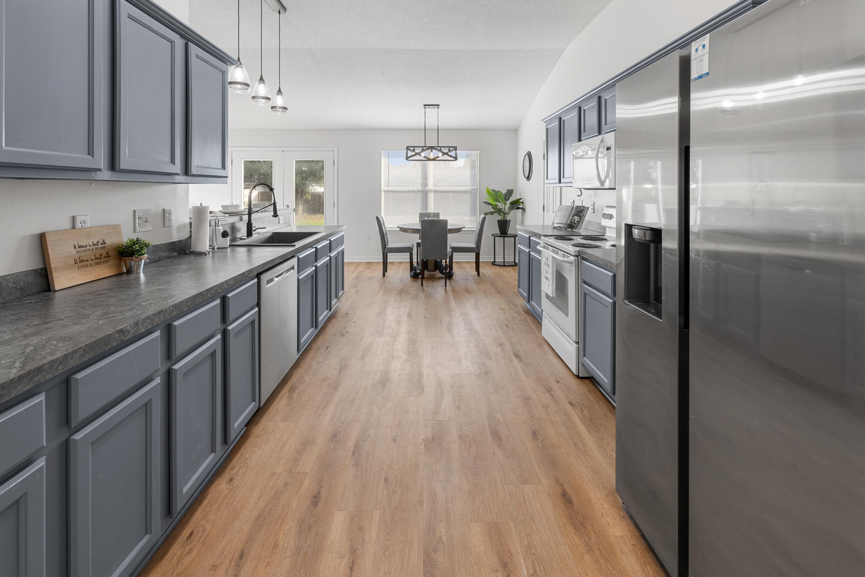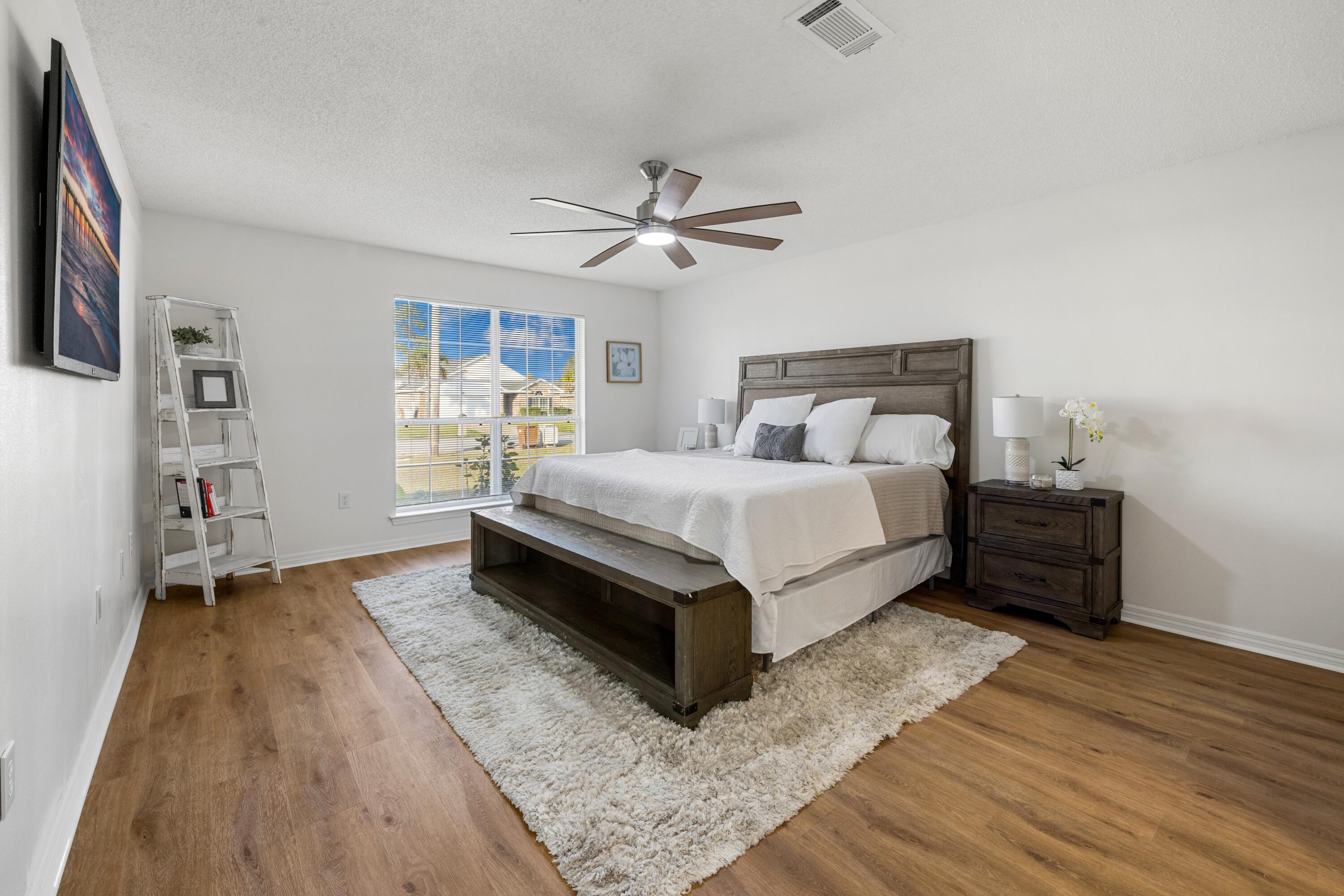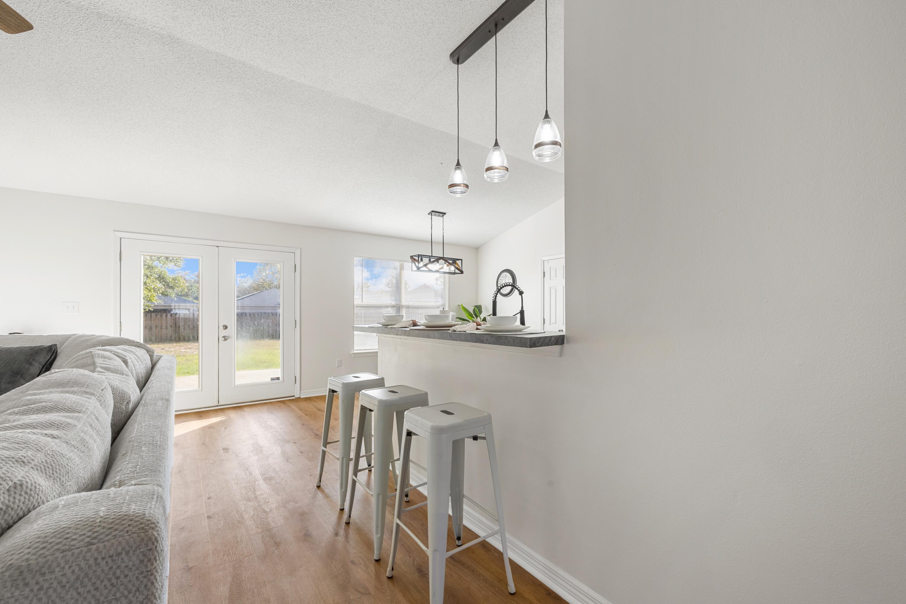 VA Assumable at 5.5%. This beautifully updated 3-bedroom, 2-bath home in Navarre offers an unbeatable location just a five-minute walk to Navarre High School and a ten-minute walk to the YMCA, with quick access to Publix, Walmart, and Hwy 87 for an easy commute to I-10. Major updates include a roof replacement in 2021, an HVAC system replaced in May 2023 with UV sanitization and a smart thermostat, and a termite bond added in October 2025. The interior features Stain Master 20-mil LVP flooring throughout, all new paint, high ceilings, and updated light fixtures, ceiling fans, and matching hardware and hinges on every door. The kitchen offers a functional layout with a breakfast bar, breakfast nook, and dedicated dining area, along with a black single-basin sink, pantry closet, and a garbage disposal added in January 2024. The primary suite includes both a walk-in and traditional closet, an updated master shower, and a double vanity. The second bathroom has also been refreshed with updated tile, vanity, mirror, and toilet. Additional conveniences include a large-capacity washer and dryer purchased in 2023 and garage shelving for organized storage. A fire hydrant located behind the home and a storm drain in the front yard provide added peace of mind, with no flooding issues. With its prime central location and extensive list of upgrades, this home offers comfort, convenience, and long-term value.