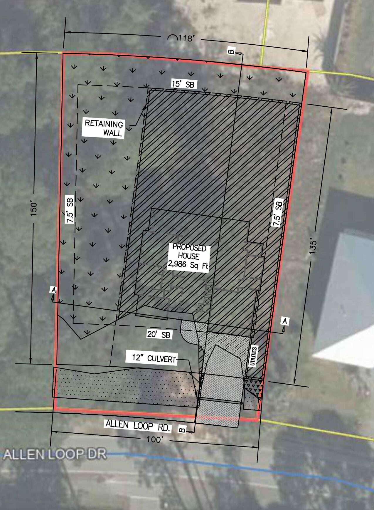 From Highway 98 turn south on Thompson Road and follow to 4 way stop on Allen Loop. Turn left and lot is 200 yards on left side.