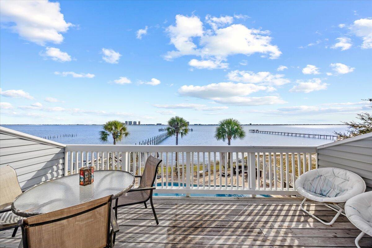 Experience coastal living at its finest in this beautifully maintained 2-bedroom, 3-bath waterfront townhome in the heart of Navarre. Situated directly on the sound, this residence offers breathtaking, unobstructed water views from the main living areas and primary spaces. Step inside to an inviting open layout featuring tile and hard-surface flooring throughout, ideal for low-maintenance living. The spacious kitchen boasts solid wood cabinetry, stainless steel appliances, glass-front uppers, and an oversized breakfast bar perfect for entertaining. Large windows along the back of the home fill the dining and living areas with natural light and showcase the sparkling blue water just steps away Upstairs, both bedrooms offer generous closet space and private bathrooms. A third full bathroom on the main level adds convenience for guests. Major systems are recently updated, including a newer roof (approx. 4 years) and HVAC (approx. 3 years) for peace of mind.