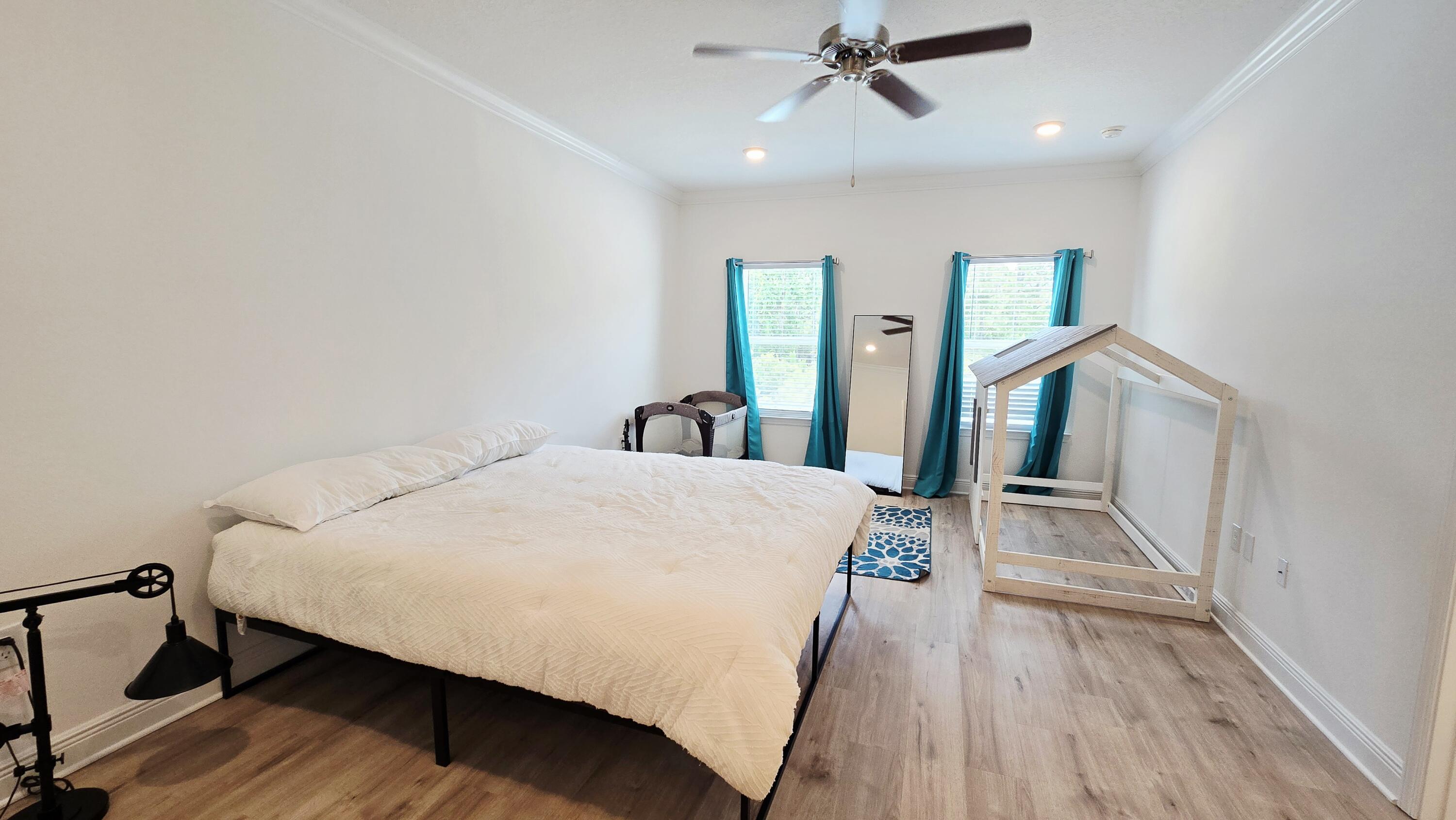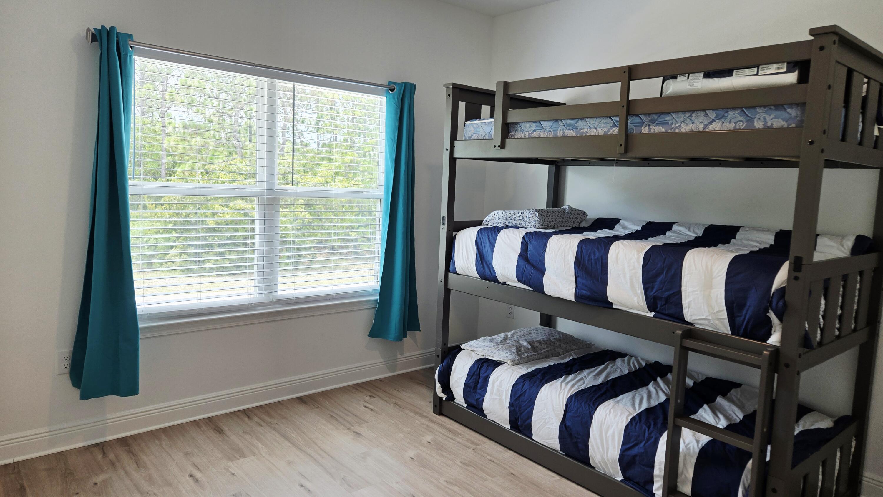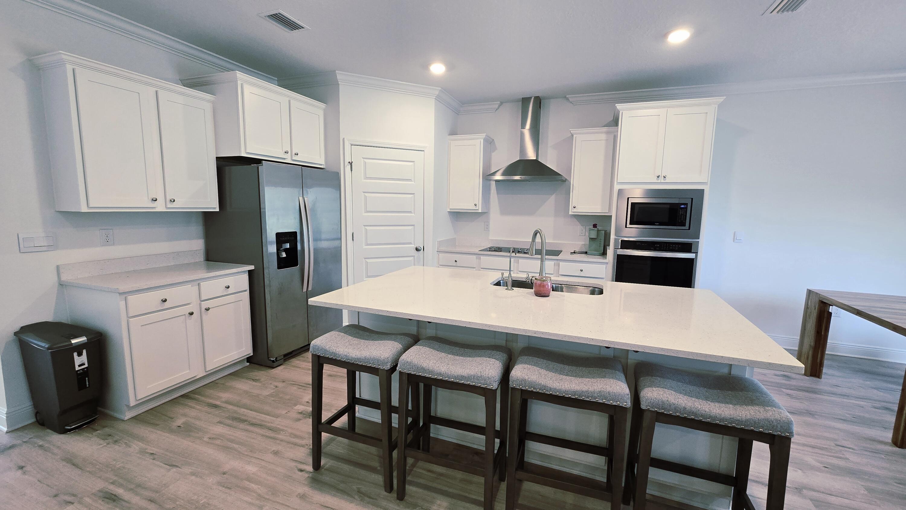 This beautifully designed 5-BEDROOM, 3-BATH HOME in Panama City Beach was built in 2023 and offers 2,556 SQ. FT. of MODERN COASTAL LIVING less than a mile from the Gulf. The thoughtful floor plan includes a CONVENIENT FIRST-FLOOR BEDROOM, ideal for guests or multi-generational living, and a VERSATILE BONUS LOFT UPSTAIRS that can serve as a home office, media room, or play space. Inside, you'll find LUXURY VINYL PLANK FLOORING, QUARTZ COUNTERTOPS, and IVORY SHAKER CABINETRY throughout, paired with 9-FOOT CEILINGS downstairs for a bright, open feel. Enjoy evenings on the COVERED BACK PORCH, while Hardie siding and a full irrigation system keep maintenance simple. A TWO-CAR GARAGE, spacious pantry, and MODERN TILE SHOWER add everyday comfort.
