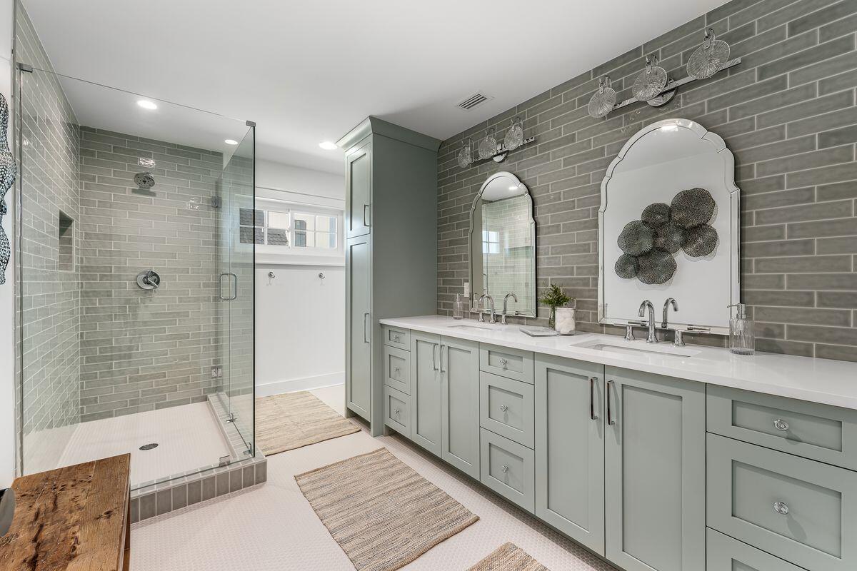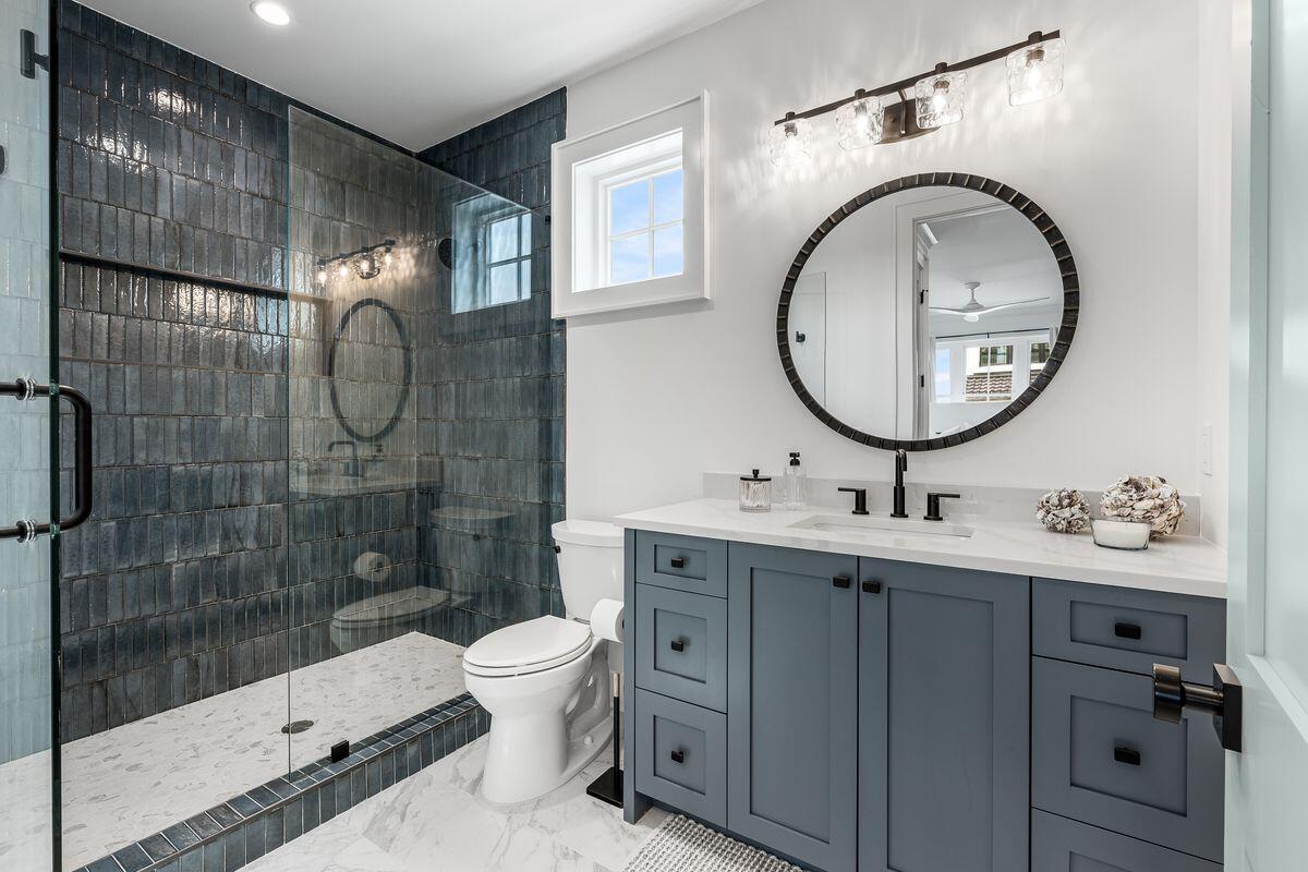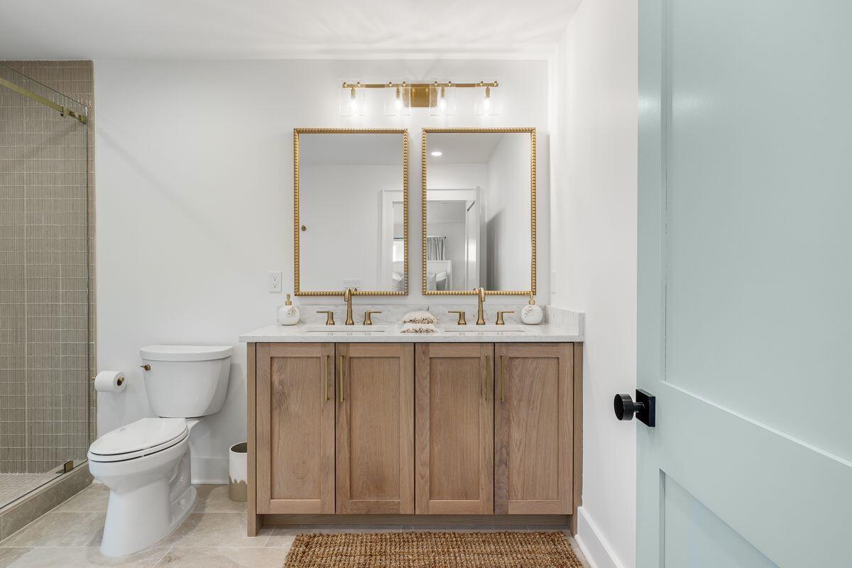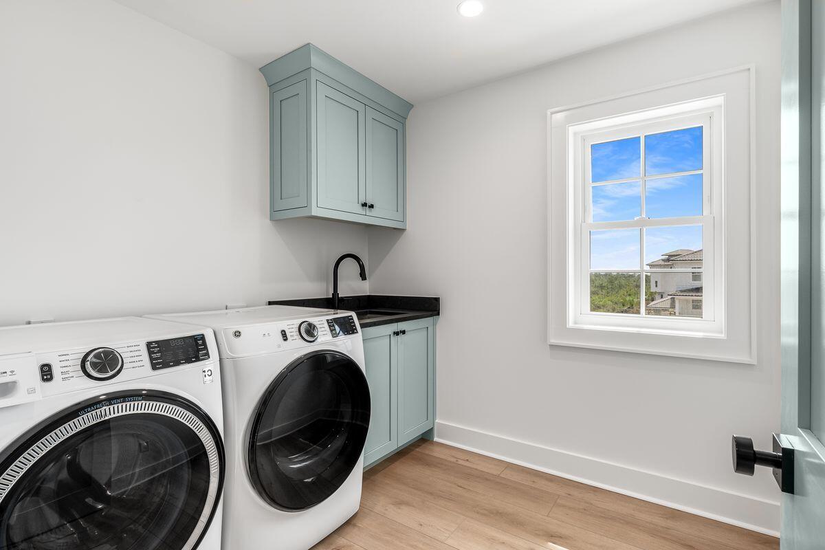Upstairs, two primary suites offer private balconies and spa-like baths with walk-in showers and double vanities. Another king bedroom and a bunk room with twin-over-twin bunks share a hall bath with a tub and shower combination. A dedicated laundry room with a soaking sink adds convenience for extended stays.