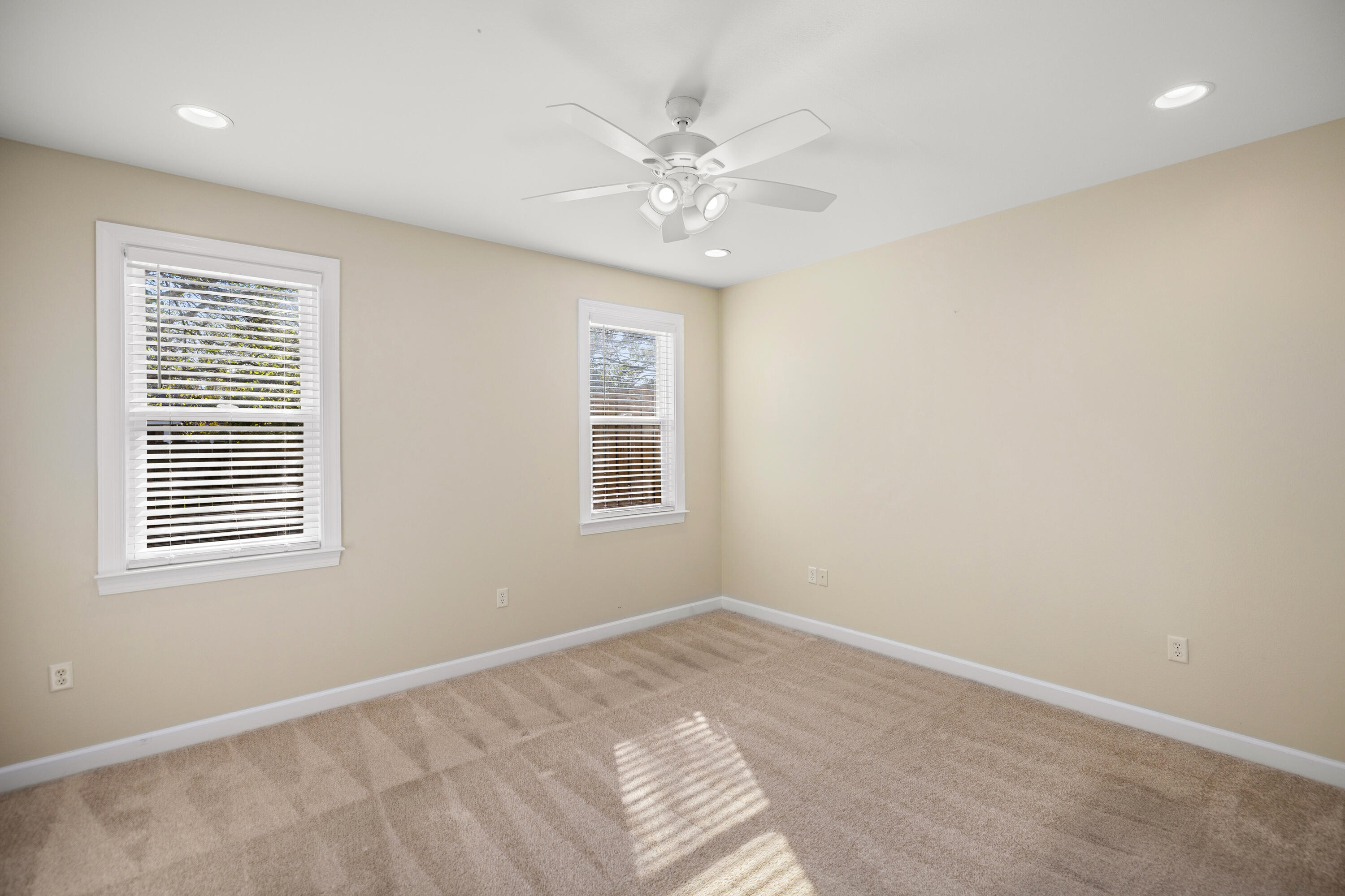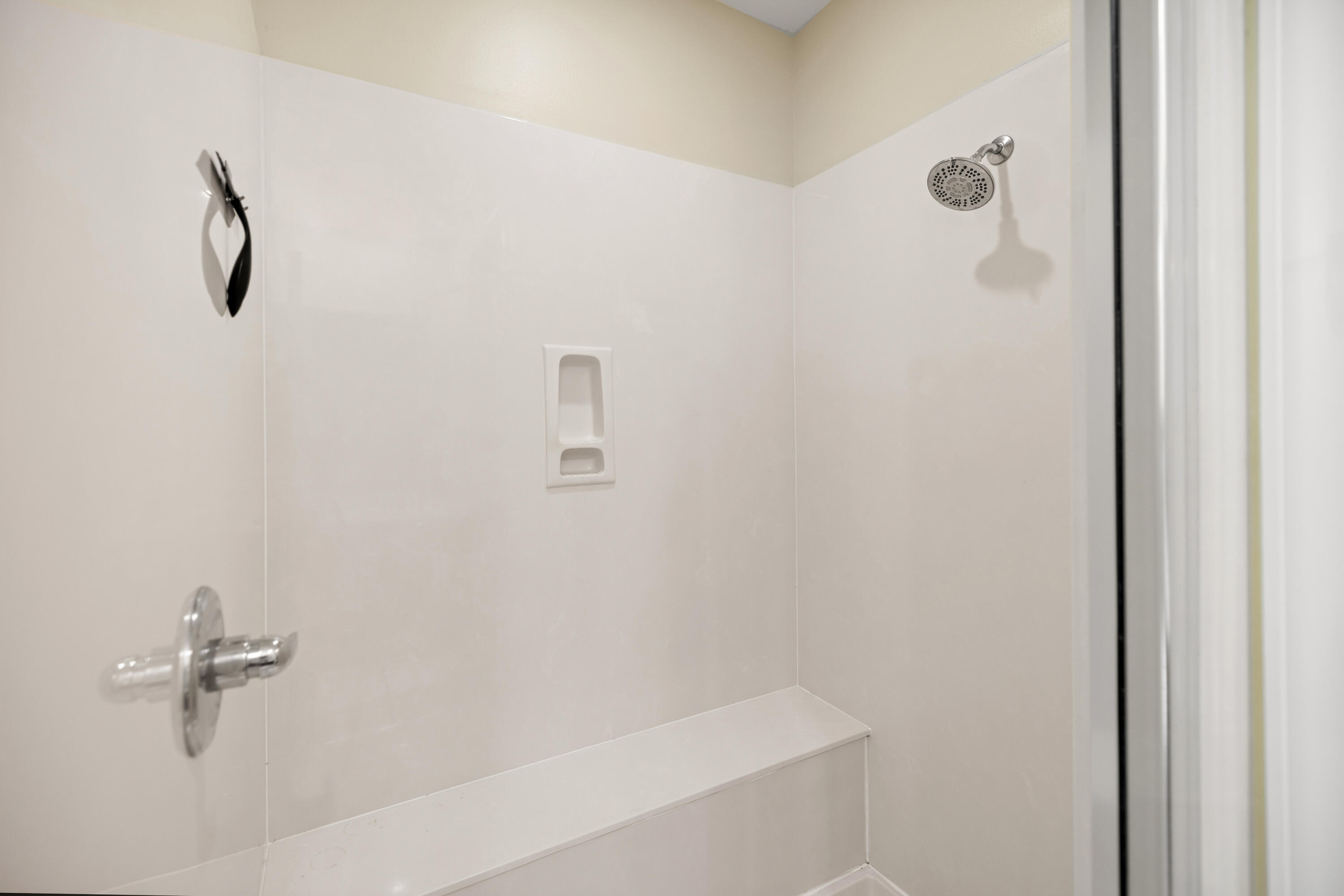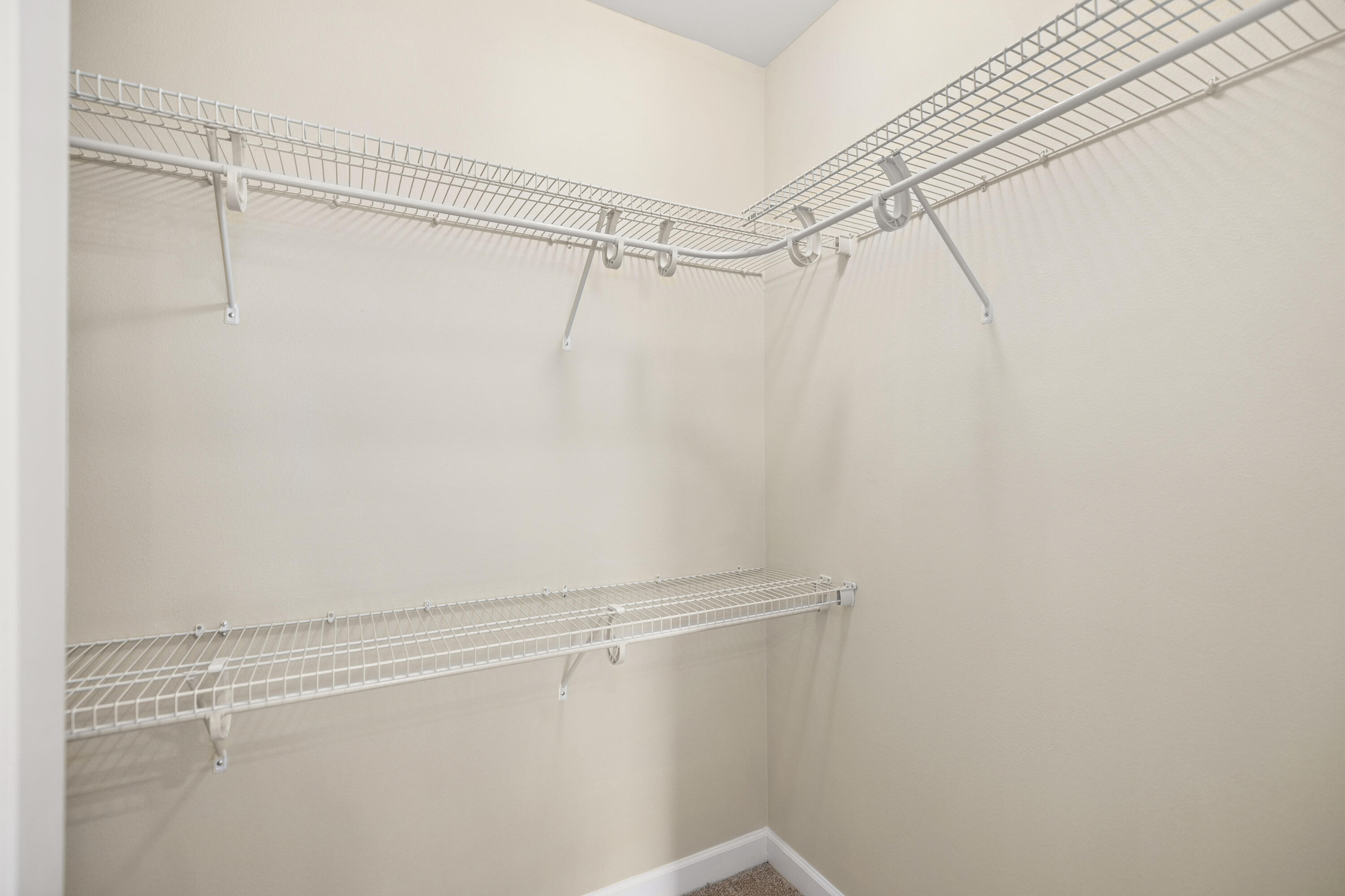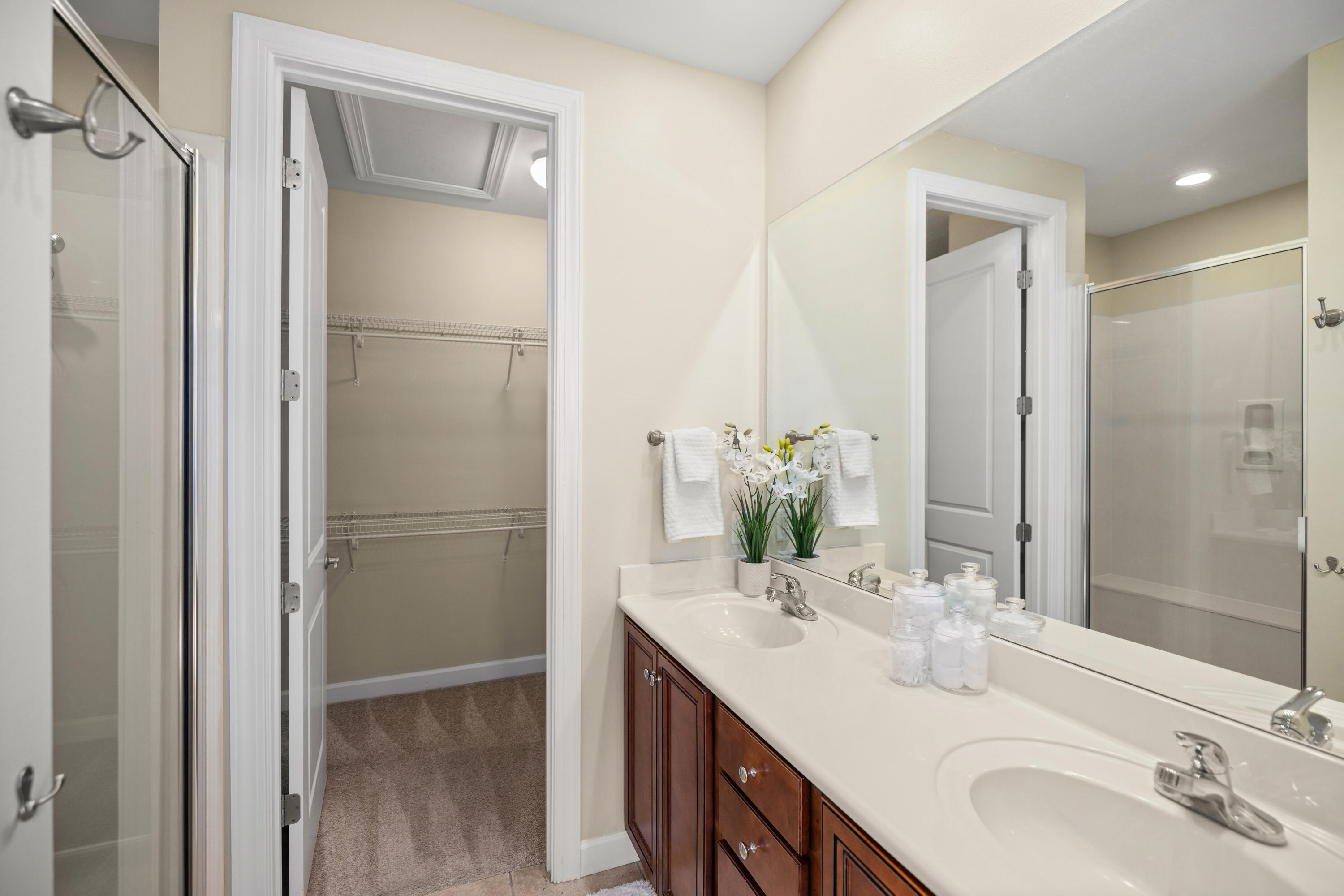 The first-floor primary suite includes a comfortable bedroom layout along with a well-appointed bathroom featuring a double vanity and a spacious walk-in closet.