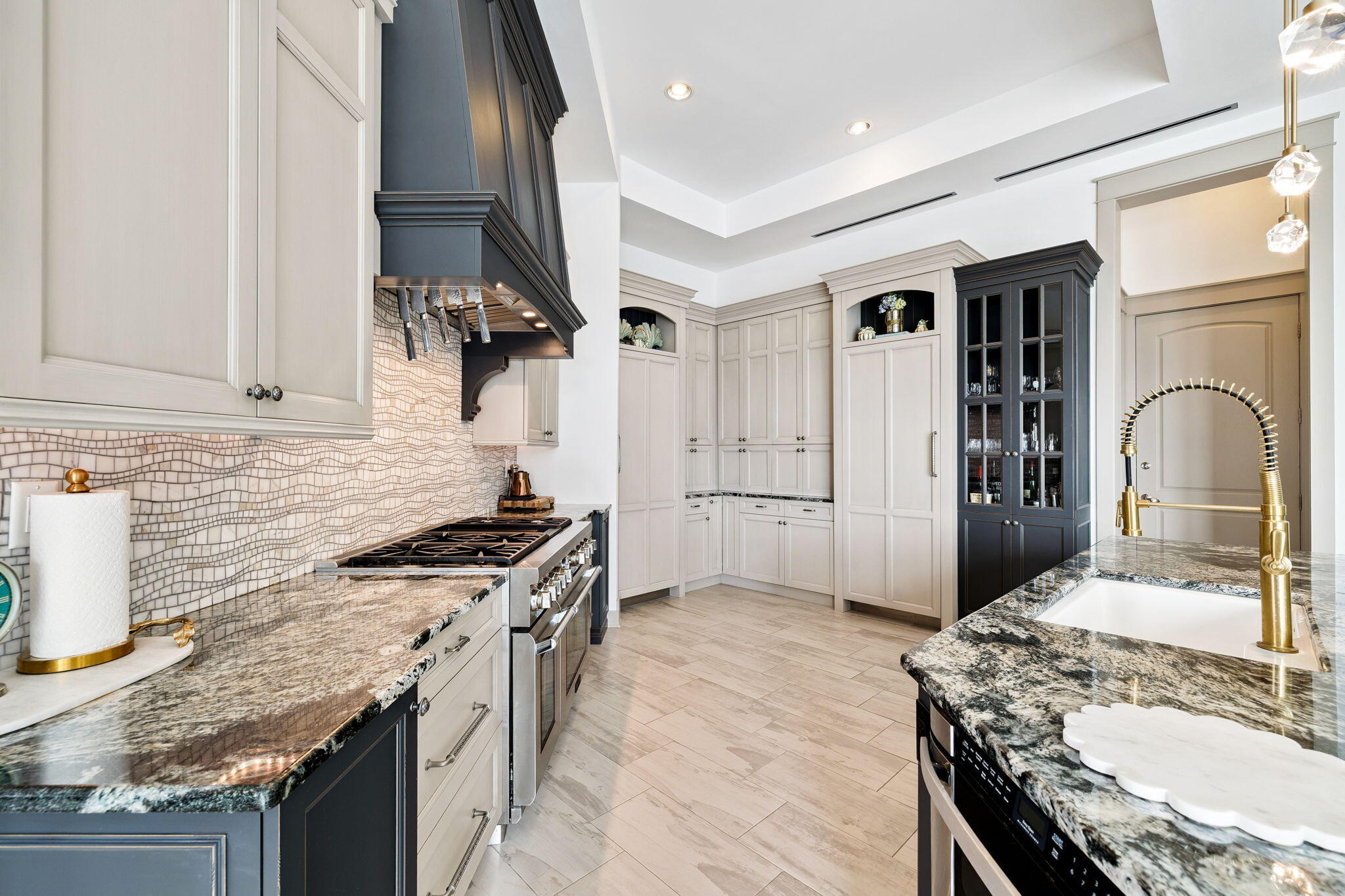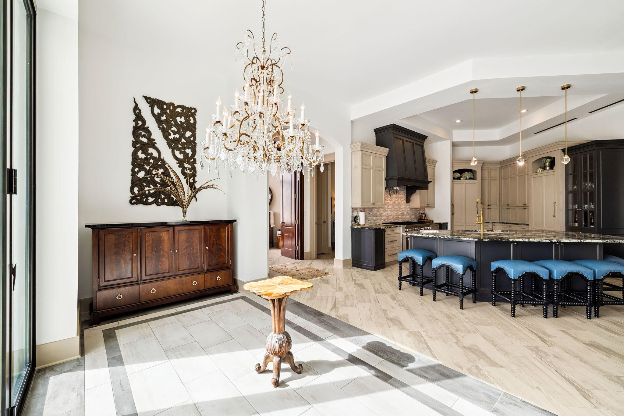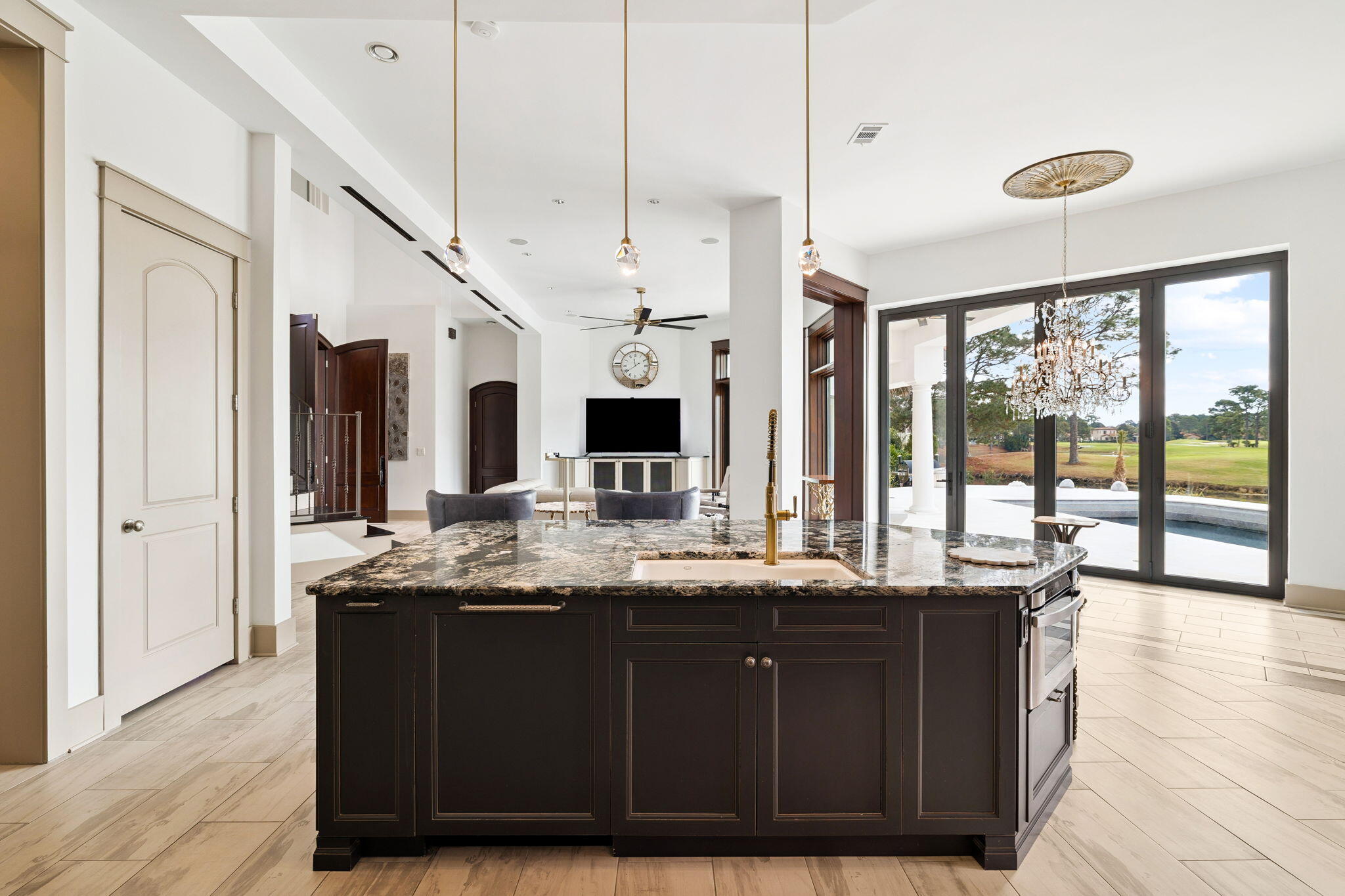 The main area of the home unfolds in an open-concept design that beautifully integrates the kitchen, living room, and dining or flex space. The chef-inspired kitchen blends innovation with artistry. High-end Thermador appliances, including a gas range with griddle and separate fridge and freezer towers, deliver professional-grade performance while paneled appliances and accordion counter-top cabinets maintain a sleek aesthetic. Striking blue marine granite counters, complemented by golden finishes and an intricate backsplash, create a refined coastal sensibility. Additional features include a large pantry with wine fridge, generous storage with thoughtful solutions such as hidden under-island cabinetry, and exquisite Italian chandeliers that elevate the space with graceful sophistication.