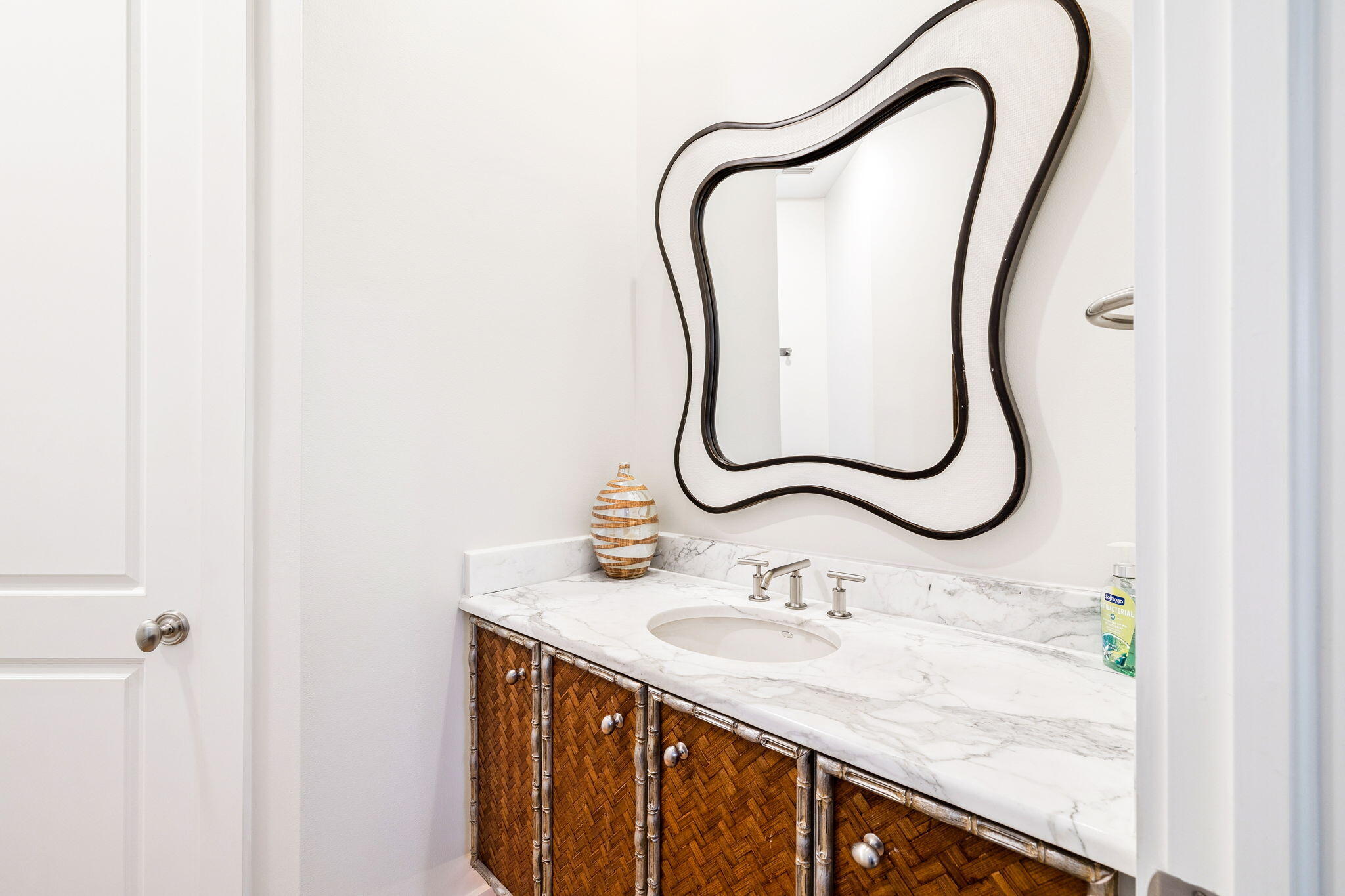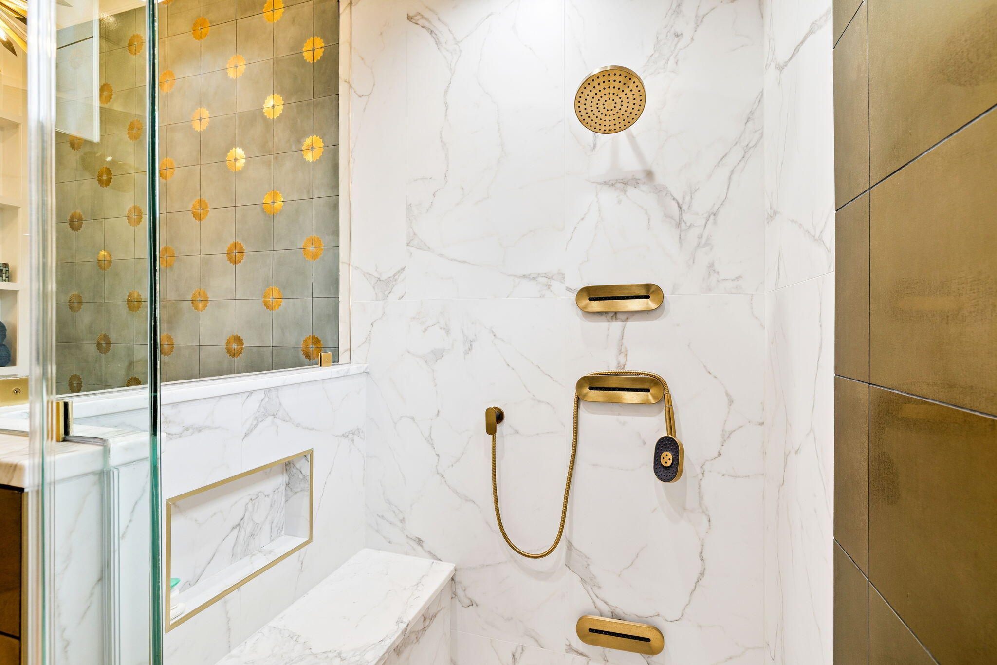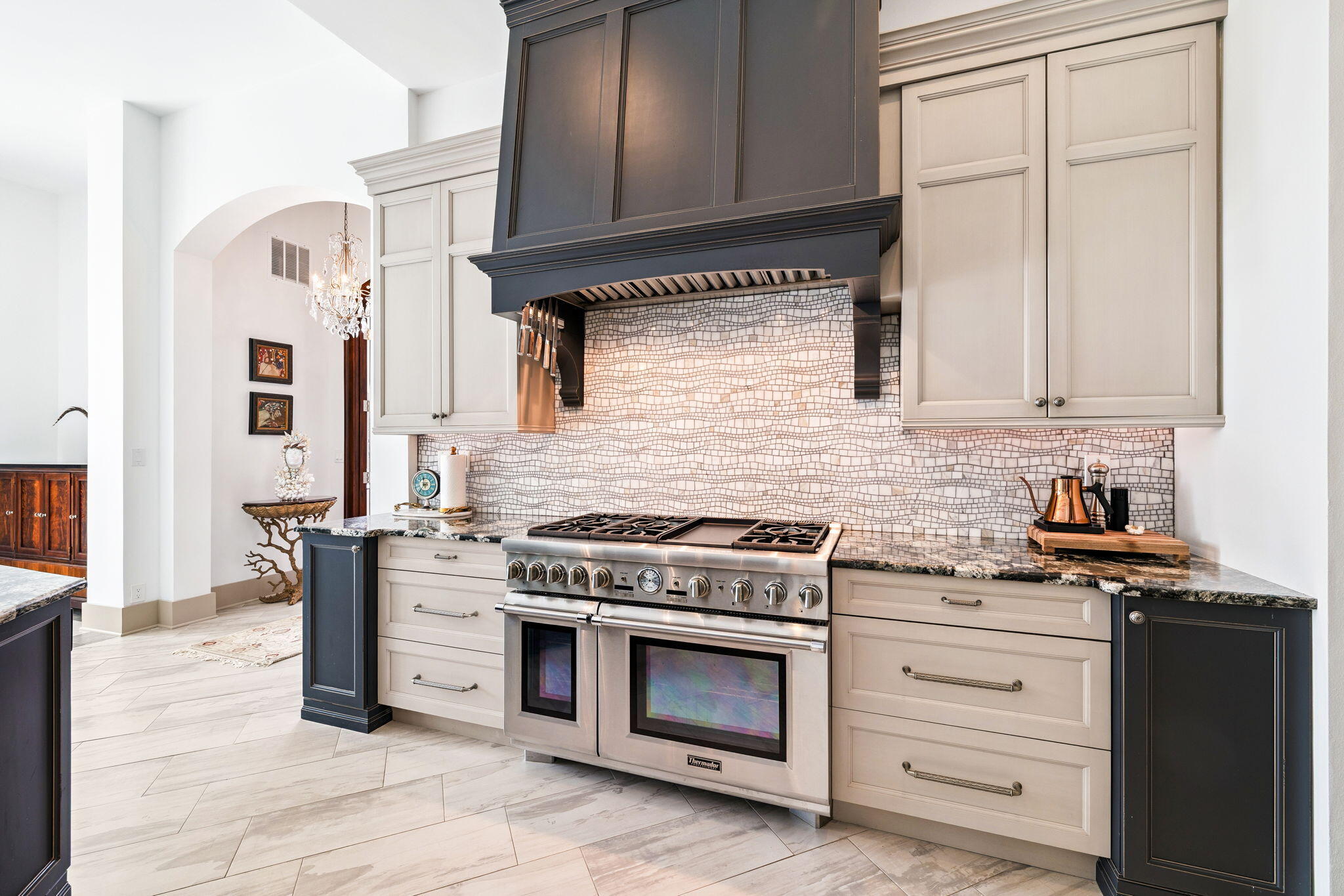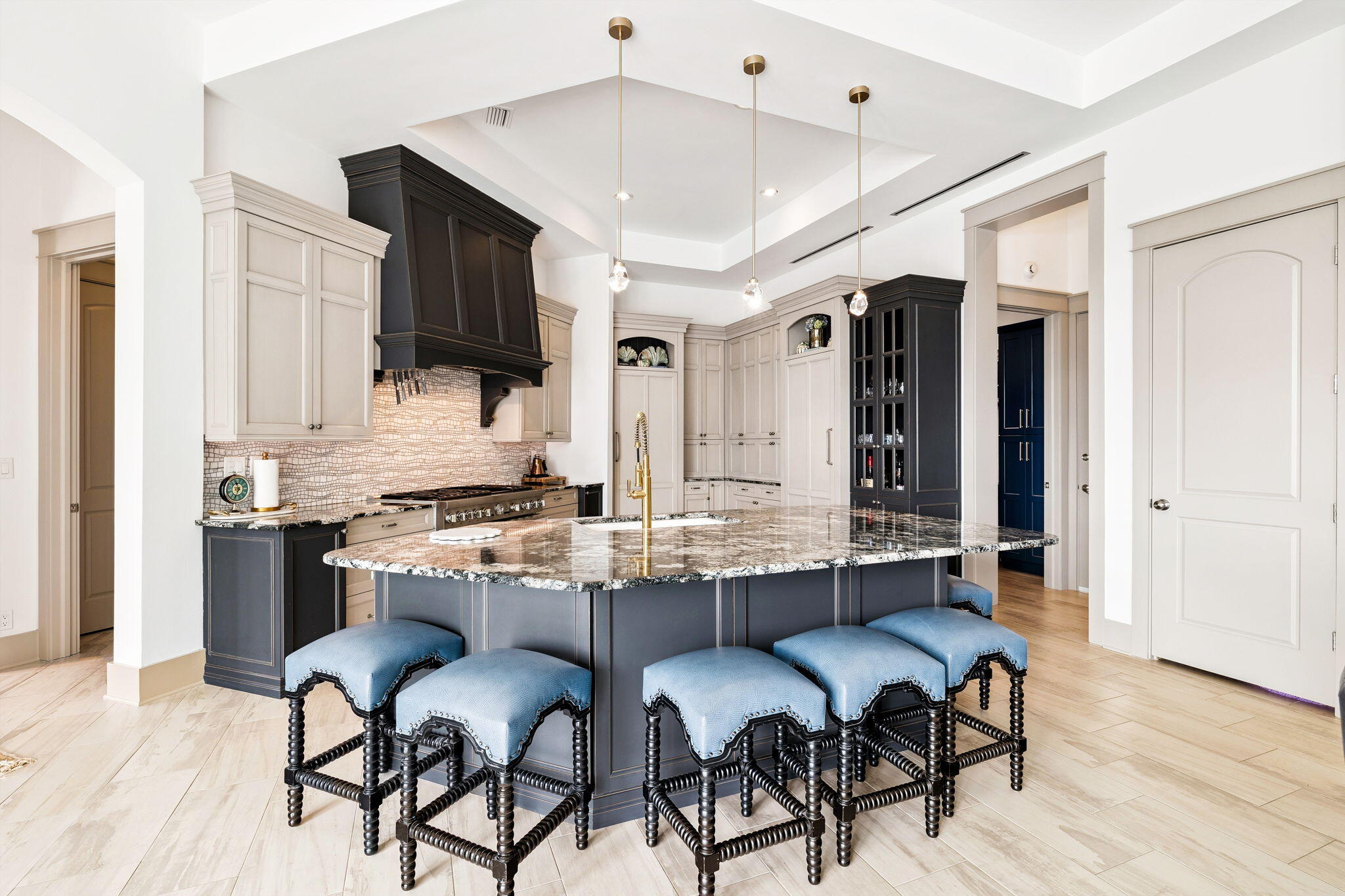 The main area of the home unfolds in an open-concept design that beautifully integrates the kitchen, living room, and dining or flex space. The chef-inspired kitchen blends innovation with artistry. High-end Thermador appliances, including a gas range with griddle and separate fridge and freezer towers, deliver professional-grade performance while paneled appliances and accordion counter-top cabinets maintain a sleek aesthetic. Striking blue marine granite counters, complemented by golden finishes and an intricate backsplash, create a refined coastal sensibility. Additional features include a large pantry with wine fridge, generous storage with thoughtful solutions such as hidden under-island cabinetry, and exquisite Italian chandeliers that elevate the space with graceful sophistication.