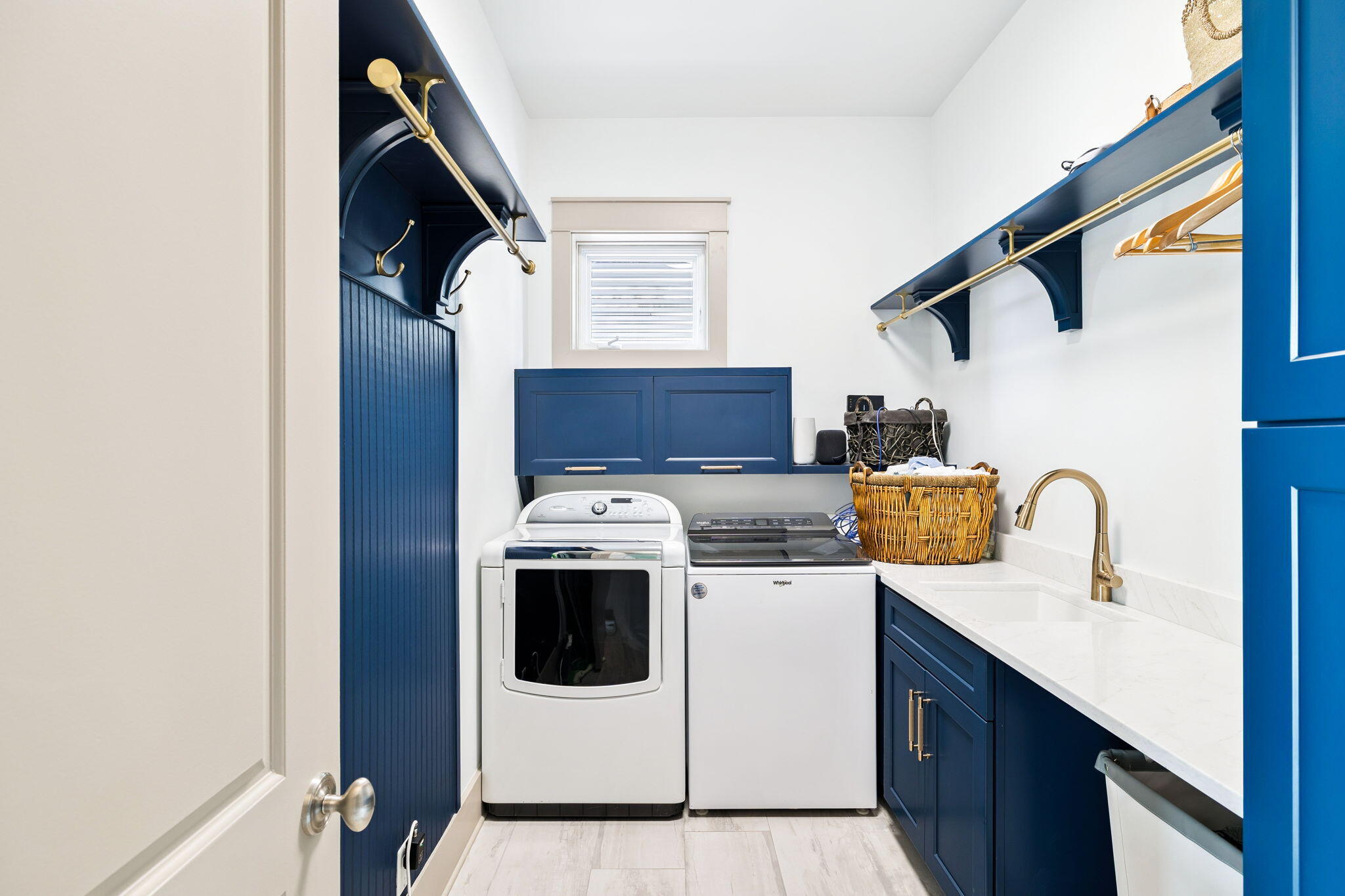 Back on the main level, a thoughtfully designed laundry room offers abundant custom cabinetry, built-in organization, and plenty of room to keep life running smoothly. The oversized two-car garage has been newly refinished with a beautiful and durable epoxy floor, upgraded silent garage doors, and additional storage enhancements that combine function with convenience.