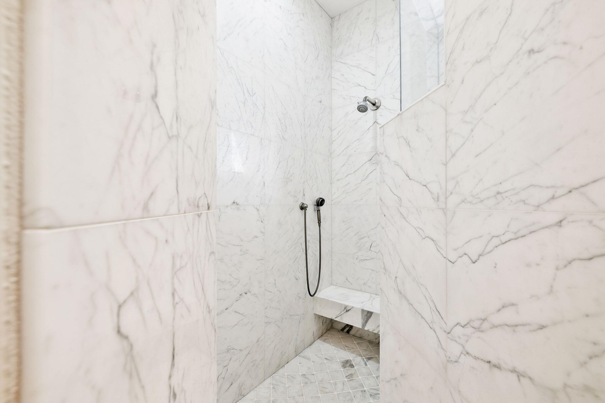 The expansive primary suite is a peaceful sanctuary tucked away on the main level. Sweeping windows frame the view and are fitted with electronic blinds to instantly transform the room from sun-drenched to full blackout. The spa-inspired en suite bath exudes luxury with a quartzite soaking tub featuring integrated under-lighting, an oversized steam shower, custom cabinetry, and hidden storage elements that balance beauty with function. His-and-hers walk-in closets add to the suite's sense of ease, offering ample space and organization to support a relaxed and effortless daily routine.