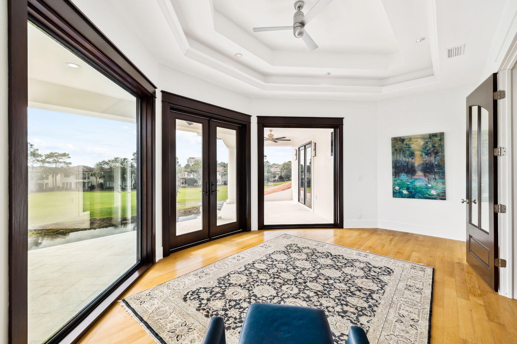 Experience Sandestin at its finest in this beautifully reimagined coastal retreat, set on one of the most spectacular lake and golf course vistas in all of the resort. Thoughtfully renovated from top to bottom, this home blends high-end design, modern comforts, and effortless livability, set within the serene, rental-restricted enclave of Del Mar. With a front-row lakeside seat to the number four fairway of the Baytowne Golf Course and sweeping views that stretch across holes two, three, and beyond, this private oasis offers a rare combination of beauty, tranquility, and convenience, just a quick golf cart ride from the world's most beautiful beaches, Grand Boulevard, Baytowne Wharf, dining, shopping, and everyday essentials.A newly added entry foyer with soaring ceilings welcomes you home and immediately sets the tone for the elevated finishes found throughout. Step inside to an open, light-filled living space anchored by brand-new floor-to-ceiling ten-by-twelve Euro doors that fully accordion open, creating a seamless indoor and outdoor connection and framing postcard-worthy views of the pool, lake, and golf course beyond. Petrified wood porcelain tile floors flow throughout this space, providing a sophisticated foundation for the home's serene palette of blues, golds, and natural tones.
