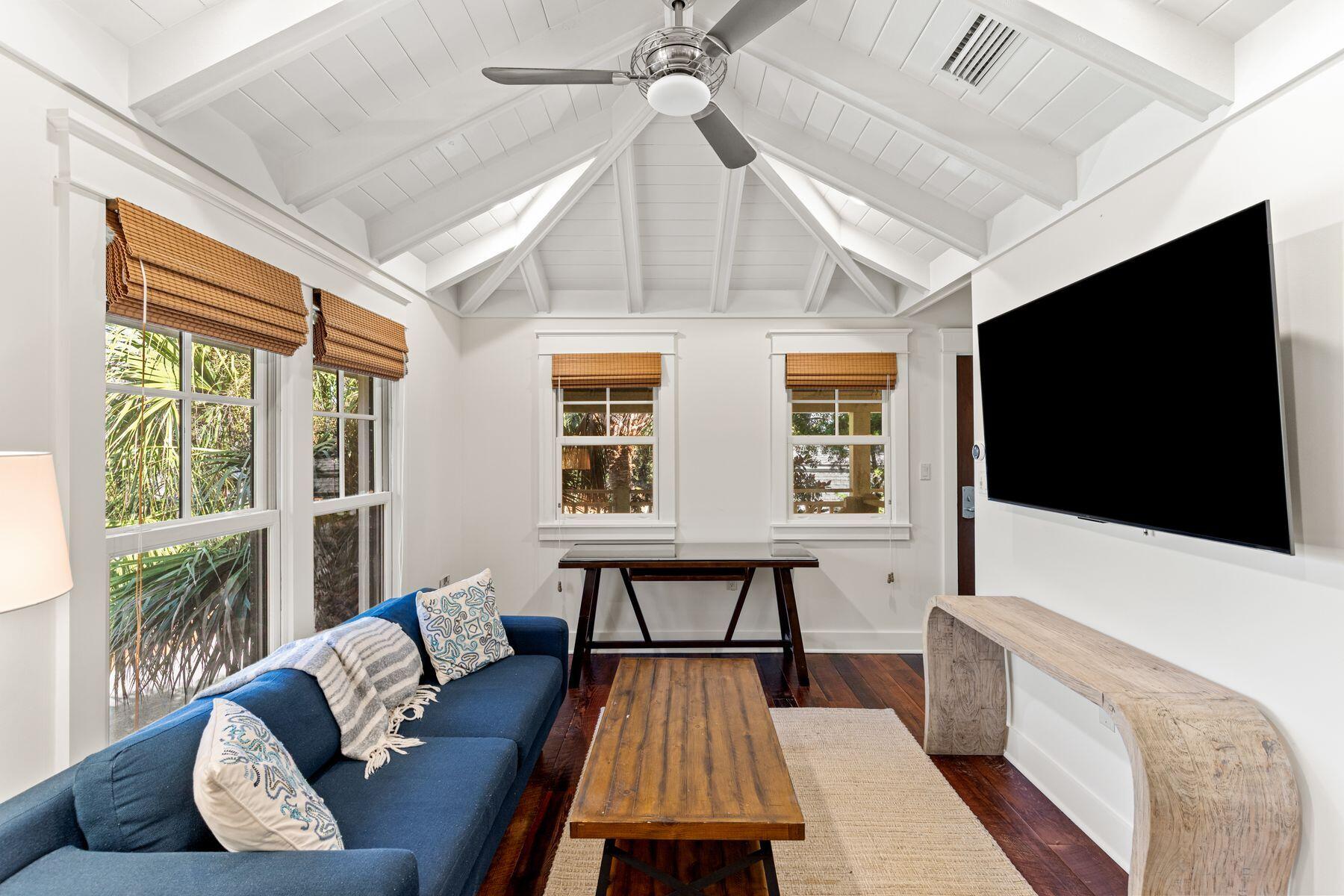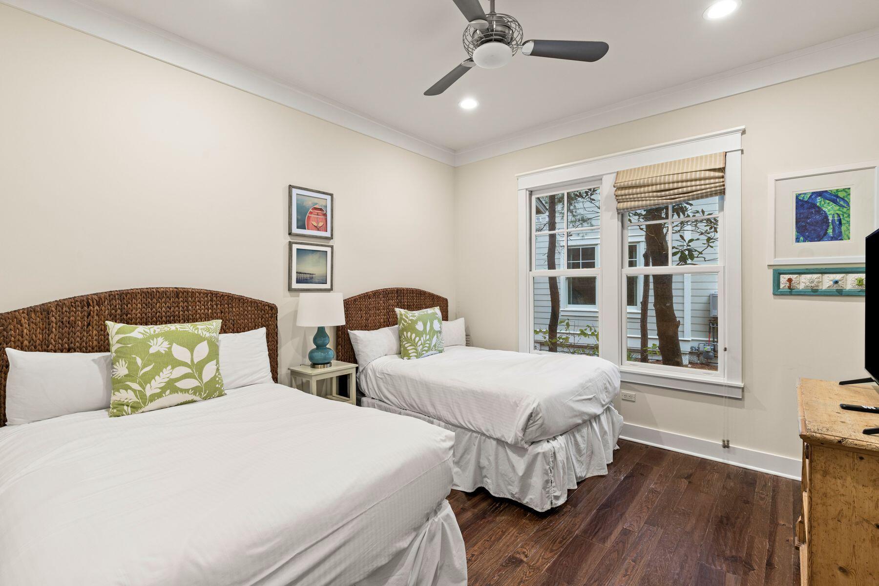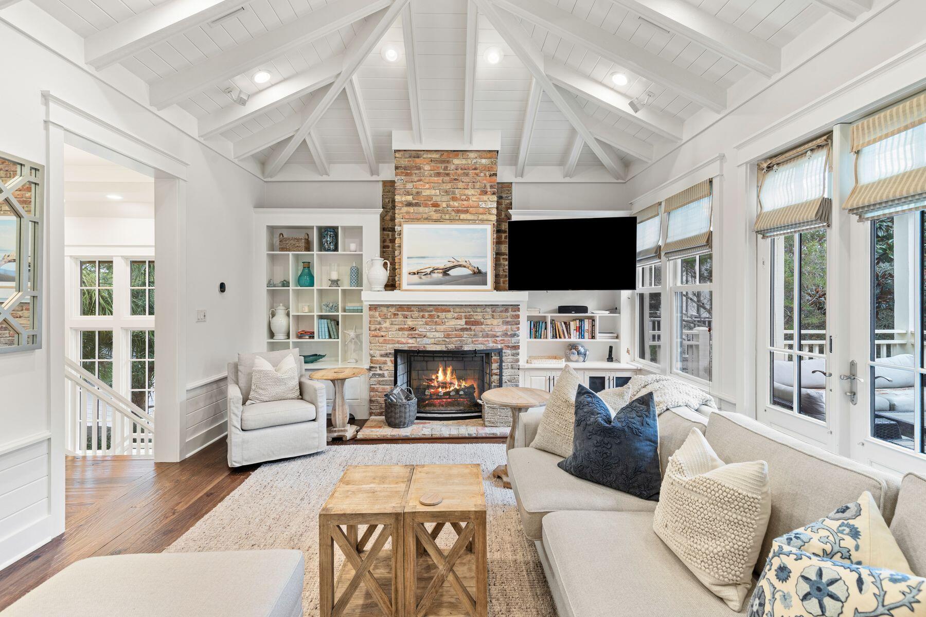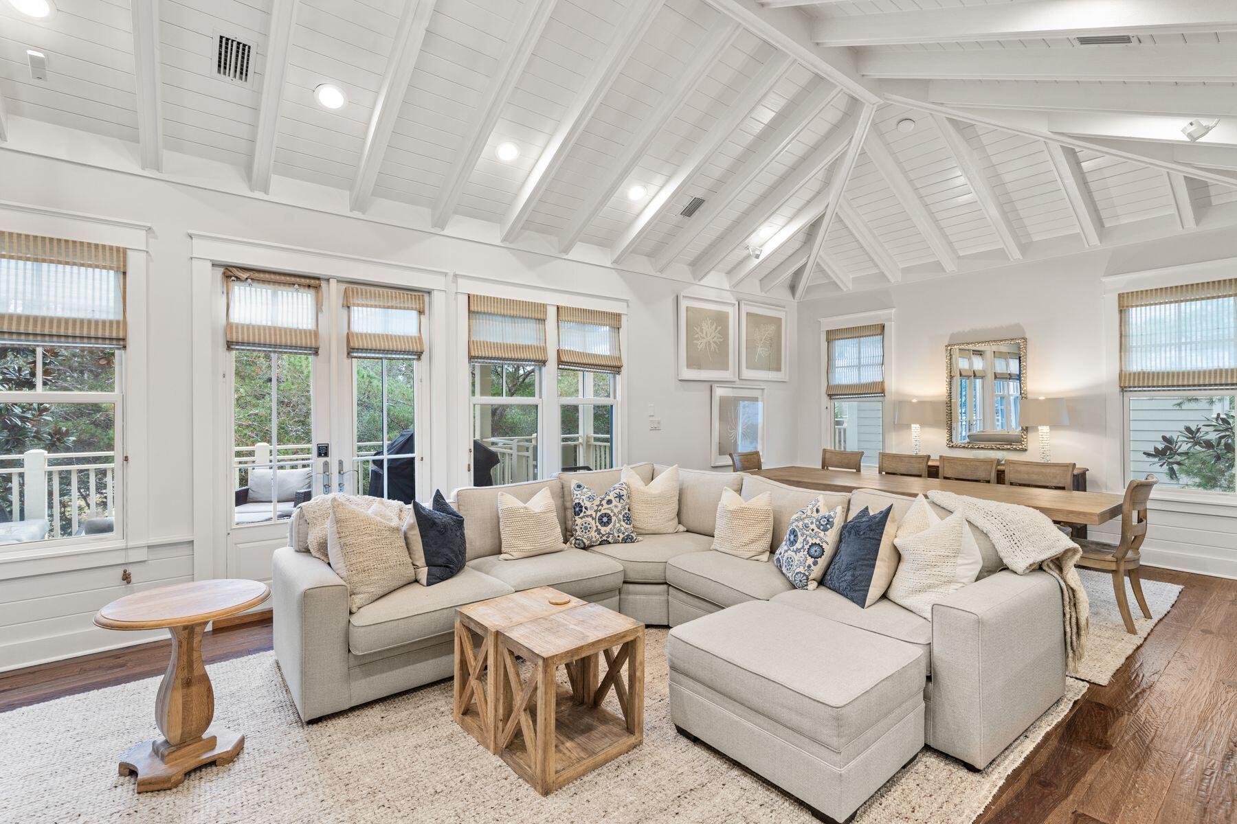 Just moments from the boardwalk and set in a remarkably private pocket of WaterSound Beach, this refined coastal retreat pairs serene dune and lake vistas with immediate access to community amenities. The setting is exceptional, framed by manicured green space at the rear, a pond across the street, and permanent views of Camp Creek Lake meeting the gulf's emerald horizon. Steps from the pool, outdoor lounge, and beach walkover, the home feels woven into its natural surroundings while offering the comforts of a full-time residence.Crafted with classic architectural details inside and out, the four-bedroom main home and detached one-bedroom carriage house create a rare, versatile offering. Two primary suites in the main home accommodate multigenerational living, while the carriage house complete with a full kitchen and private bath welcomes guests with its own sense of retreat. Throughout the residence, rich hardwood floors, vaulted ceilings, and thoughtful built-ins elevate every space.