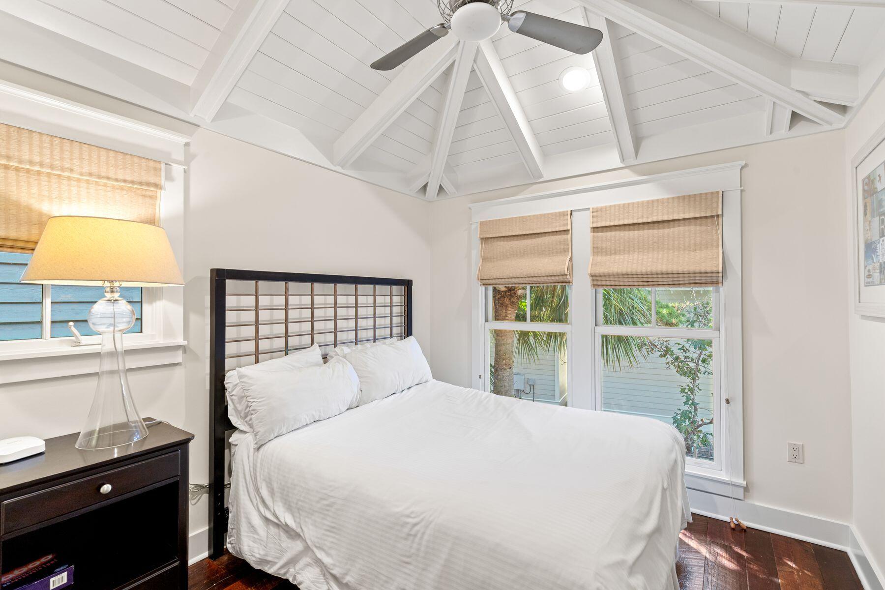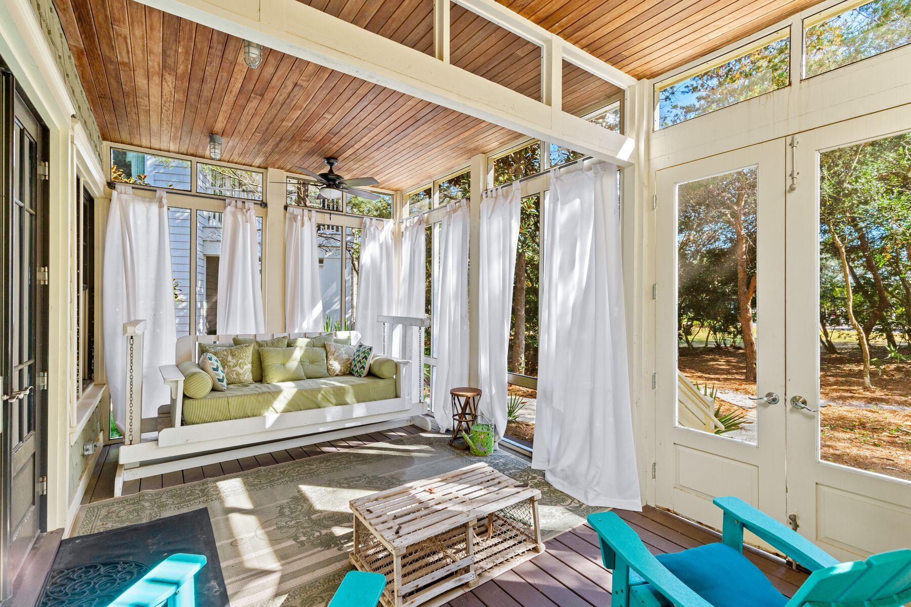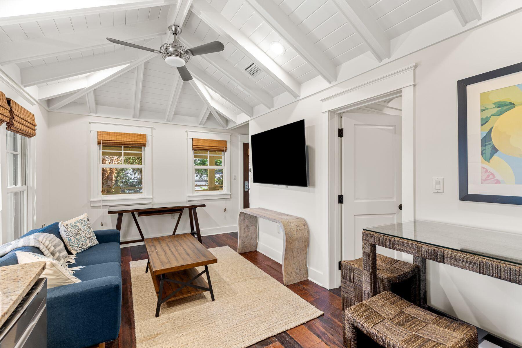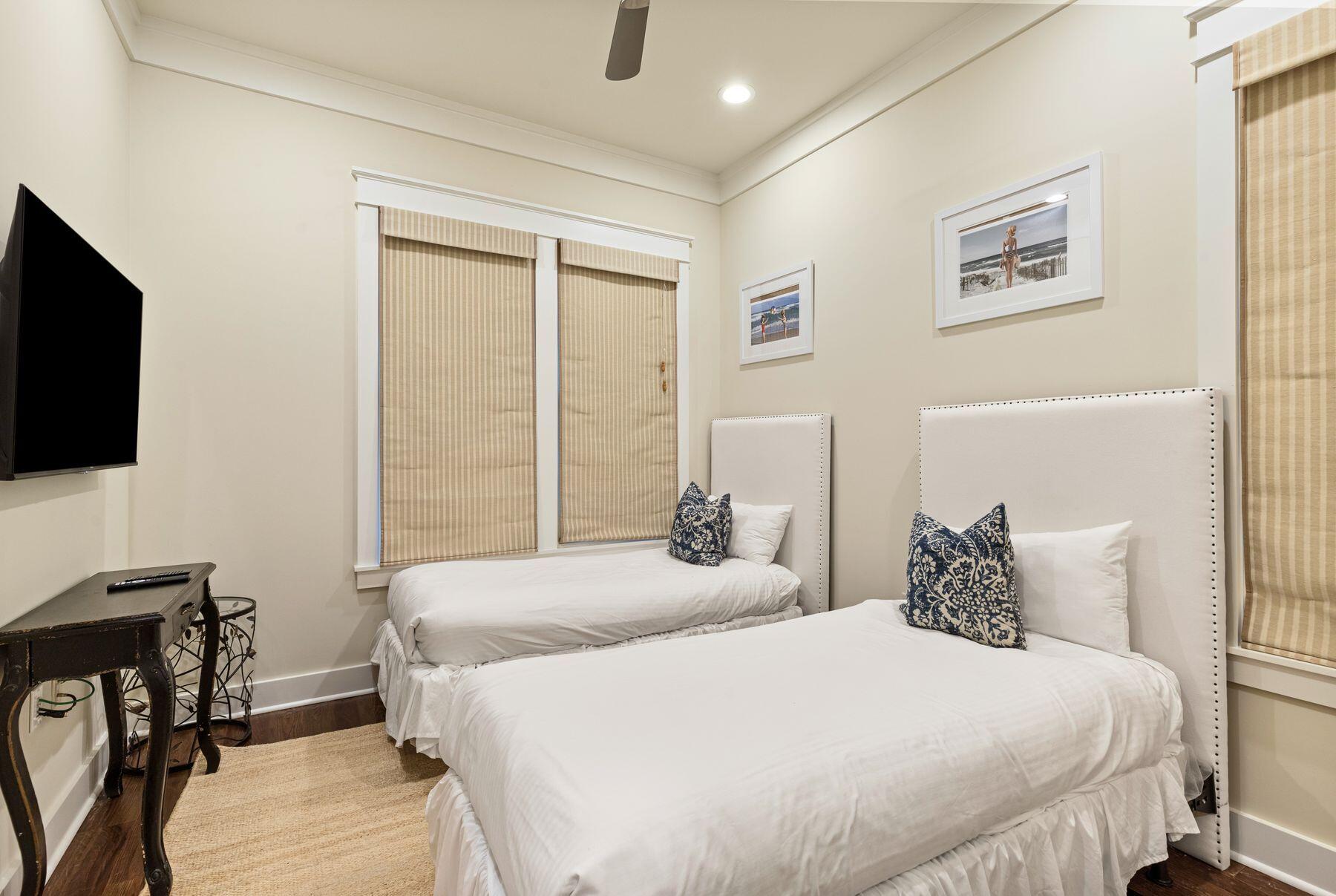 Just moments from the boardwalk and set in a remarkably private pocket of WaterSound Beach, this refined coastal retreat pairs serene dune and lake vistas with immediate access to community amenities. The setting is exceptional, framed by manicured green space at the rear, a pond across the street, and permanent views of Camp Creek Lake meeting the gulf's emerald horizon. Steps from the pool, outdoor lounge, and beach walkover, the home feels woven into its natural surroundings while offering the comforts of a full-time residence.Crafted with classic architectural details inside and out, the four-bedroom main home and detached one-bedroom carriage house create a rare, versatile offering. Two primary suites in the main home accommodate multigenerational living, while the carriage house complete with a full kitchen and private bath welcomes guests with its own sense of retreat. Throughout the residence, rich hardwood floors, vaulted ceilings, and thoughtful built-ins elevate every space.