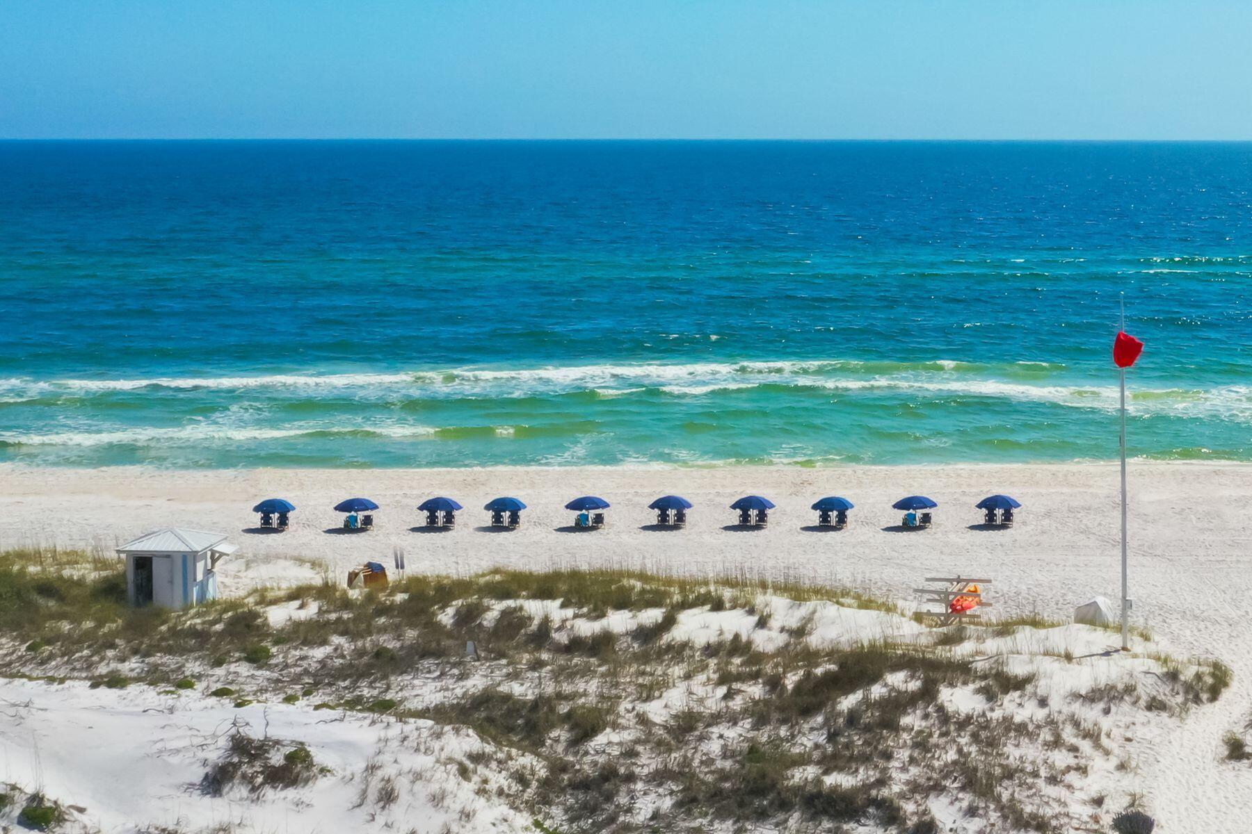 The upper-level great room rises beneath warm wood beams and opens to an expansive balcony where views stretch across dunes, lake, and gulf. A granite-clad kitchen with custom cabinetry, Viking appliances, and a breakfast bar anchors this gathering level, with a wet bar positioned nearby for effortless entertaining. A gas fireplace, recessed lighting, and coastal textures set a relaxed yet refined tone.
