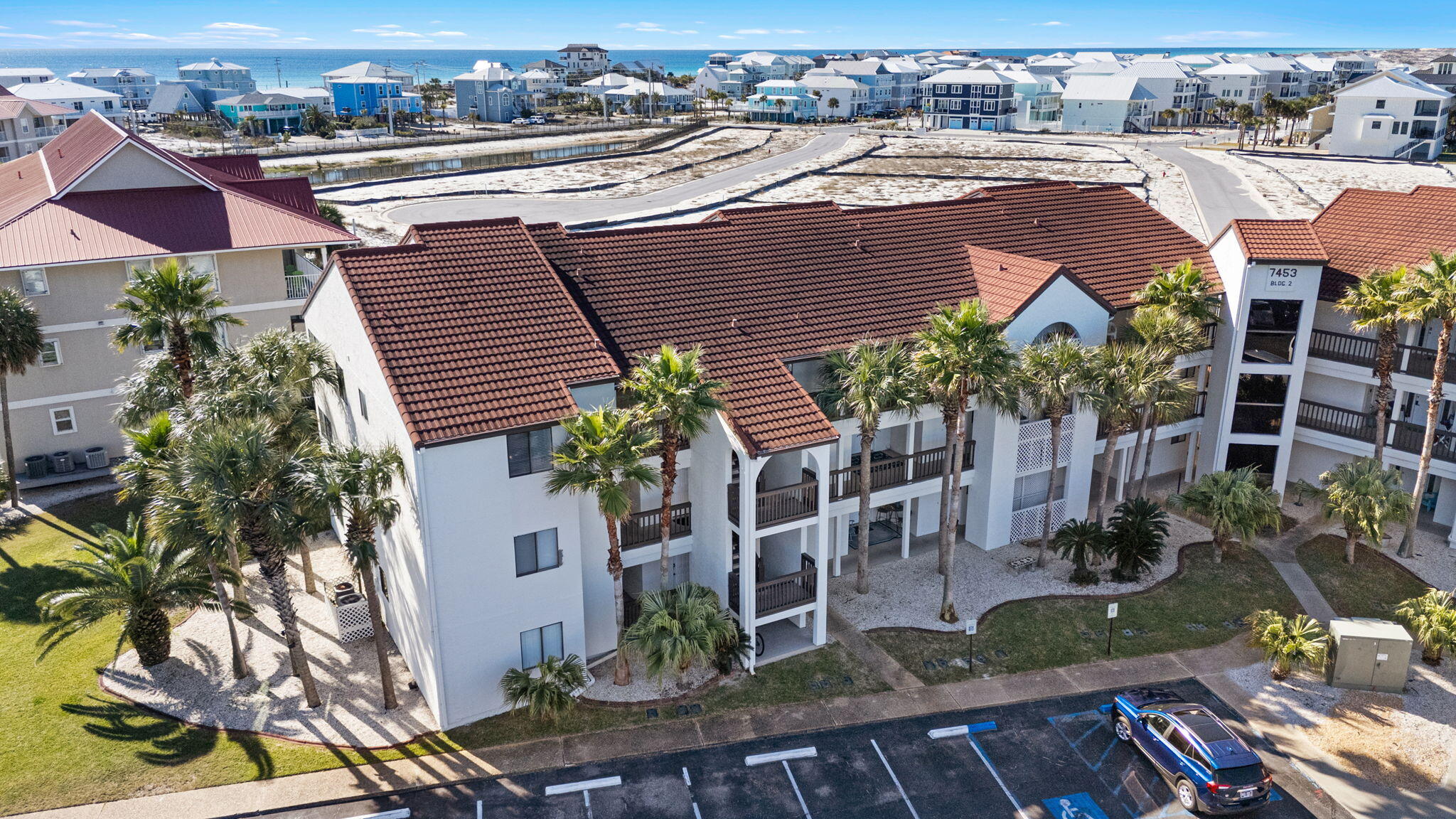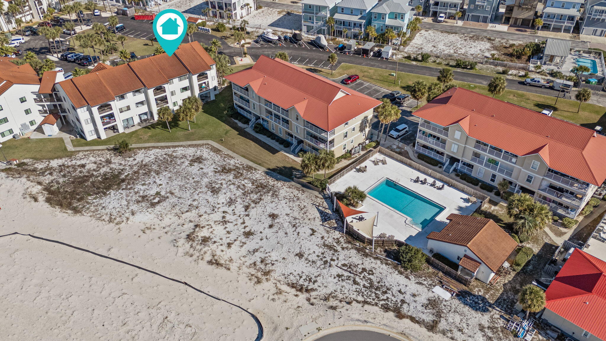Take the causeway to Navarre Beach. At the traffic light, turn right onto Gulf Blvd, head west 2.9 miles to Ohio Street, turn right, then turn left onto White Sands Blvd, turn right into Sunset Harbor